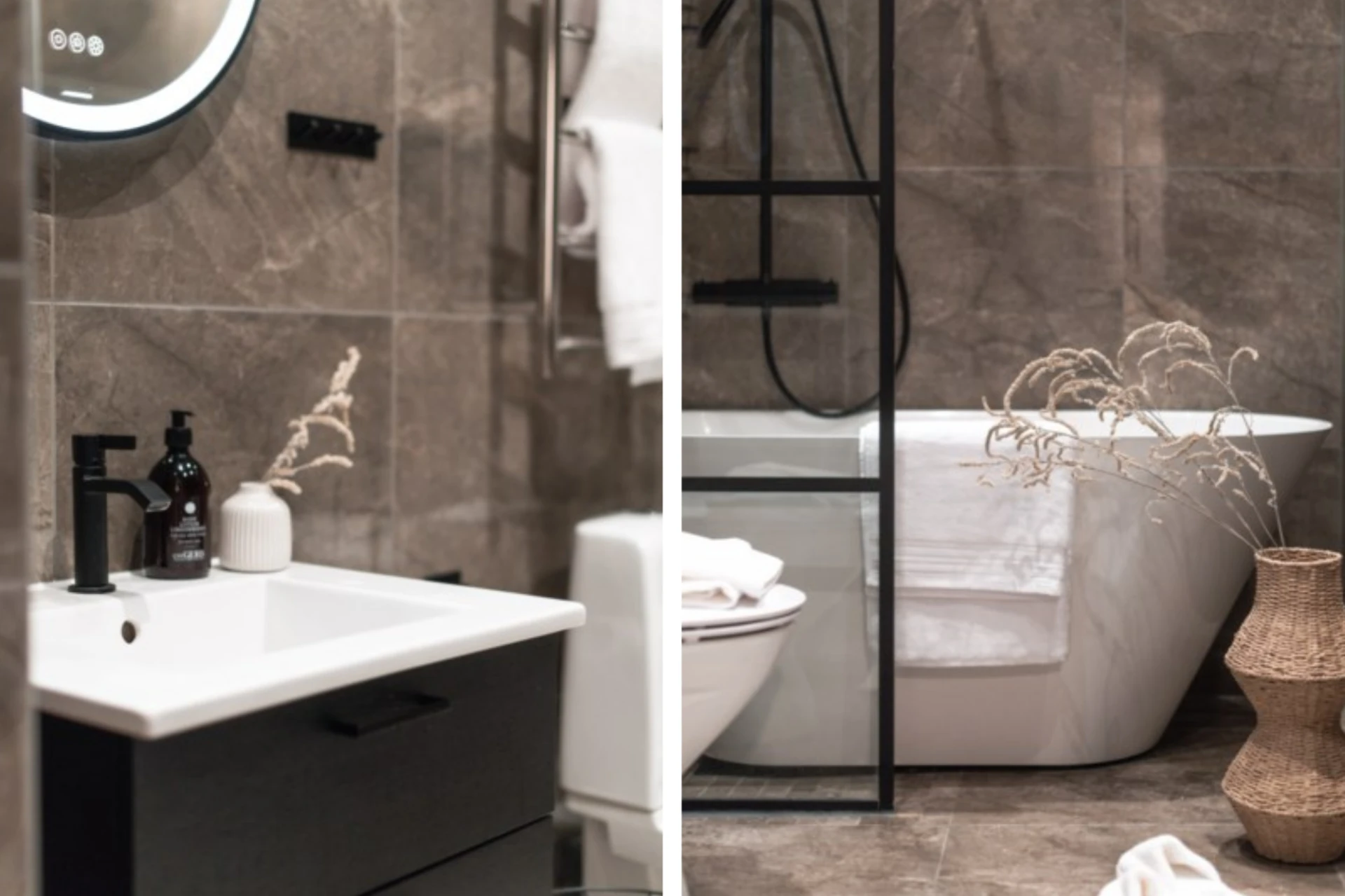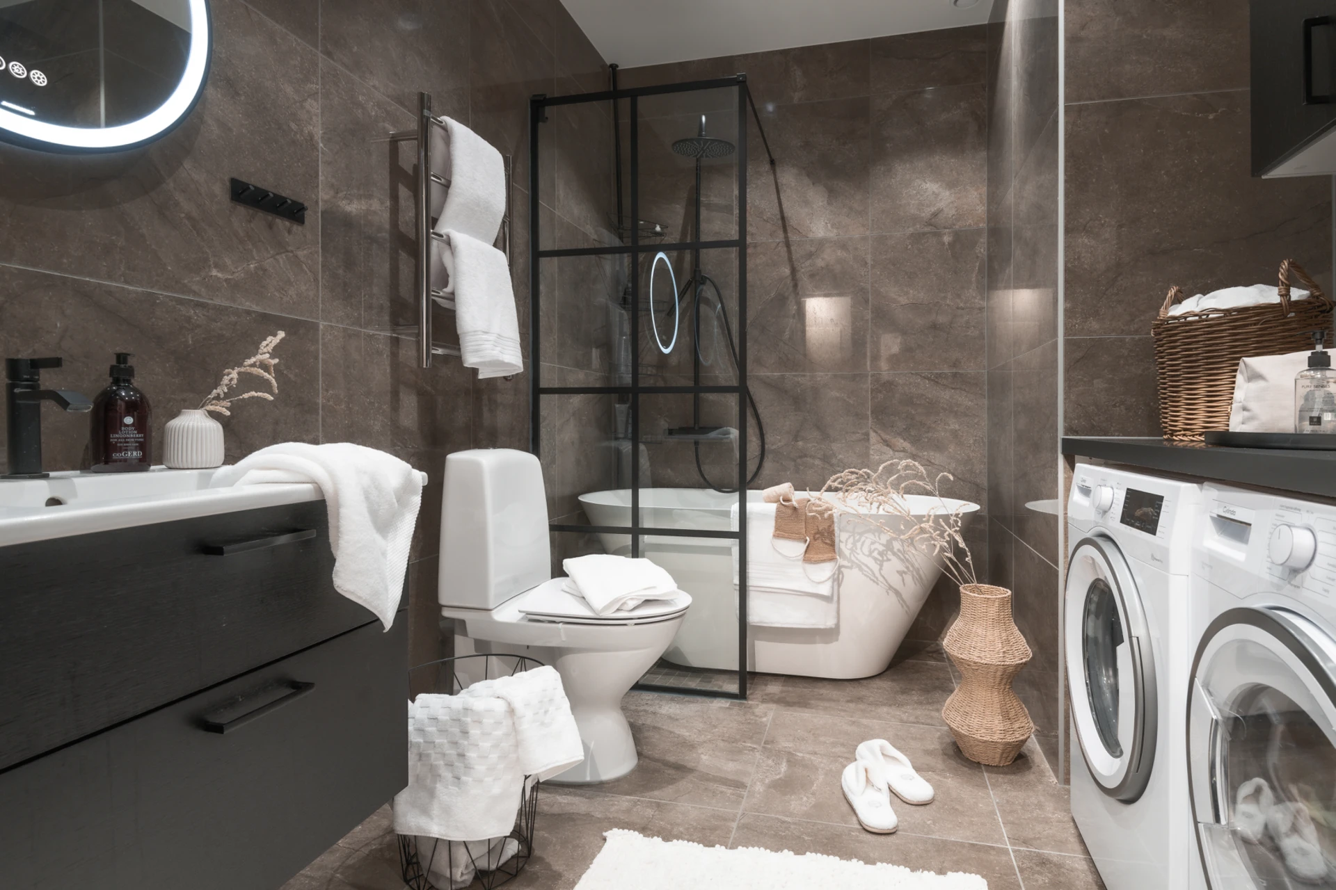 Badrummet är lyxigt i utformningen och är generöst tilltaget i yta. Här har man valt samma exklusiva blanka stenplattor som återfinns i hallen. Hörndusch/badkar med väggar i industriglas, wc, handfat med underskåp, belyst badrumsskåp och handdukstork. Badrummet har också en praktisk tvättavdelning med tvättmaskin och torktumlare, förvaringsskåp och arbetsbänk. Spotlights i taket skapar en lyxig atmosfär.