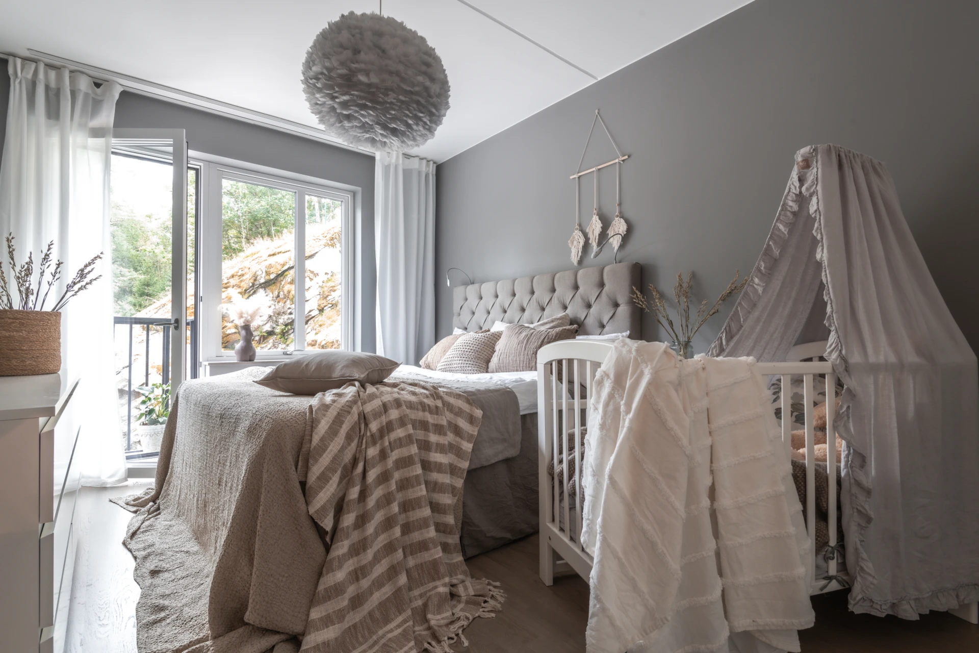 Master bedroom nås från hallen. Gott om förvaring erbjuds i en garderobsvägg som följer längst en hel vägg. Rummet rymmer med enkelhet en dubbelsäng med tillhörande sängbord. Från detta sovrum har man också öppning till en praktisk vädringsbalkong. Det andra sovrummet ligger bredvid Master Bedroom. Det kan med fördel användas som barnrum/gästrum. På golvet liksom i övriga rum finns ett stilfullt parkettgolv. I anslutning till dessa sovrum finns en uppskattad klädkammare/Walkin-closet, där skor och kläder har sin givna plats, både på stänger och i garderobssektioner.