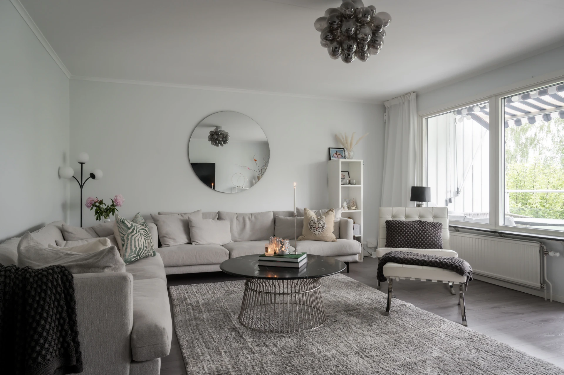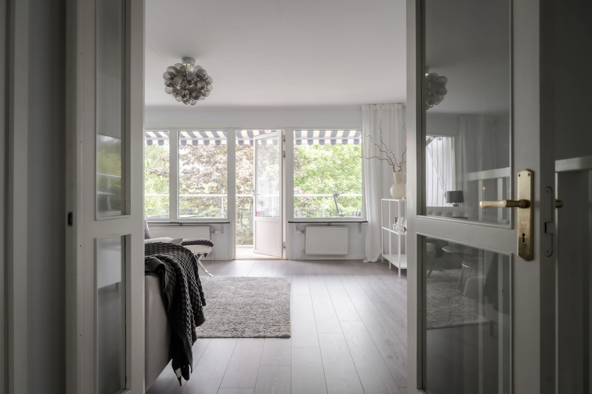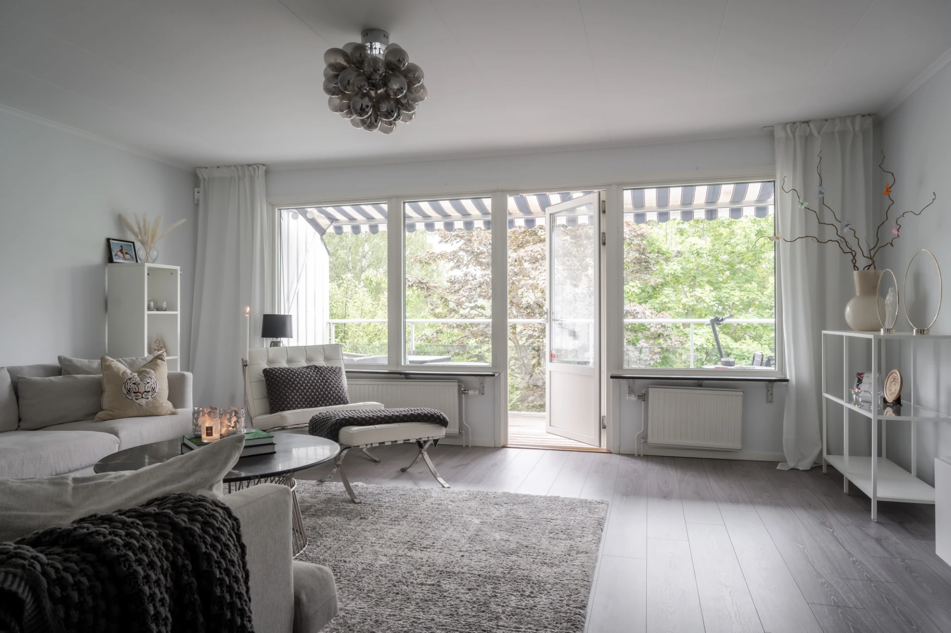 Ljust och trivsamt vardagsrum med stora fönsterpartier som släpper in gott om dagsljus och vetter ut mot balkongen. Här finns gott om plats för både soffgrupp och matsalsmöbler. Ljust laminatgolv och ljusa väggar skapar en varm och välkomnande känsla.