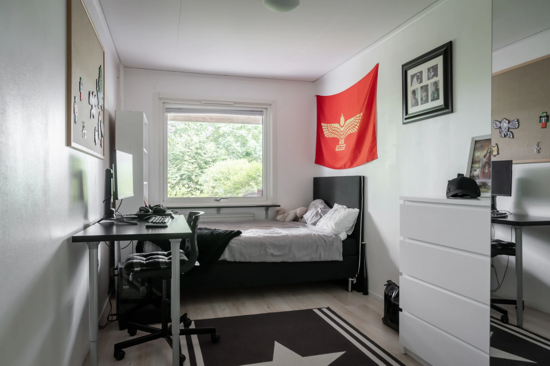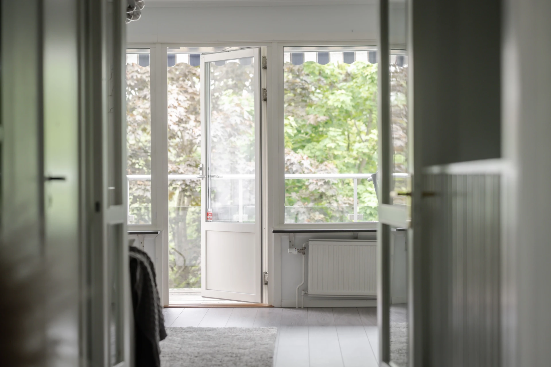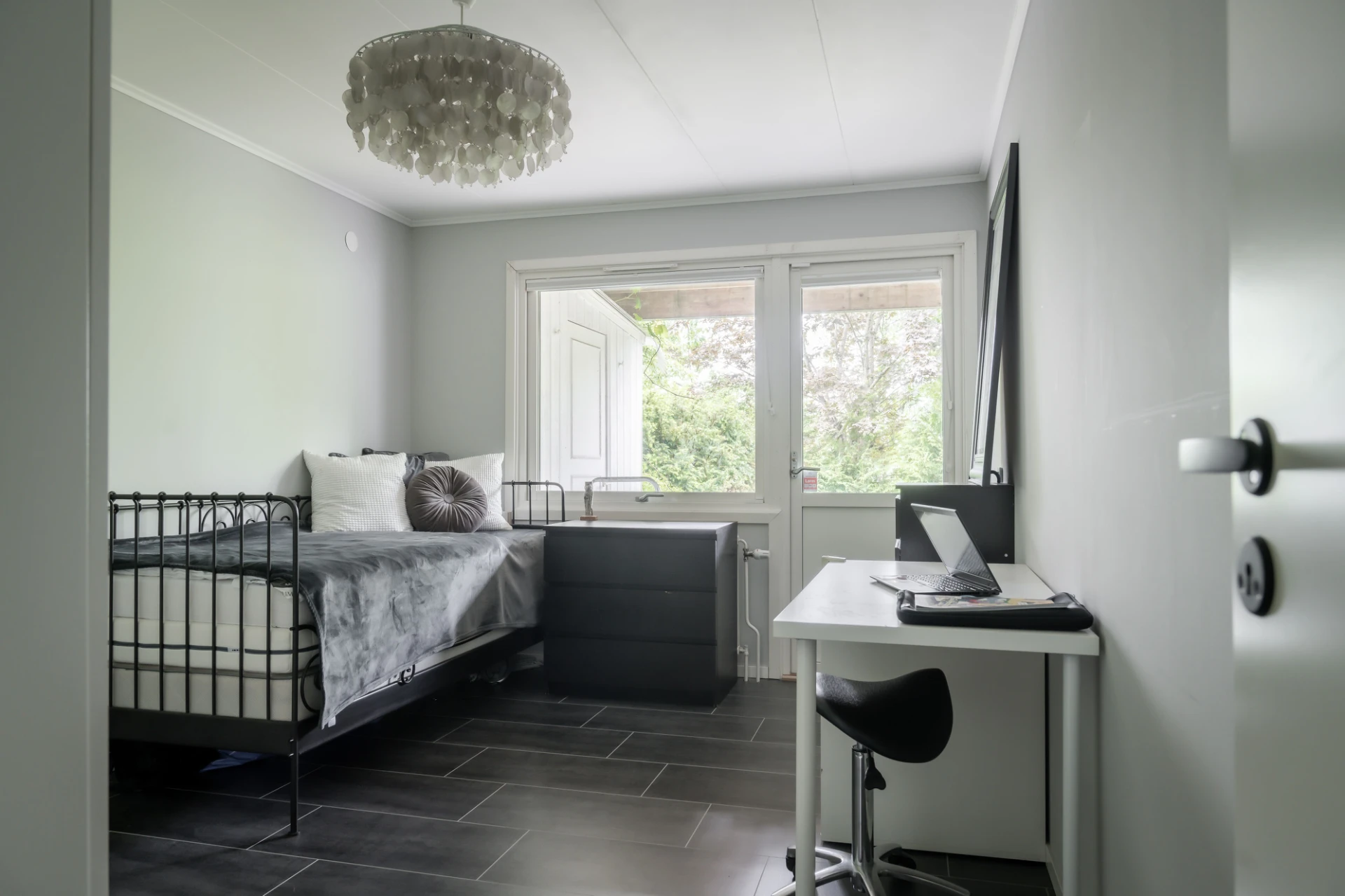 Sovrum 2: Mörk grå golv, ljusa väggar, fyra garderober och utgång till baksidan.