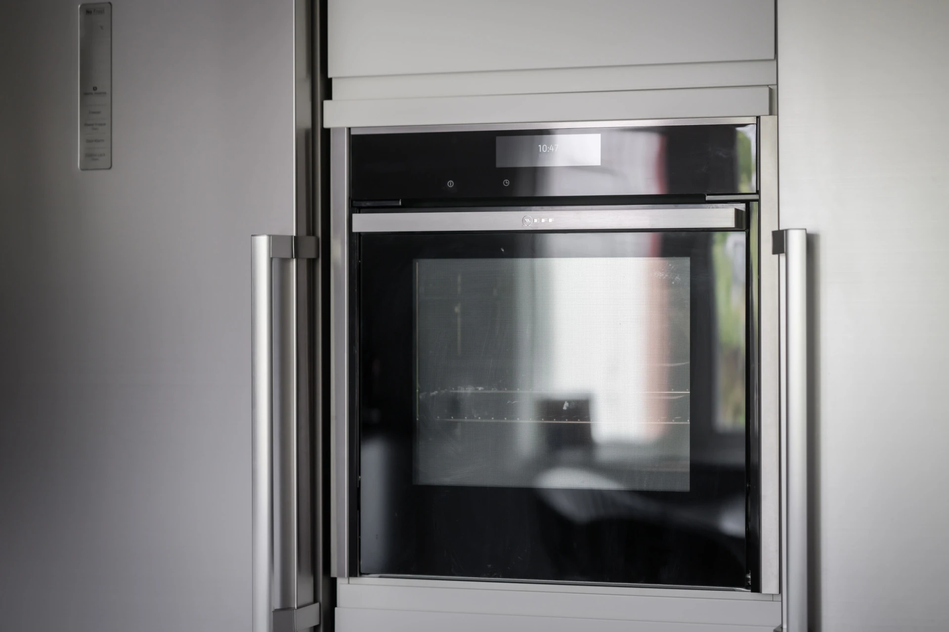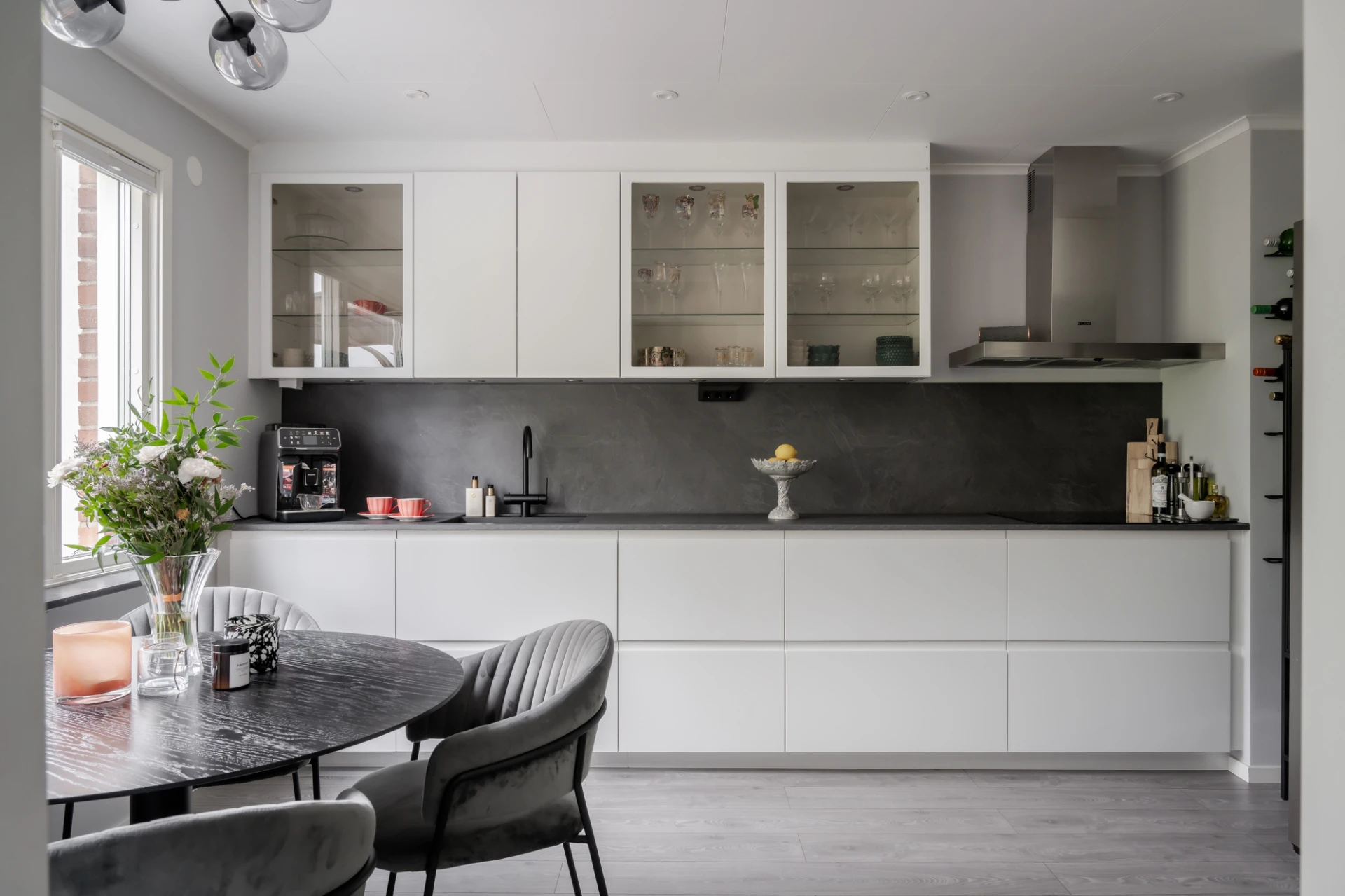Ljust och modernt kök med släta ljusa köksluckor samt stilrena vitrinskåp med integrerade spotlights. Under överskåpen finns infälld belysning som ger en behaglig arbetsbelysning. Köket har en tunn, mörk bänkskiva som snyggt kontrasterar mot det matchande stänkskyddet. På golvet ligger ett ljust laminatgolv och väggarna är målade i ljusa toner. Taket pryds av infällda spotlights. Plats finns för matbord. Vitvarorna består av kyl, frys, diskmaskin och spis.