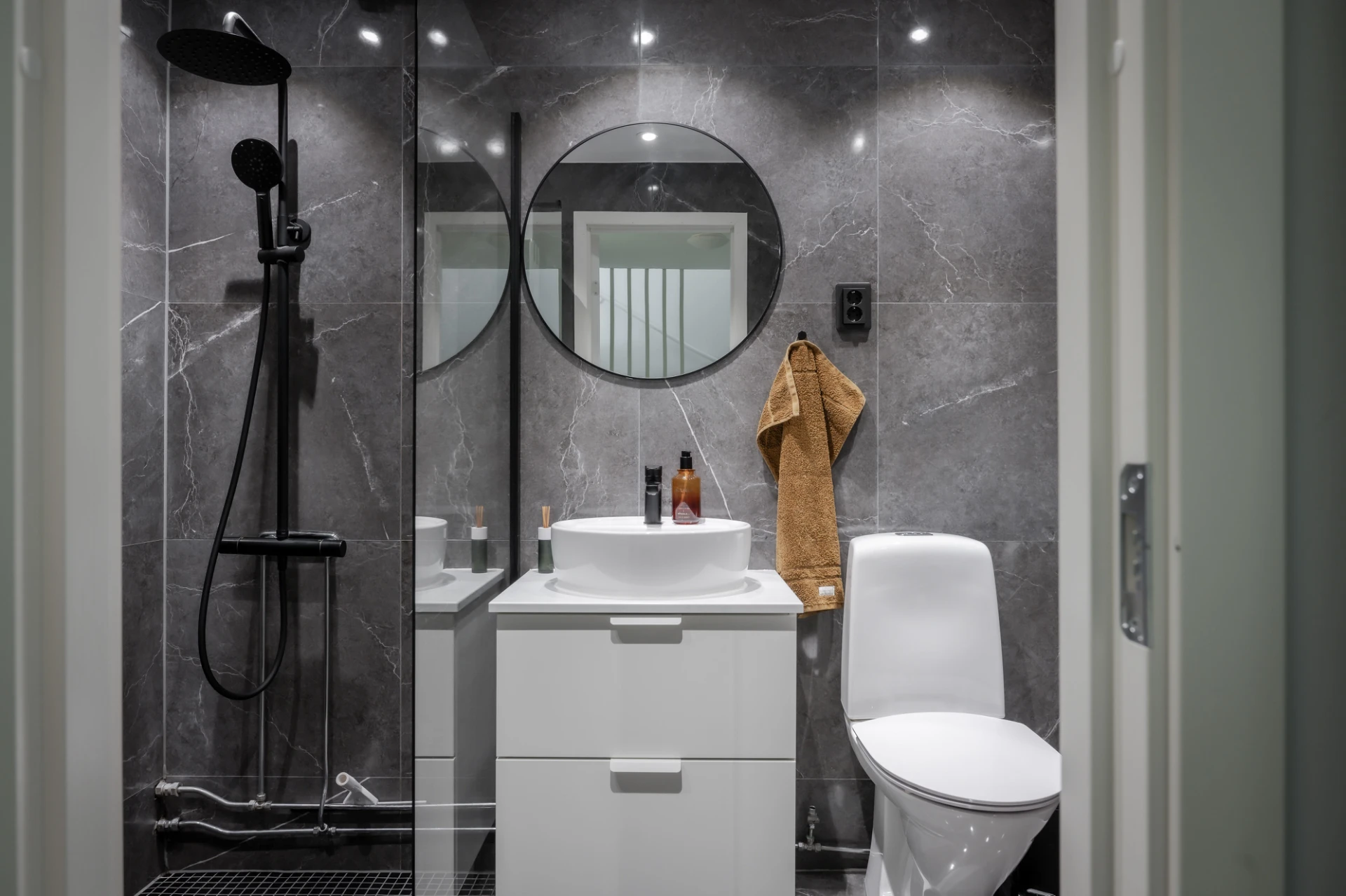 Helkaklat badrum i stilren design. Högblanka grå klinkerplattor på golvet och mörkare kakel på väggarna. I duschzonen finns vackert mosaik som skapar en fin kontrast. Utrustat med WC, handfat, dusch, golvvärme och spotlights.