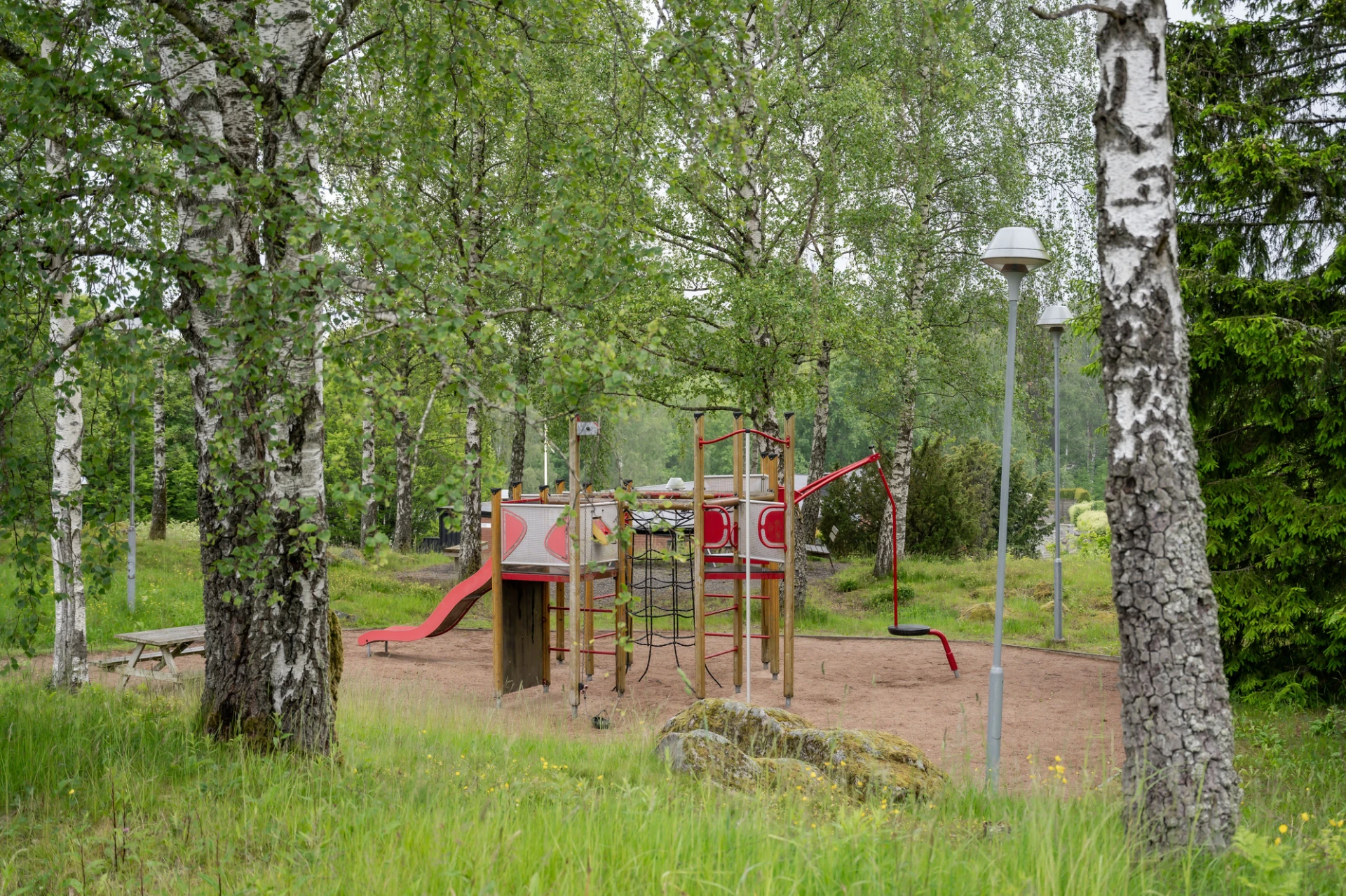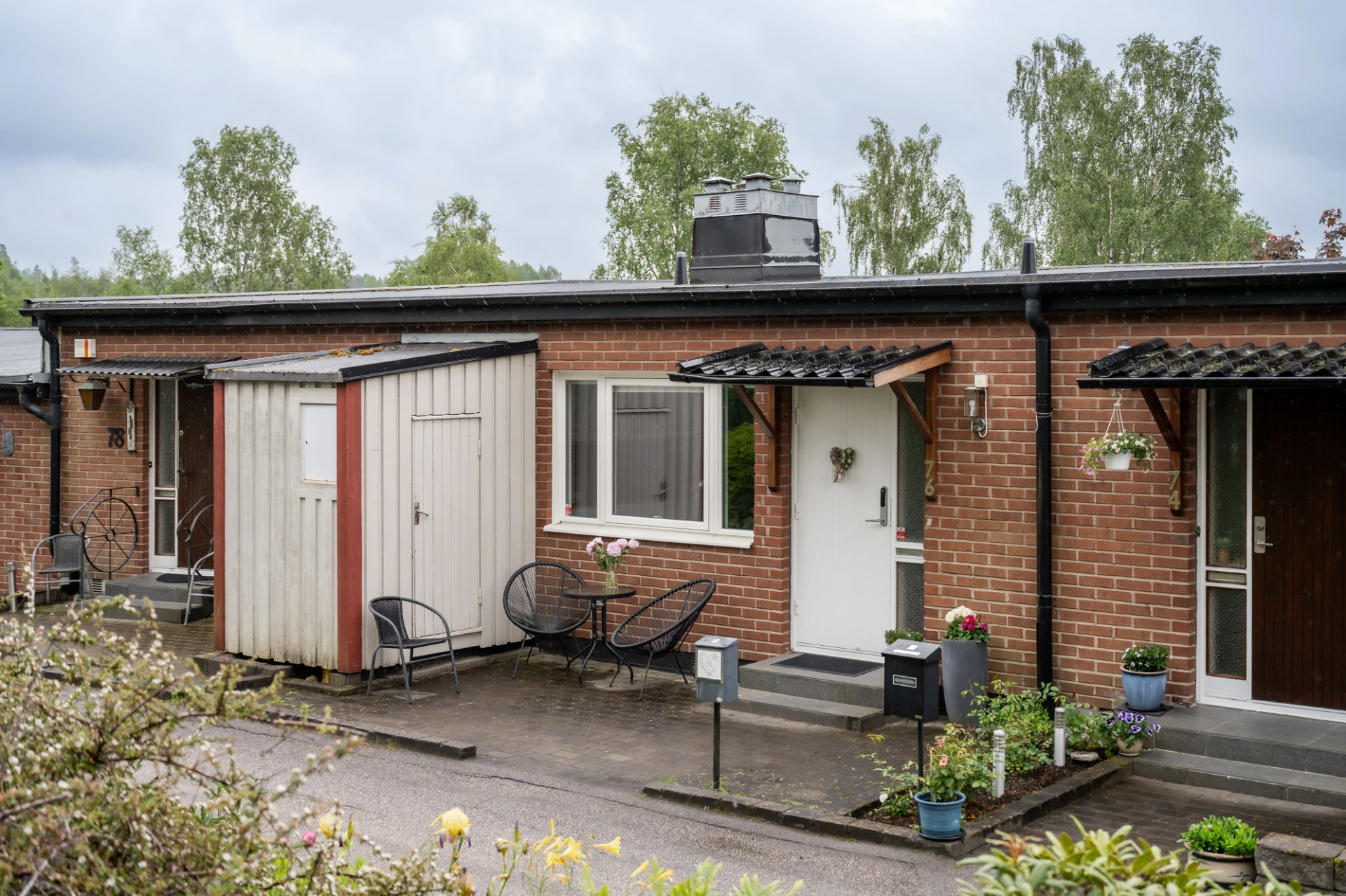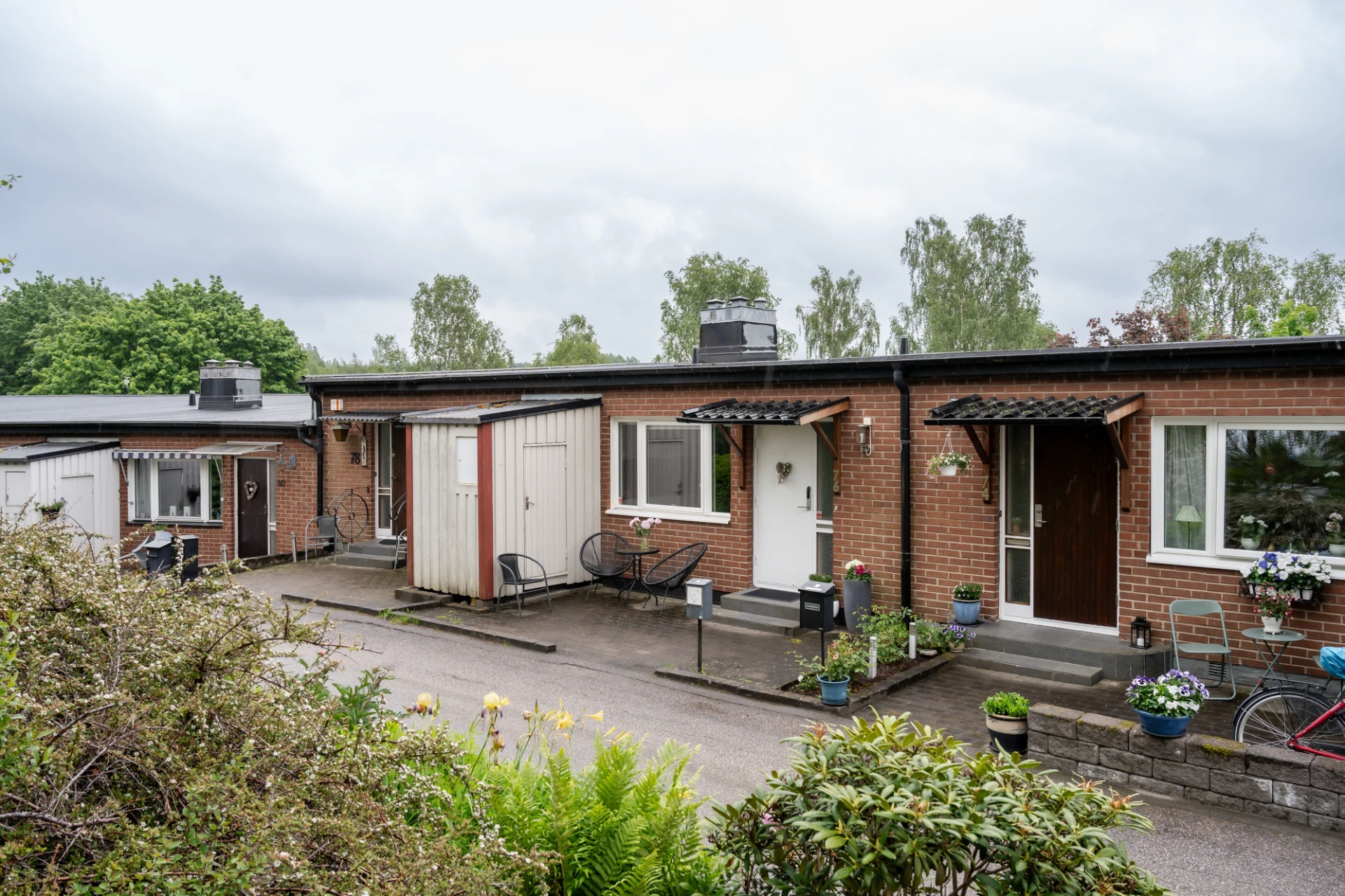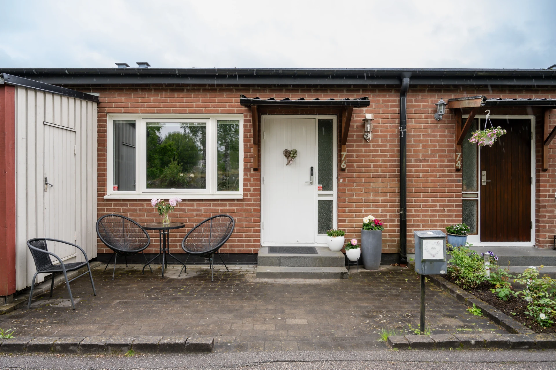 Baksidan har en trevlig träaltan, delvis under tak, som övergår i en grönskande trädgård – perfekt för både avkoppling och lek. Förvaringsutrymme finns tillgängligt.