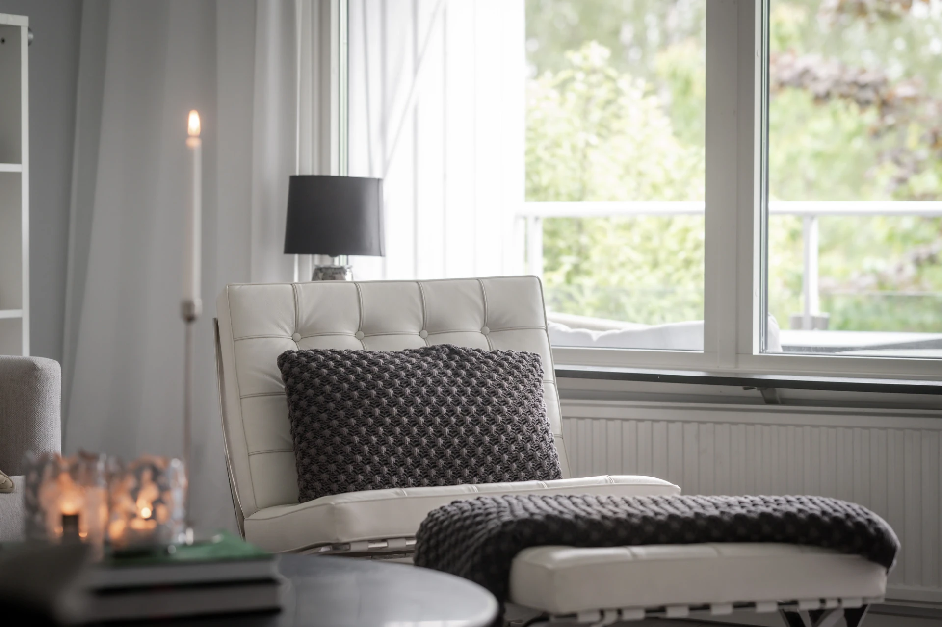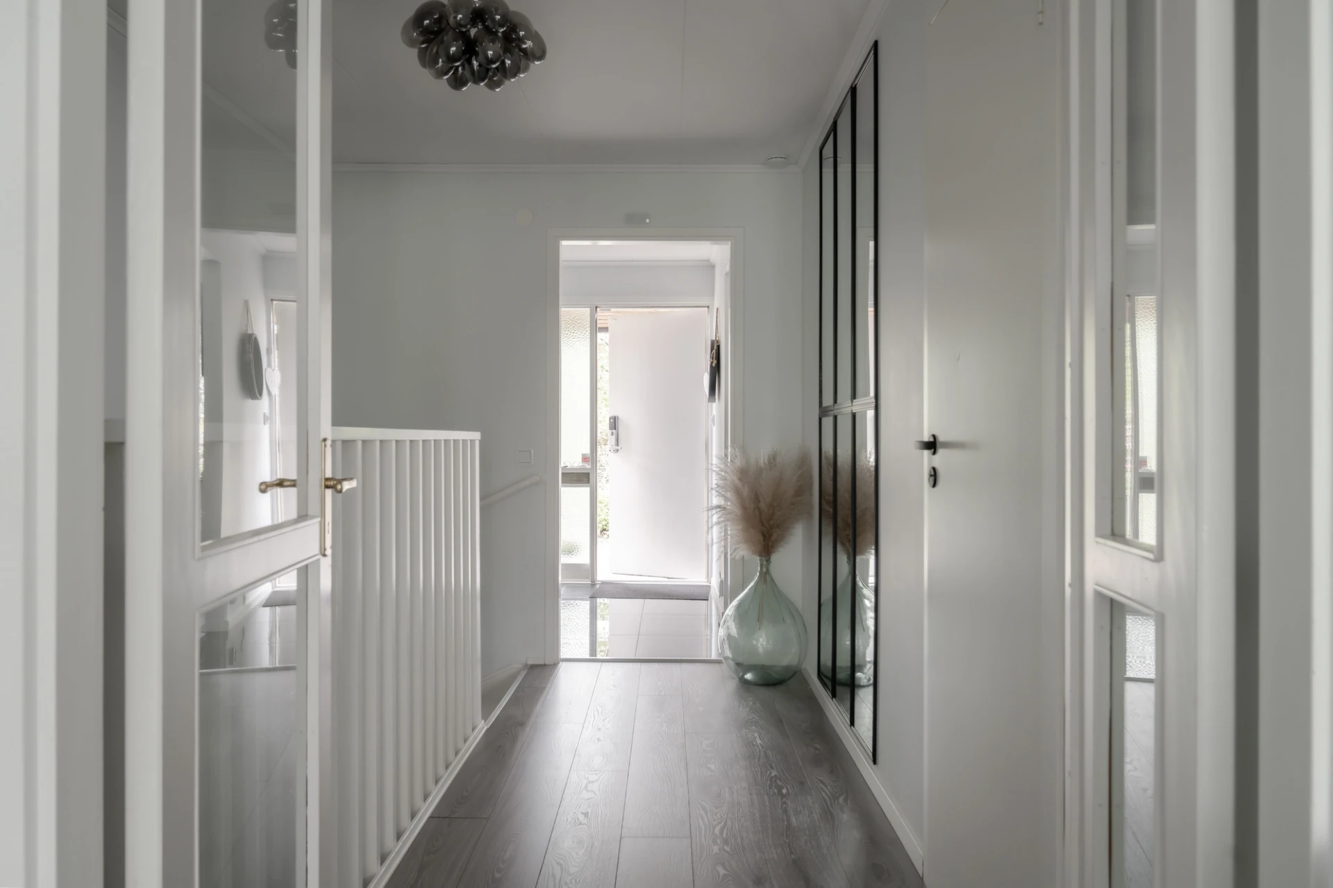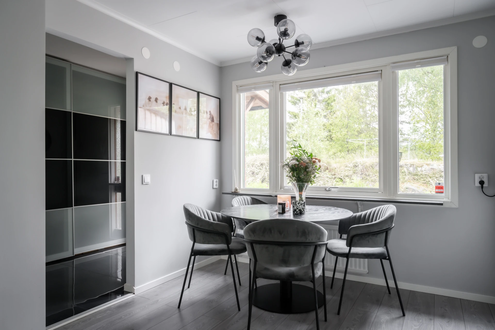 Den andra delen har parkettgolv och ljusa väggar, vilket ger ett luftigt intryck.