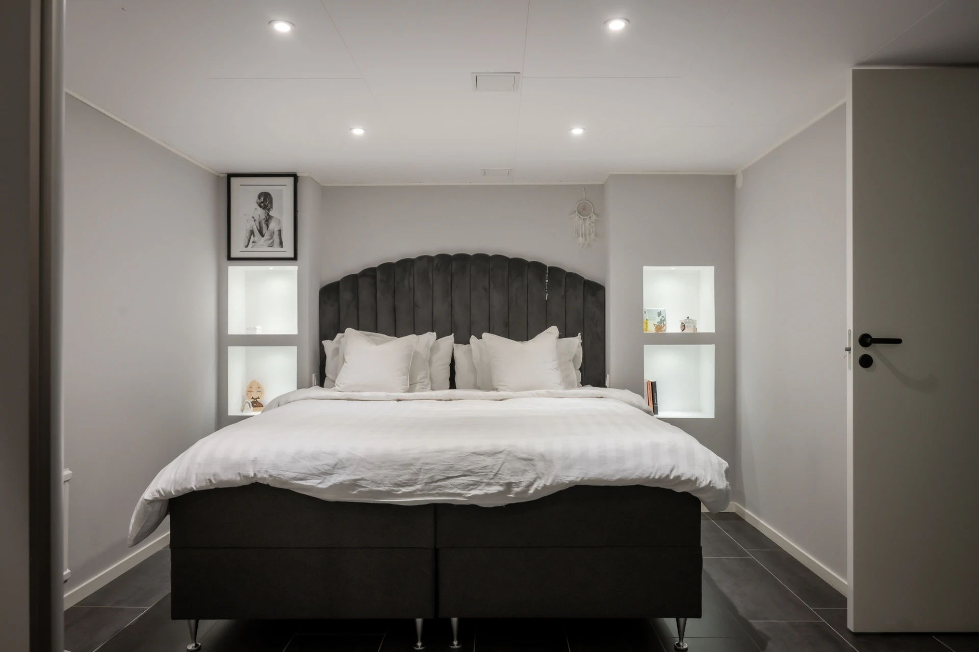 Sovrum 3: Mörk grå golv, ljusa väggar och infällda spotlights i taket.
