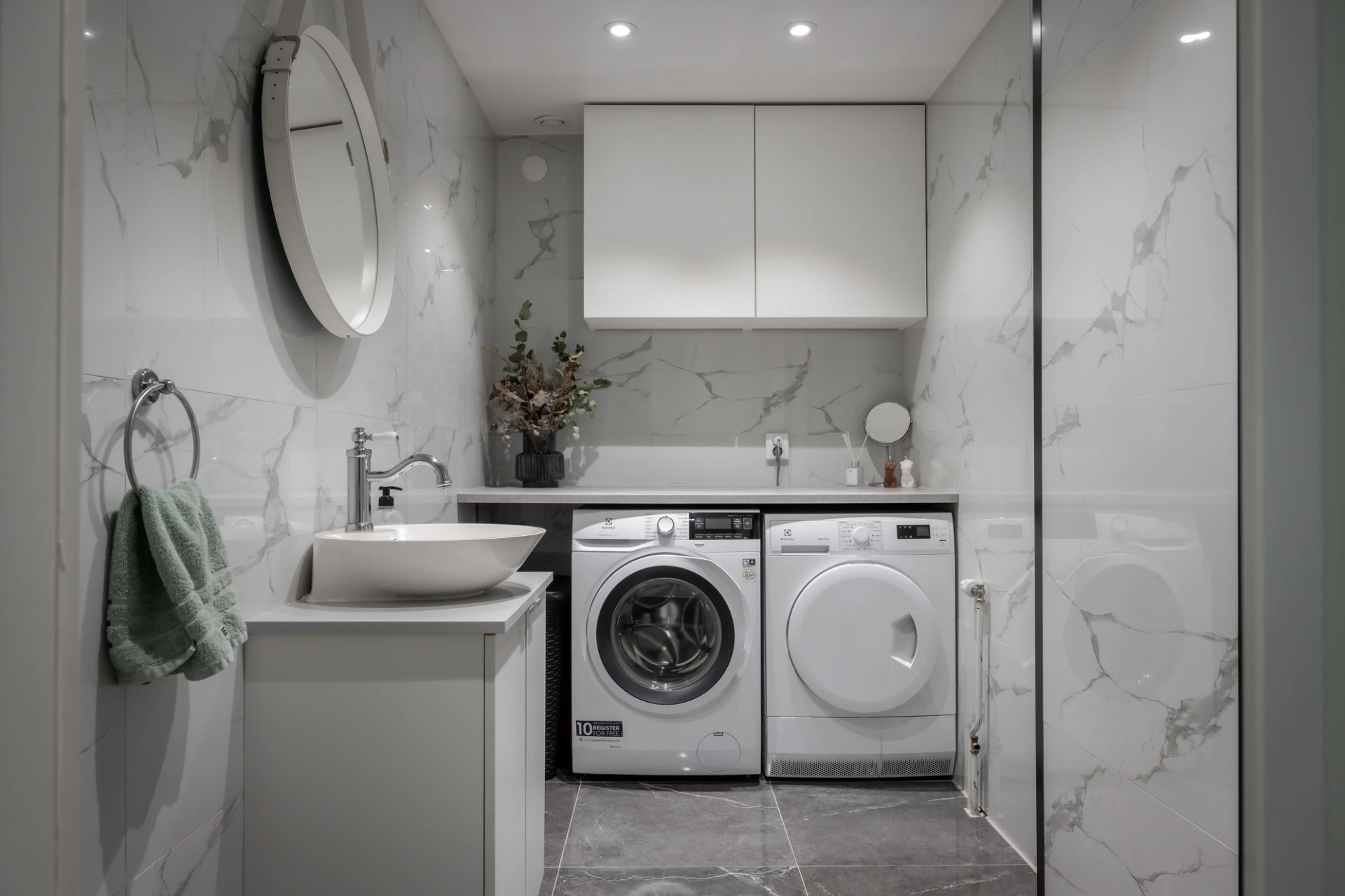 Här finns också en praktisk tvättavdelning med tvättmaskin, torktumlare, arbetsbänk och överskåp. Både golvvärme och infällda spotlights bidrar till komfort och funktion.