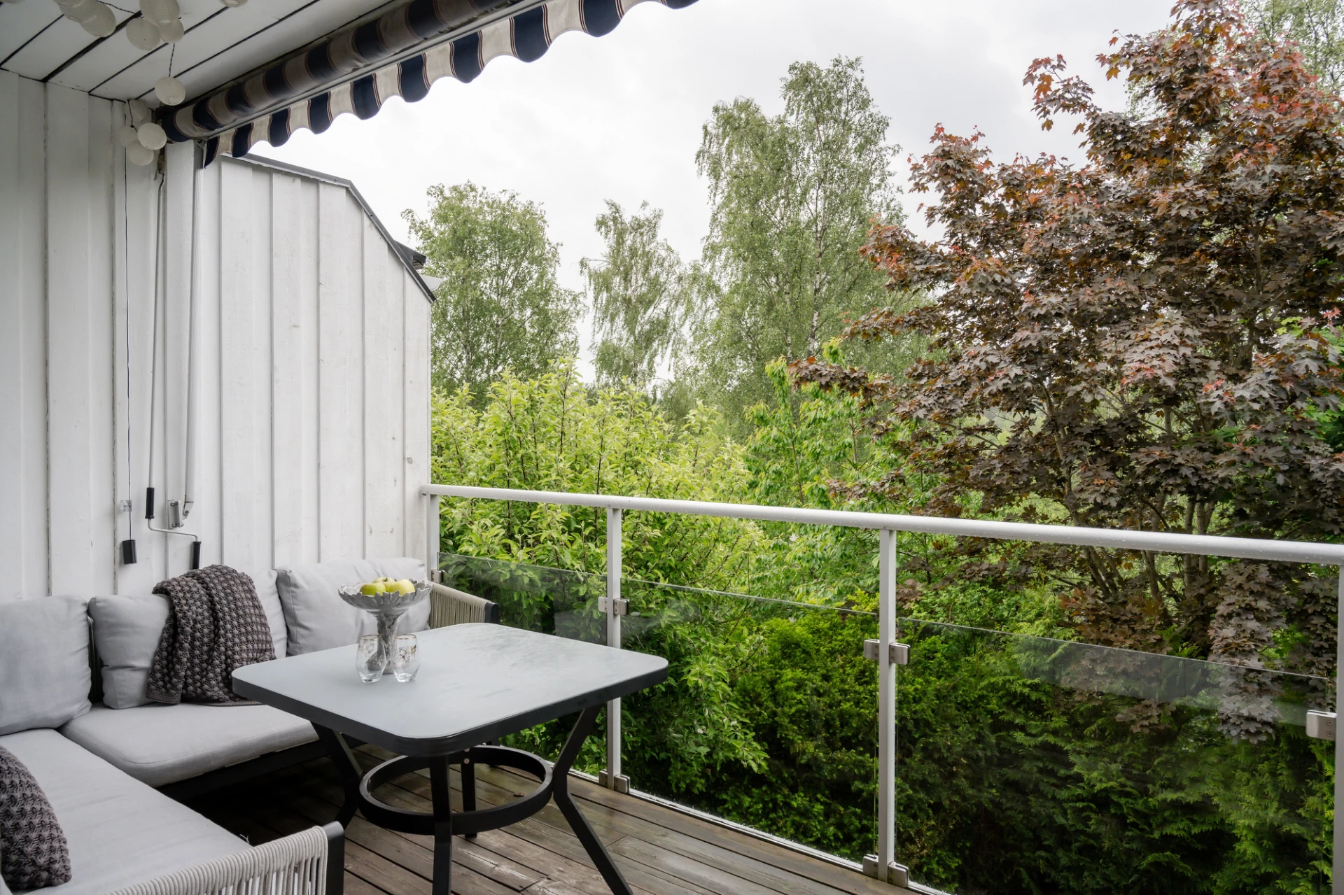 Trevlig balkong med glasräcke och delvis taköverbyggnad. Här finns även en markis som ger skugga under soliga dagar – en perfekt plats för morgonkaffet eller kvällens middag.