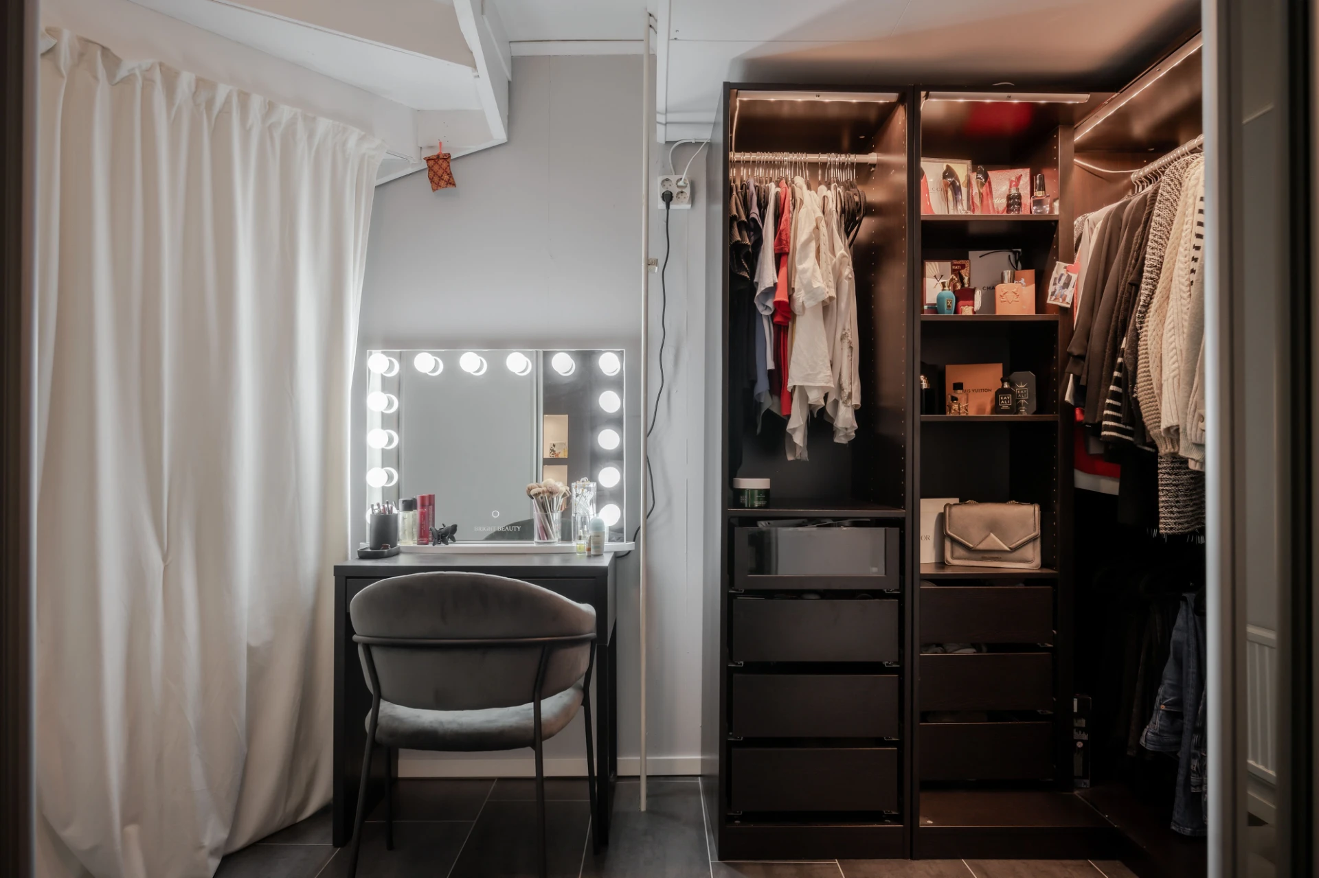 Stor och rymlig klädkammare med ingång från ett av sovrummen. Gott om plats för förvaring av kläder, skor och säsongsprylar.