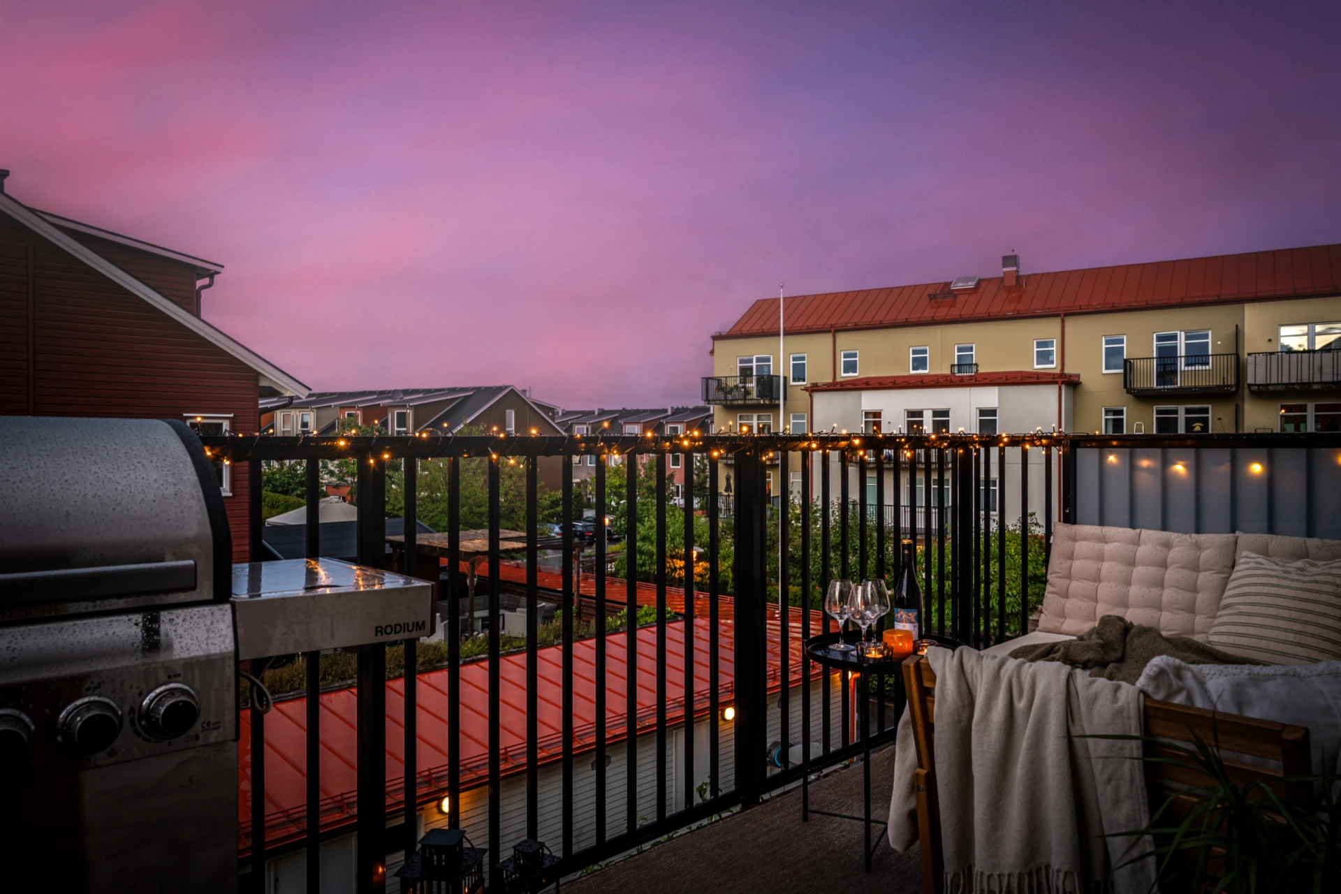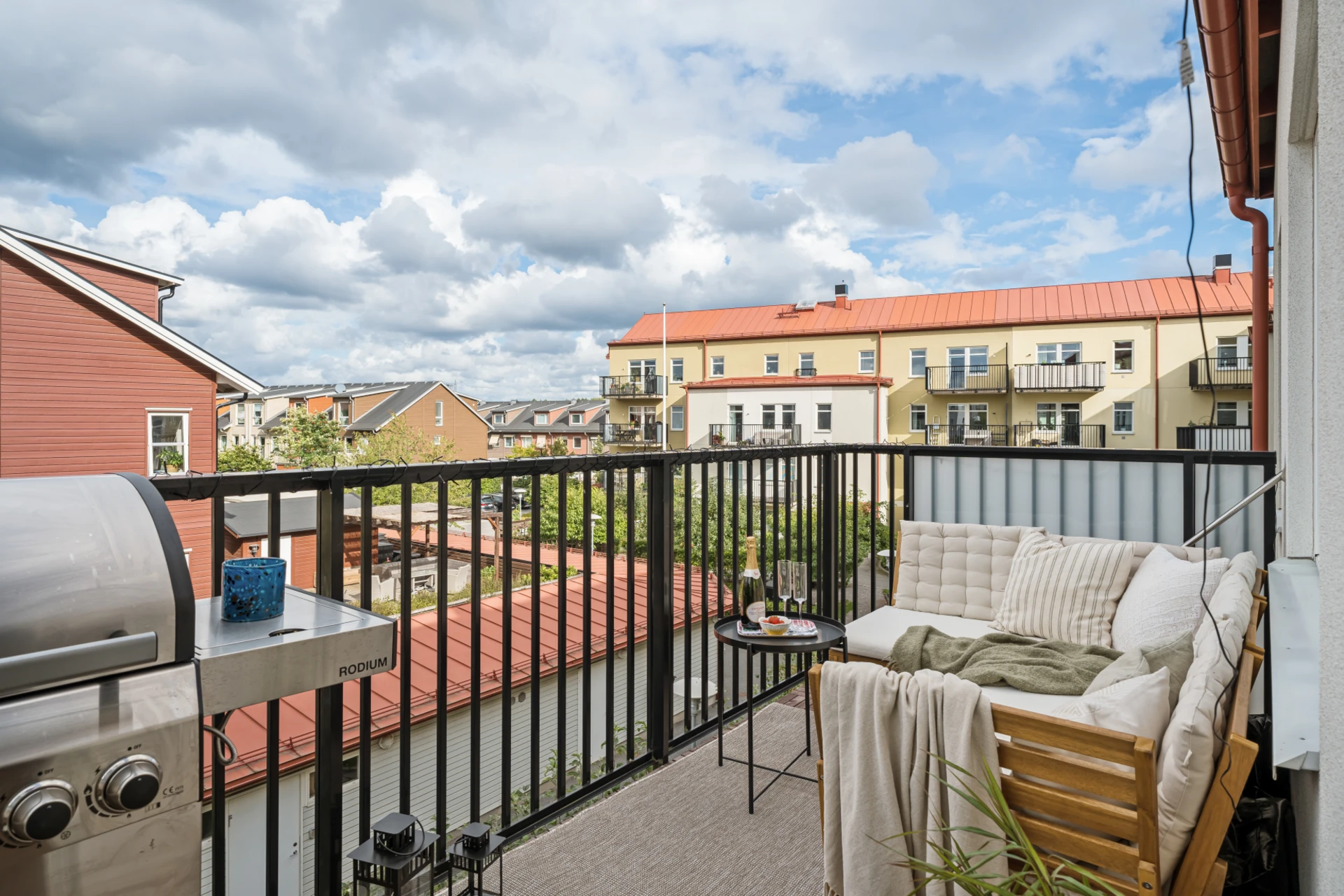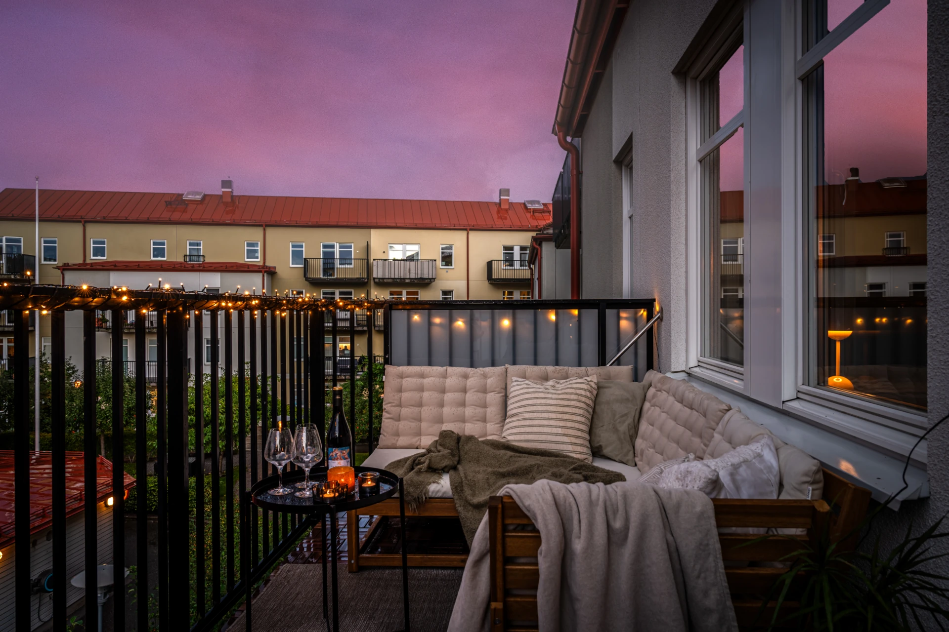 Mysig balkong med plats för både soffgrupp och grill samt annan önskad möblering.