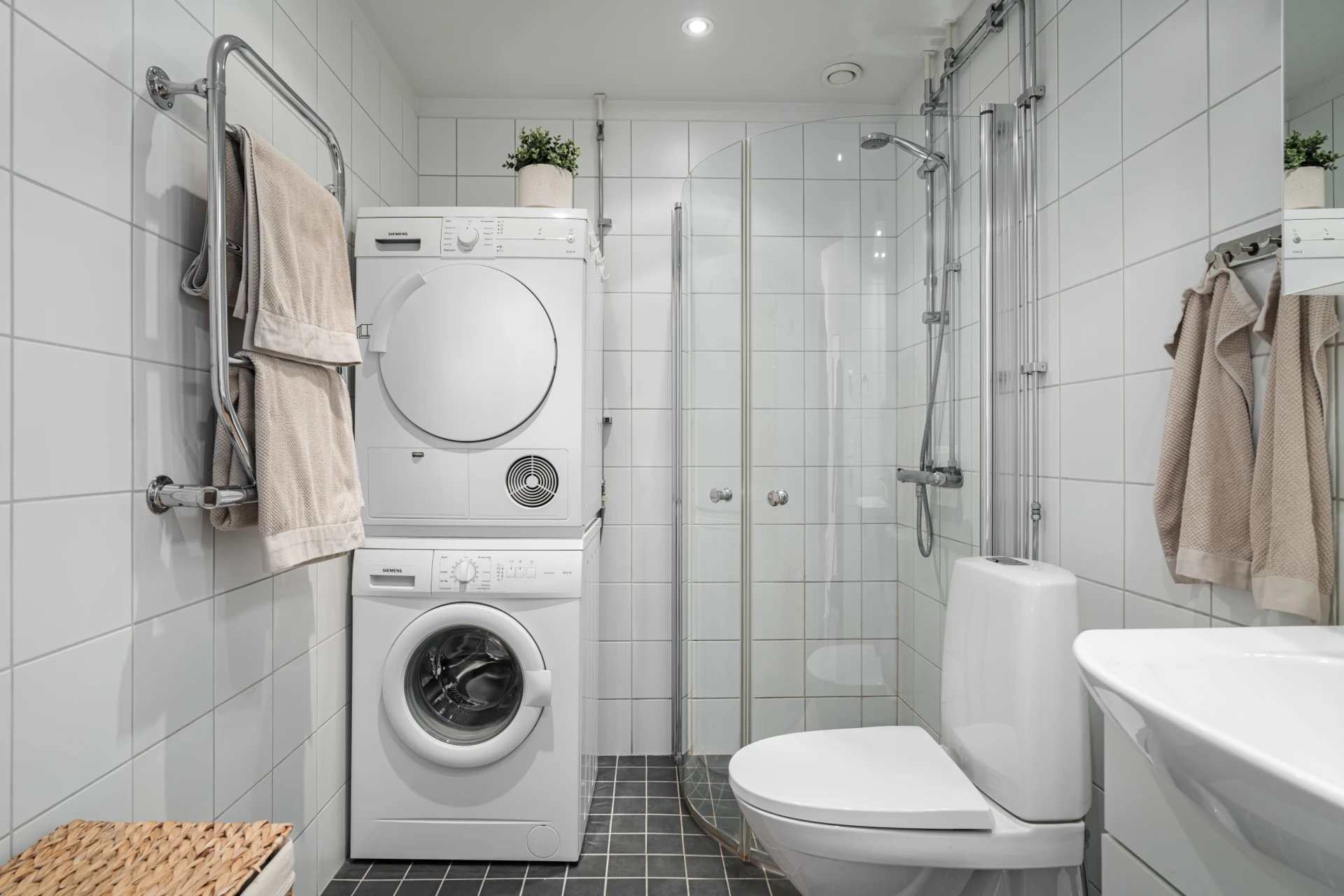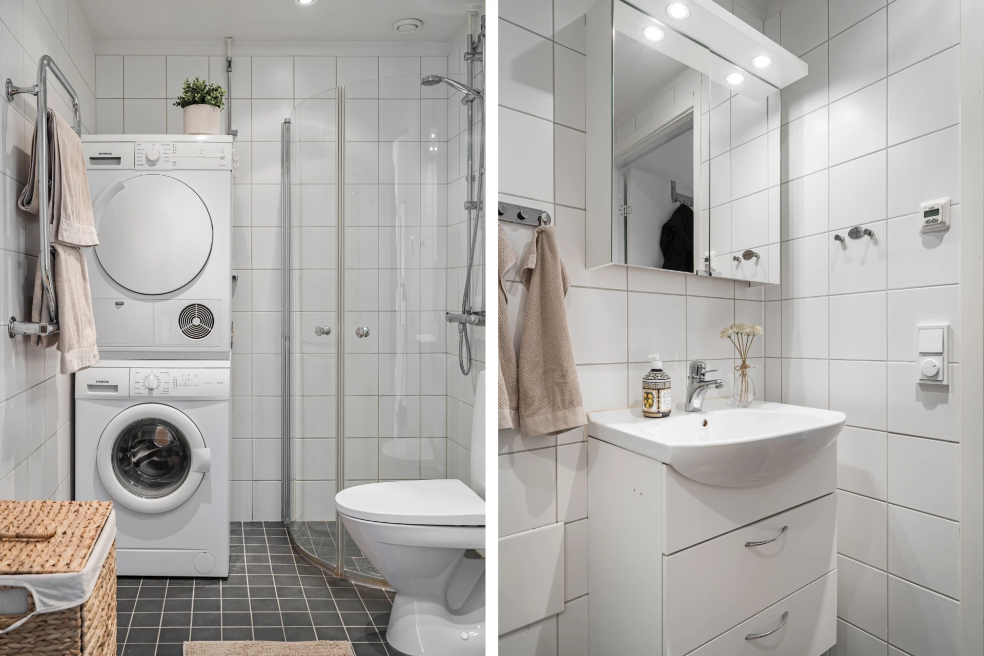 Grått klinkergolv med ljust kaklade väggar samt spotlights i tak. Utrustat med dusch, glasvägar, tvättmaskin, torktumlare, handdukstork, handfat med kommod samt spegelskåp ovan och wc.