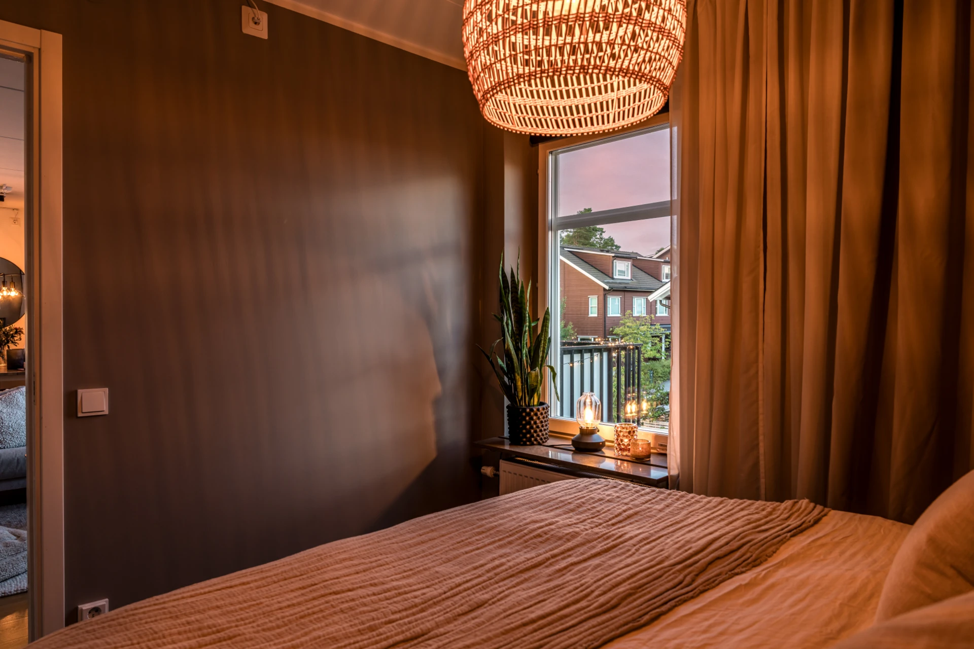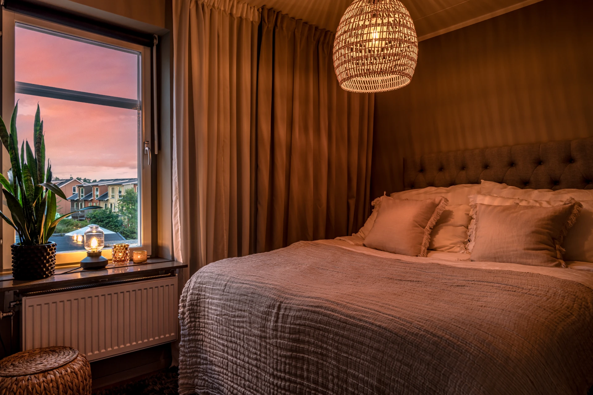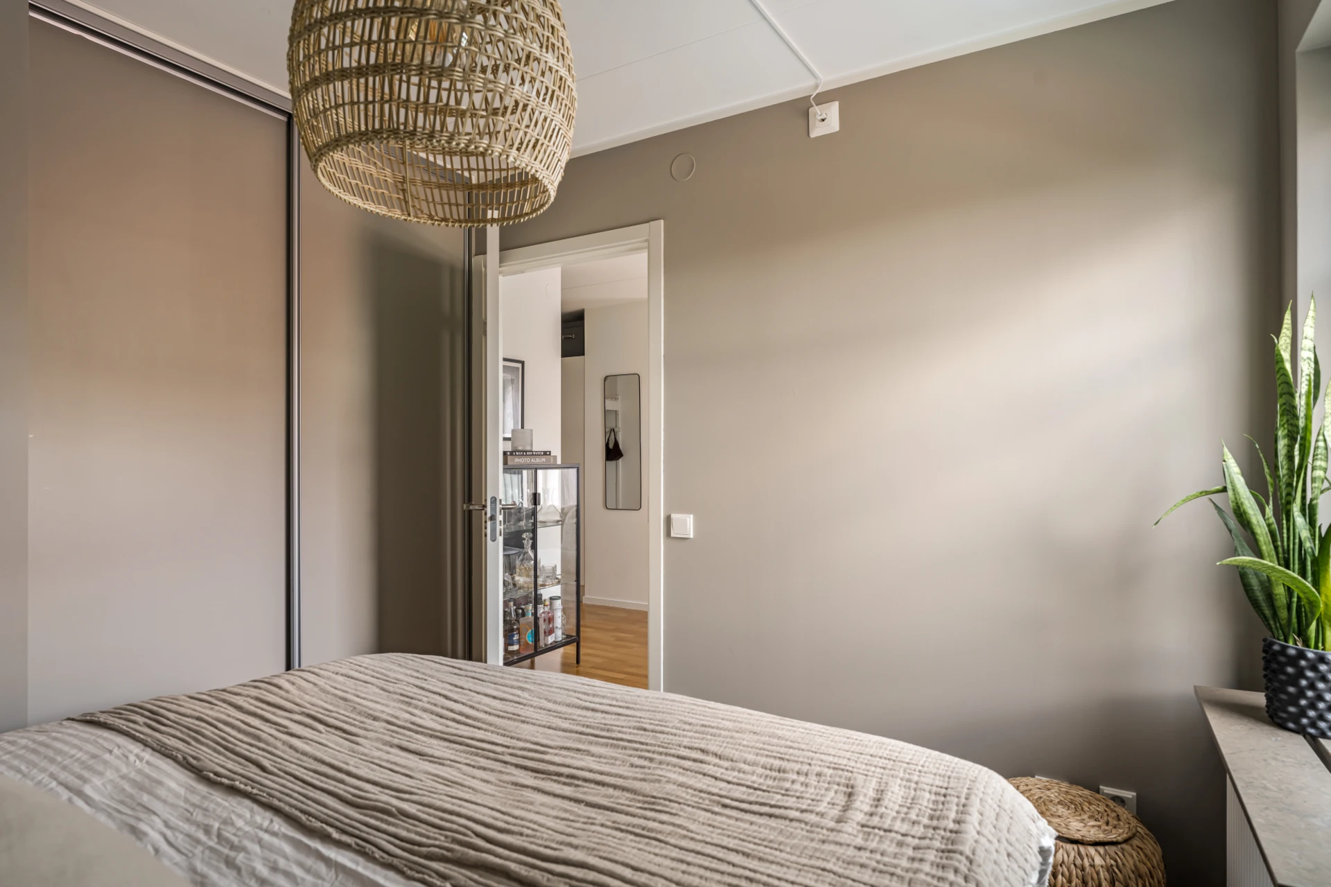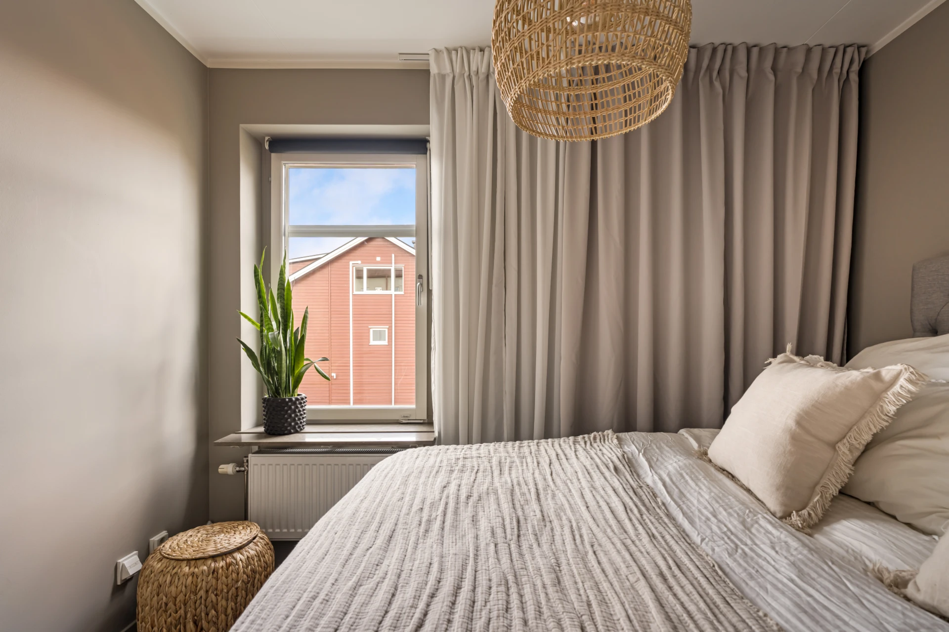 Ljust golv med berige kulör på väggarna. Plats för dubbelsäng, sängbord samt annan önskad möblering.