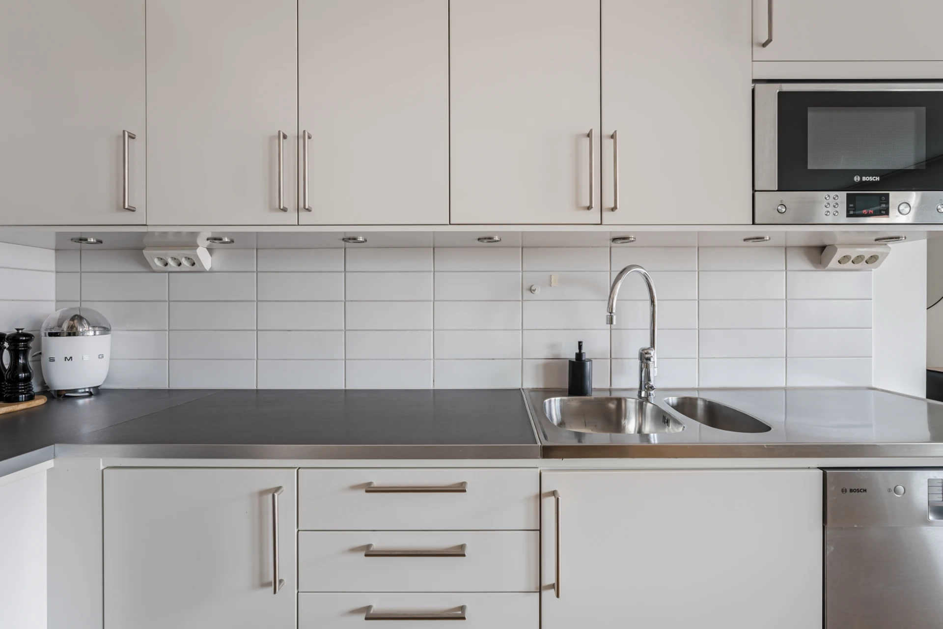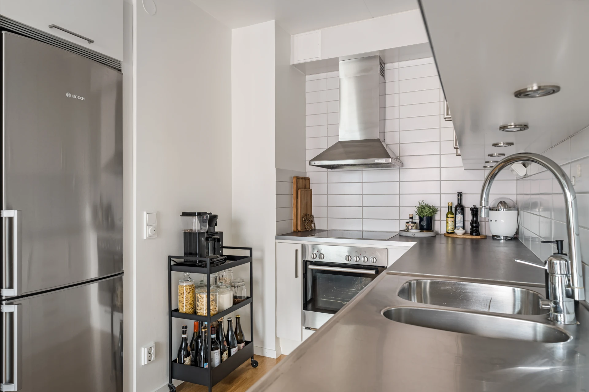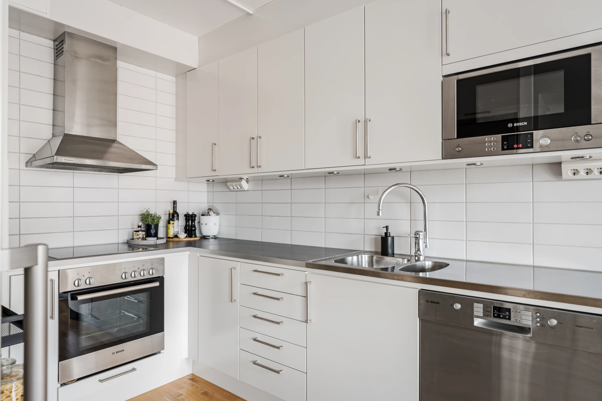 Ljust golv med ljusa väggar. Vitt kakel ovan silvrig arbetsbänk, ljusa skåpsluckor samt lådfronter. Utrustat med diskho, häll, fläkt, ugn, mikrovågsugn, diskmaskin och kyl/frys.