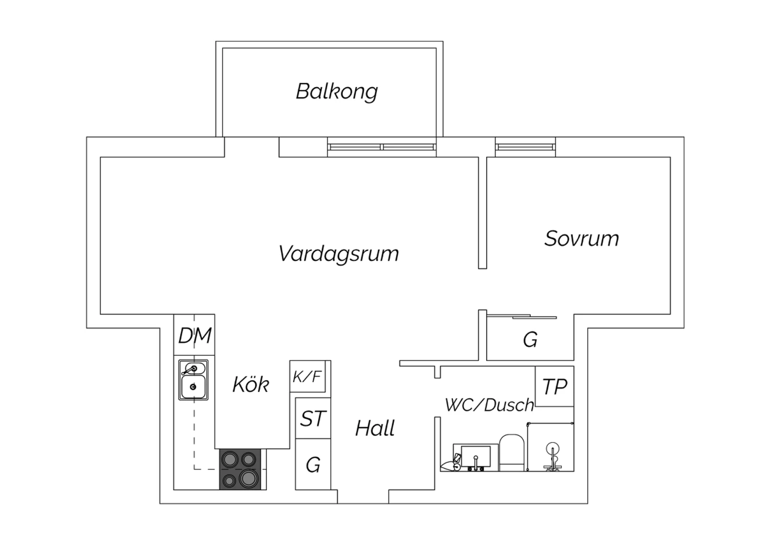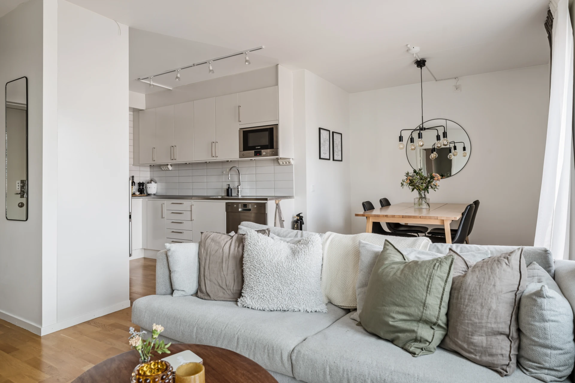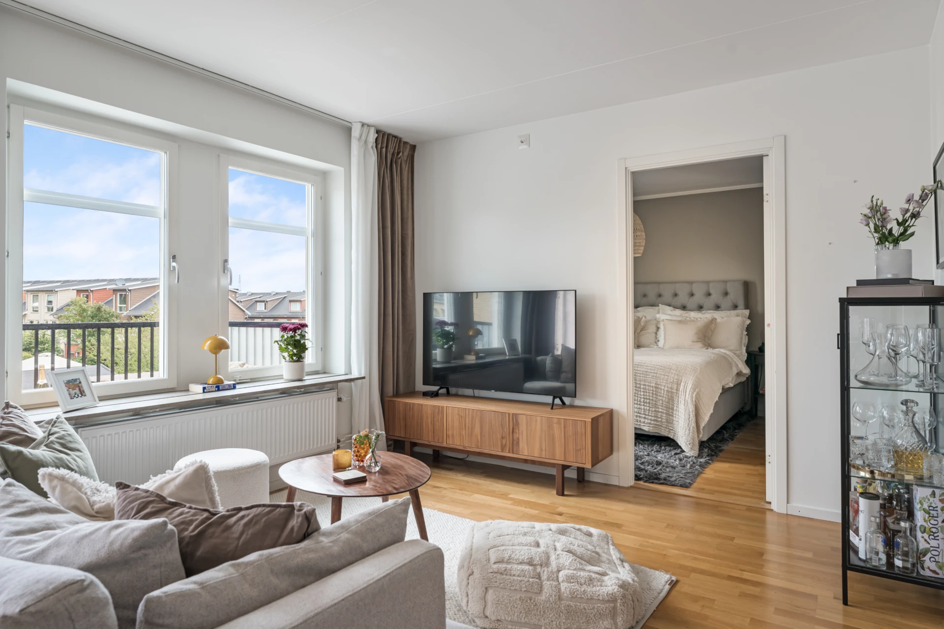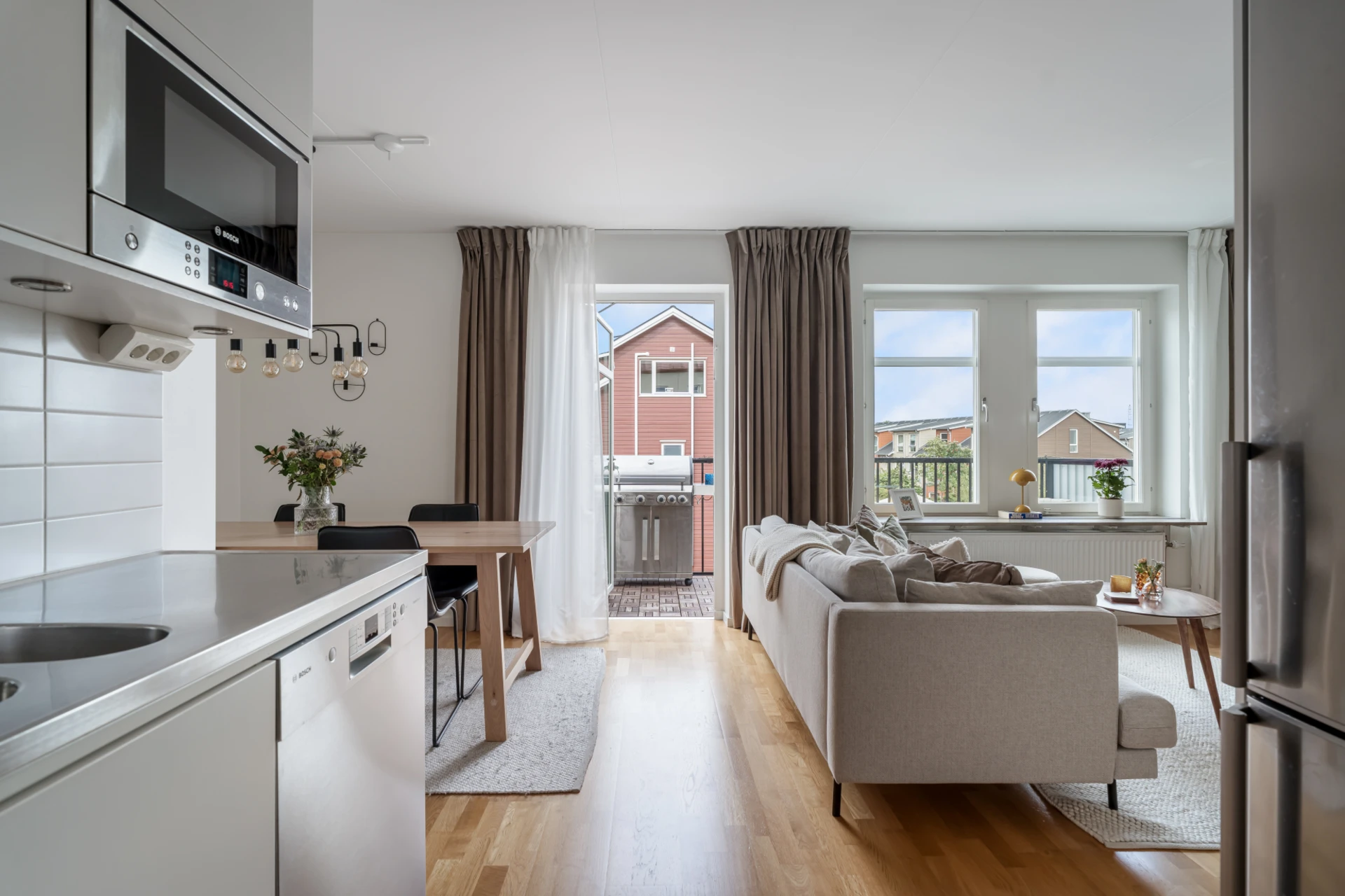 Ljust golv med ljusa väggar. Plats för soffa, soffbord, matgrupp samt annan önskad möblering. Utgång till balkong.