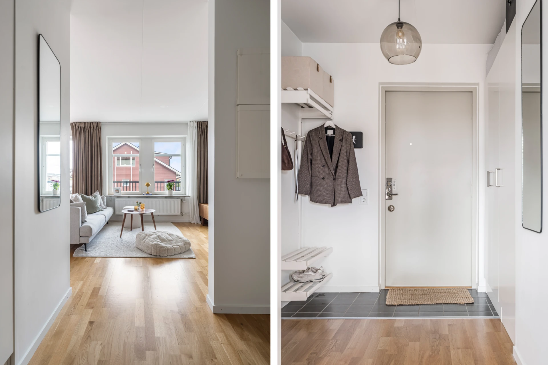 Välkomnande hall med mörkt klinkergolv med ljusa väggar. Plats för avhängning. garderober med god förvaring.