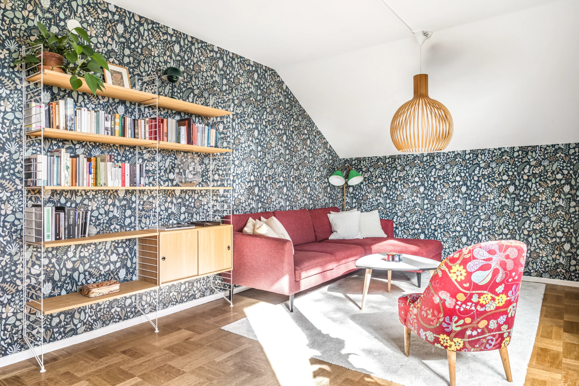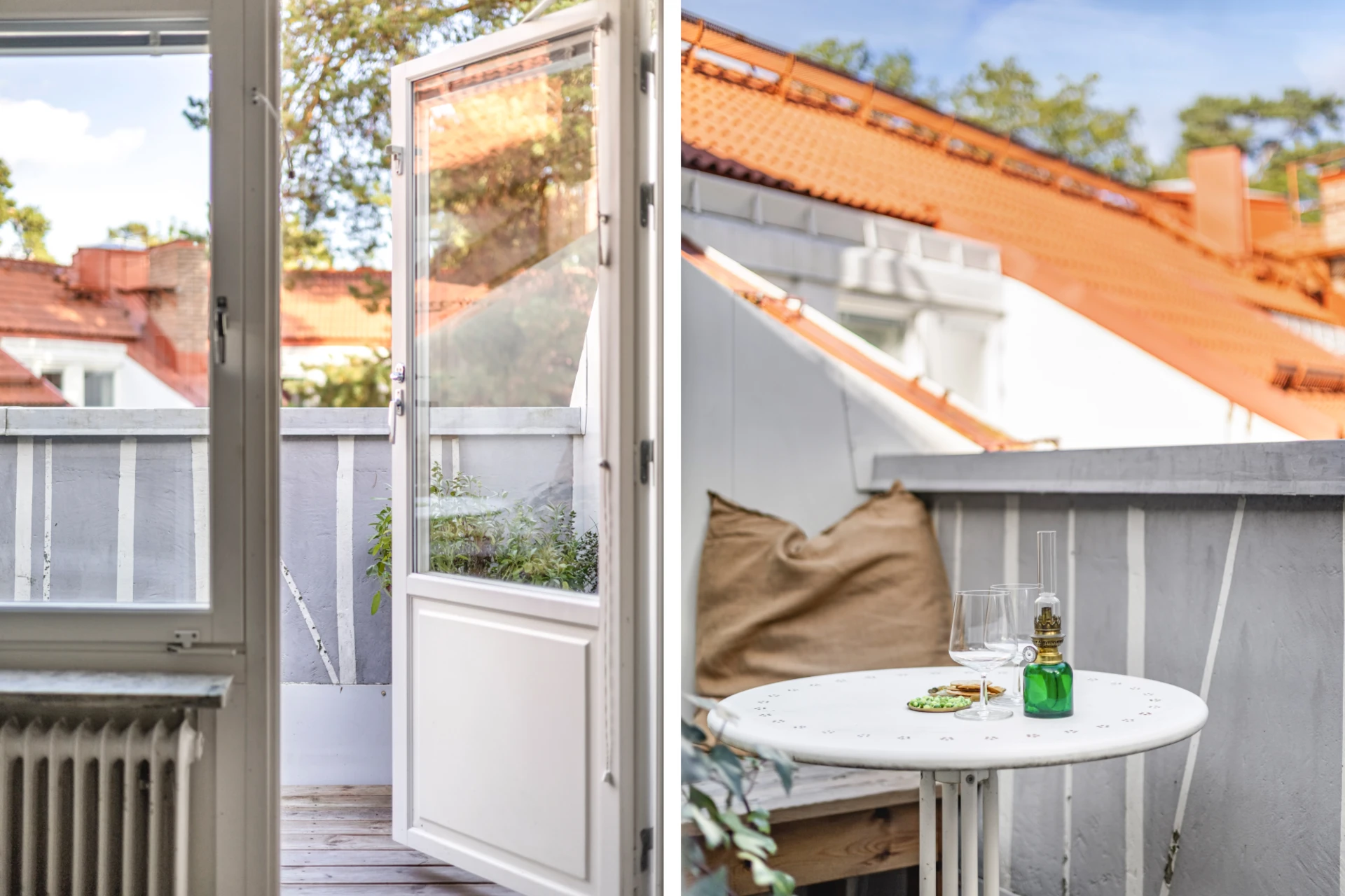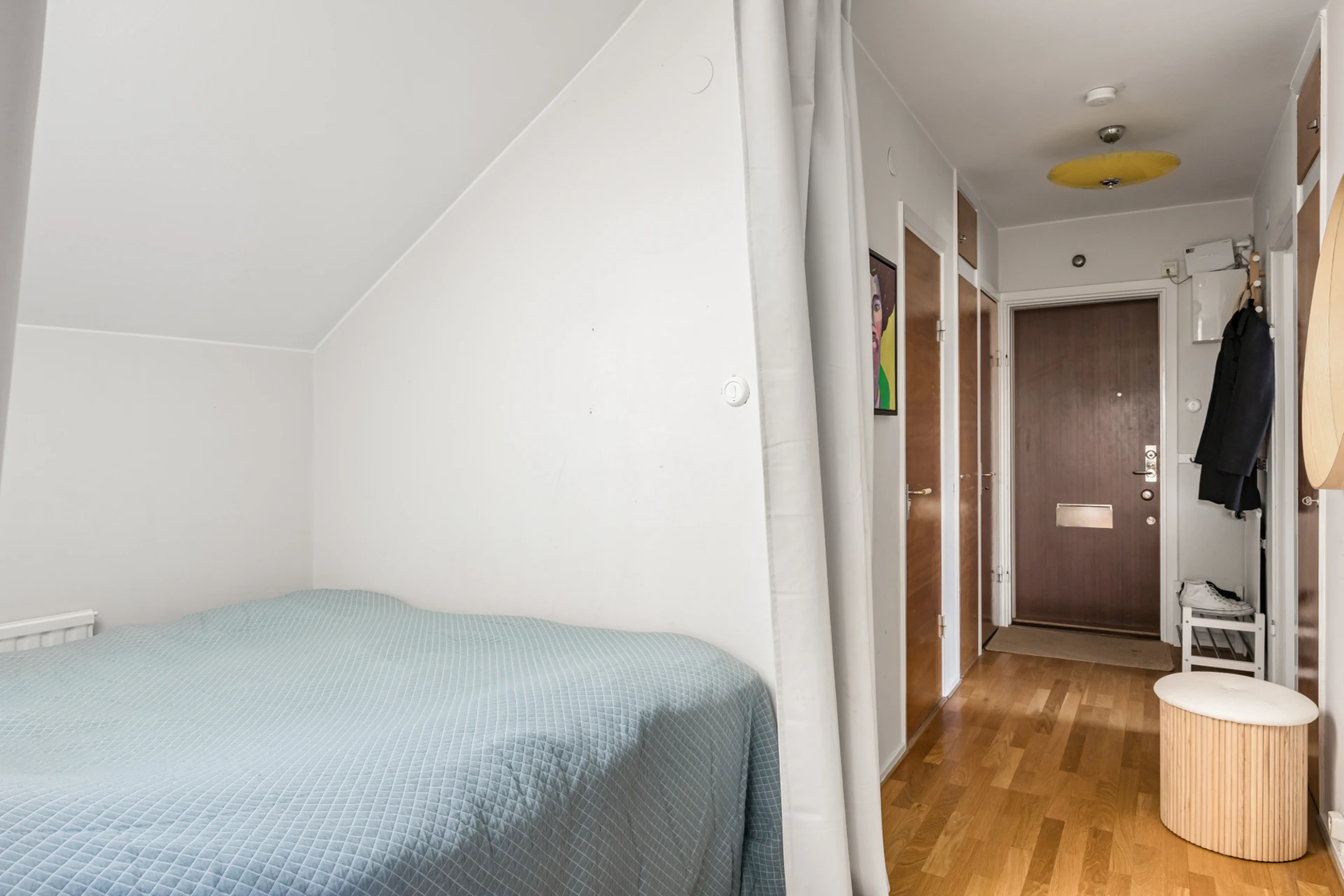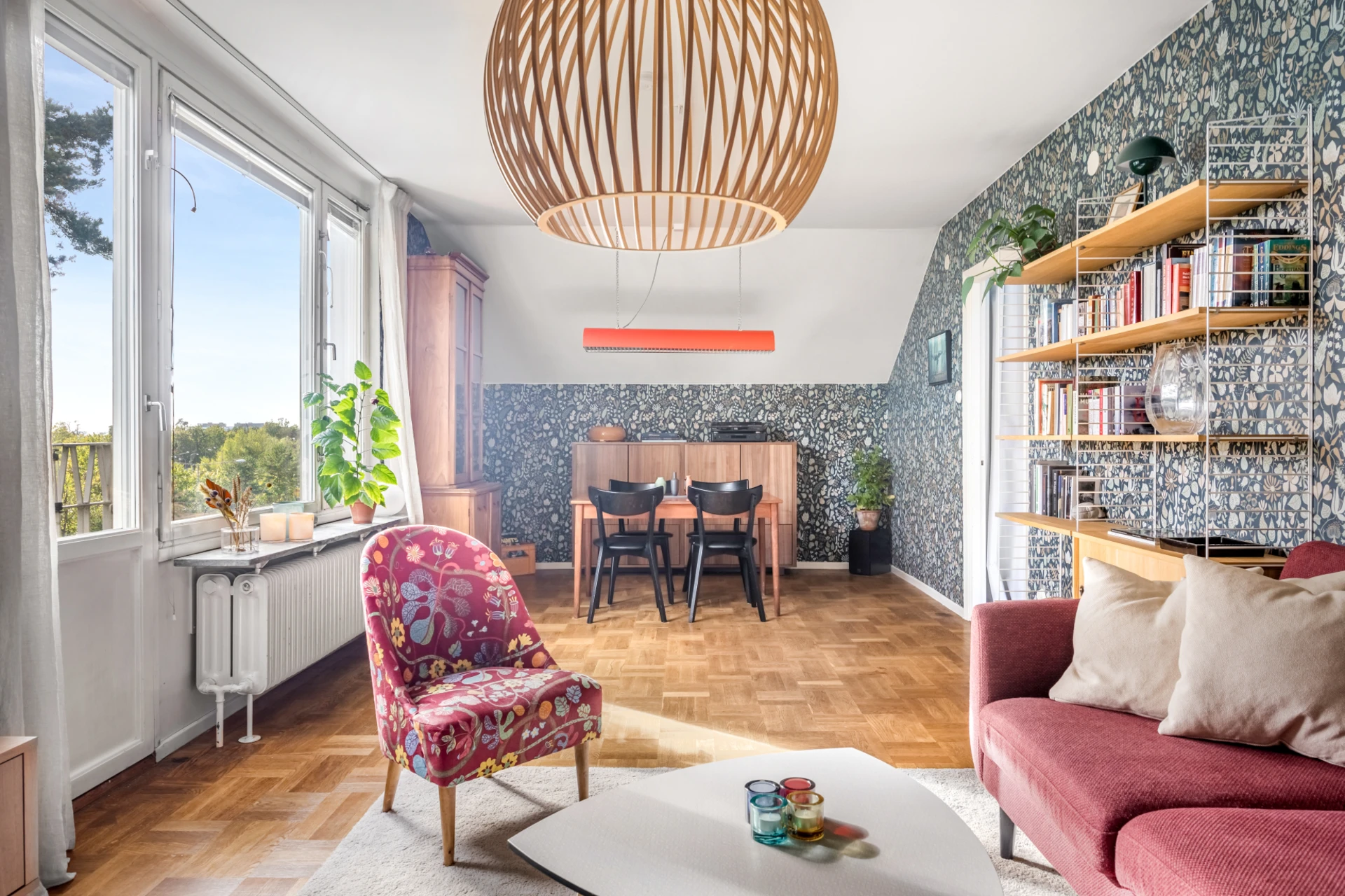 Ljust golv och ljusa väggar samt tapetserade väggar. Plats för soffa, soffbord, matgrupp samt annan önskad möblering. Delvis snedtak. Stort fönster och fransk balkong.