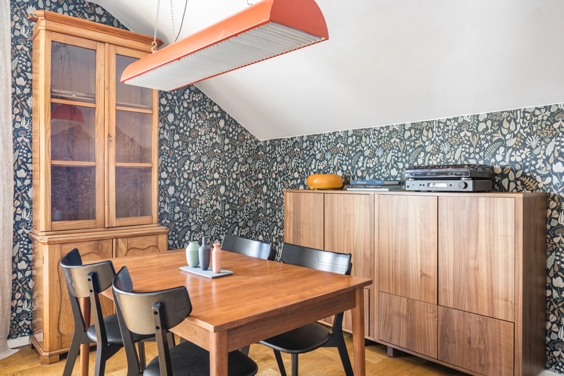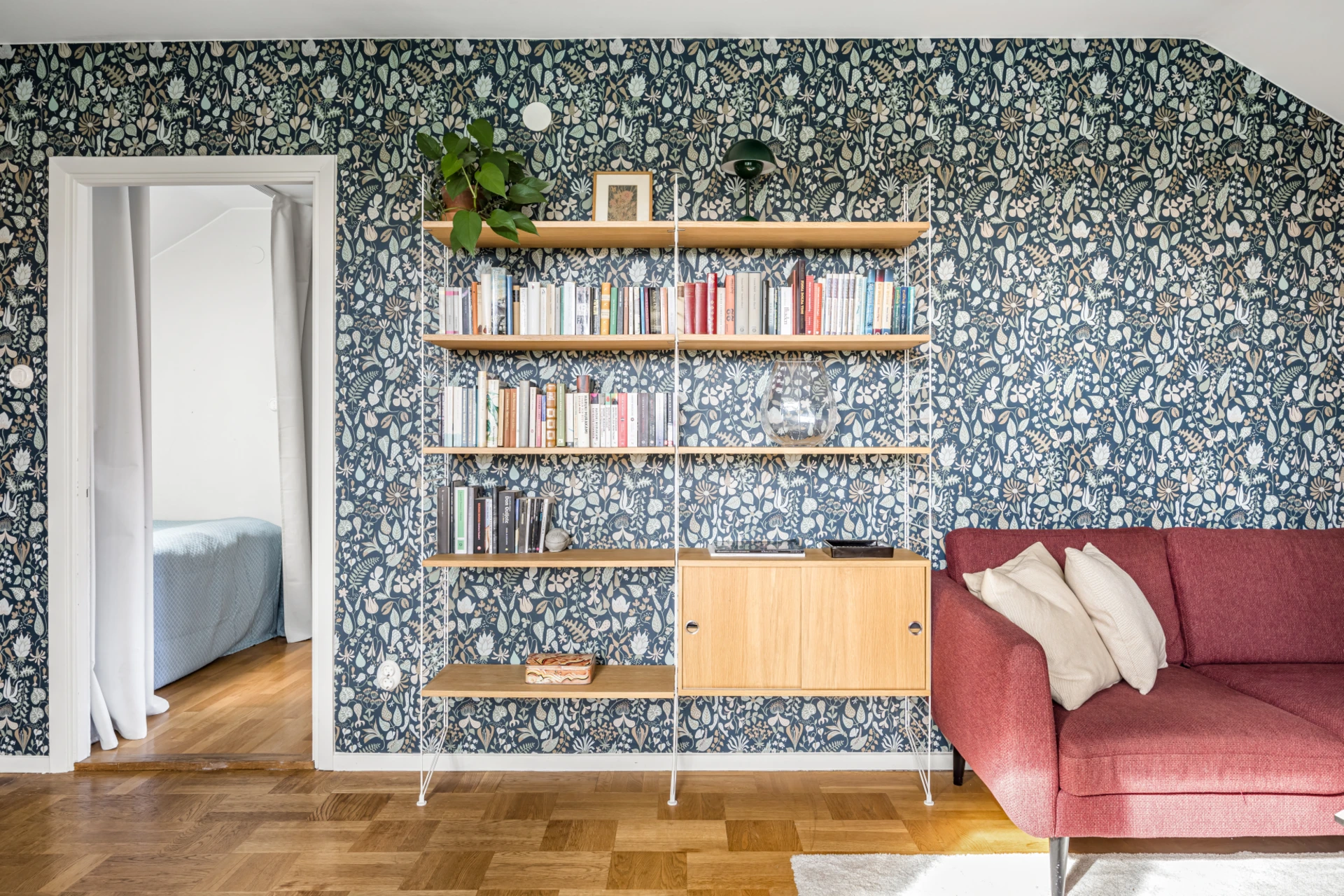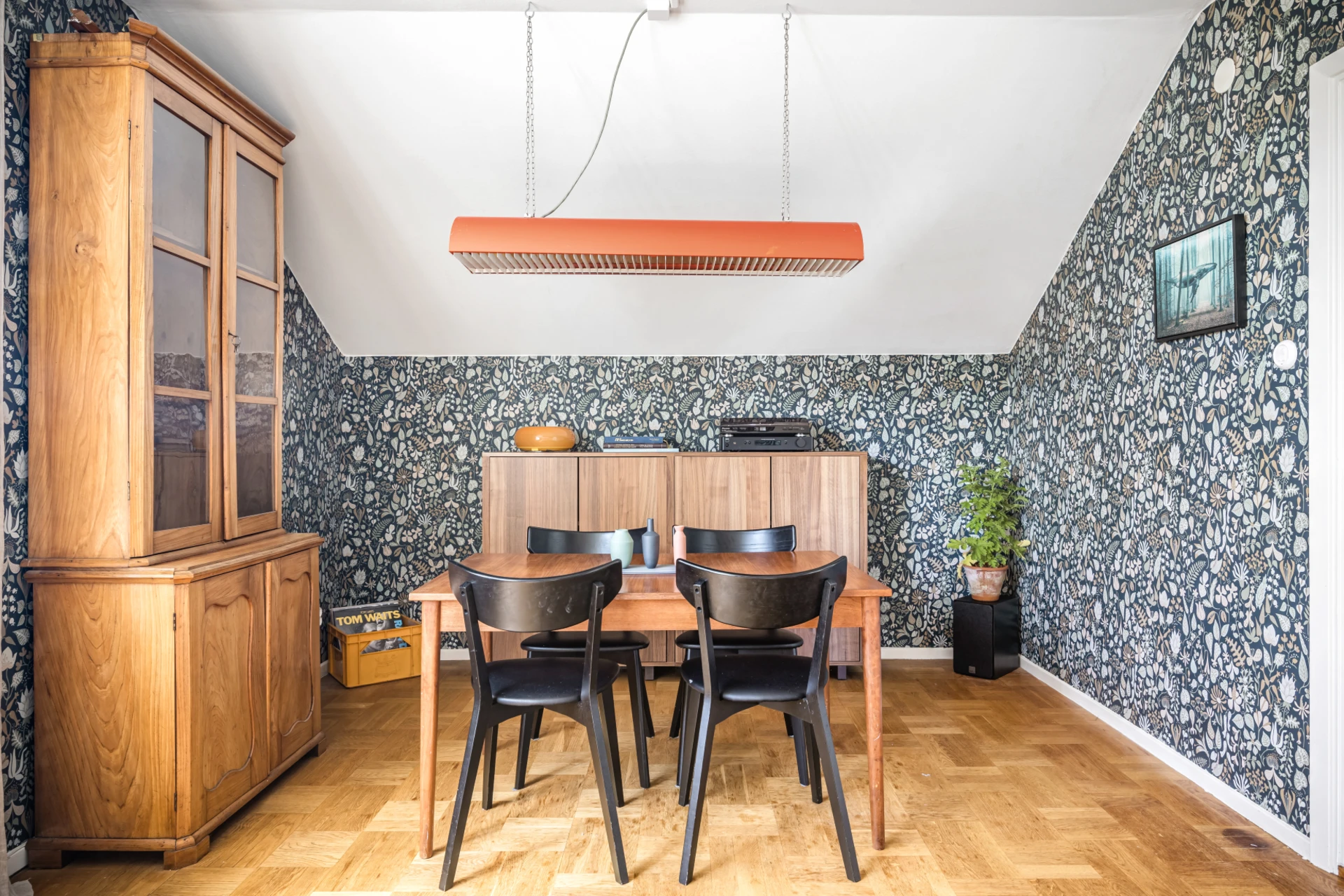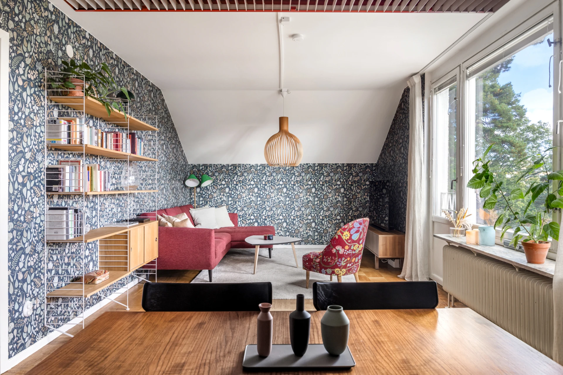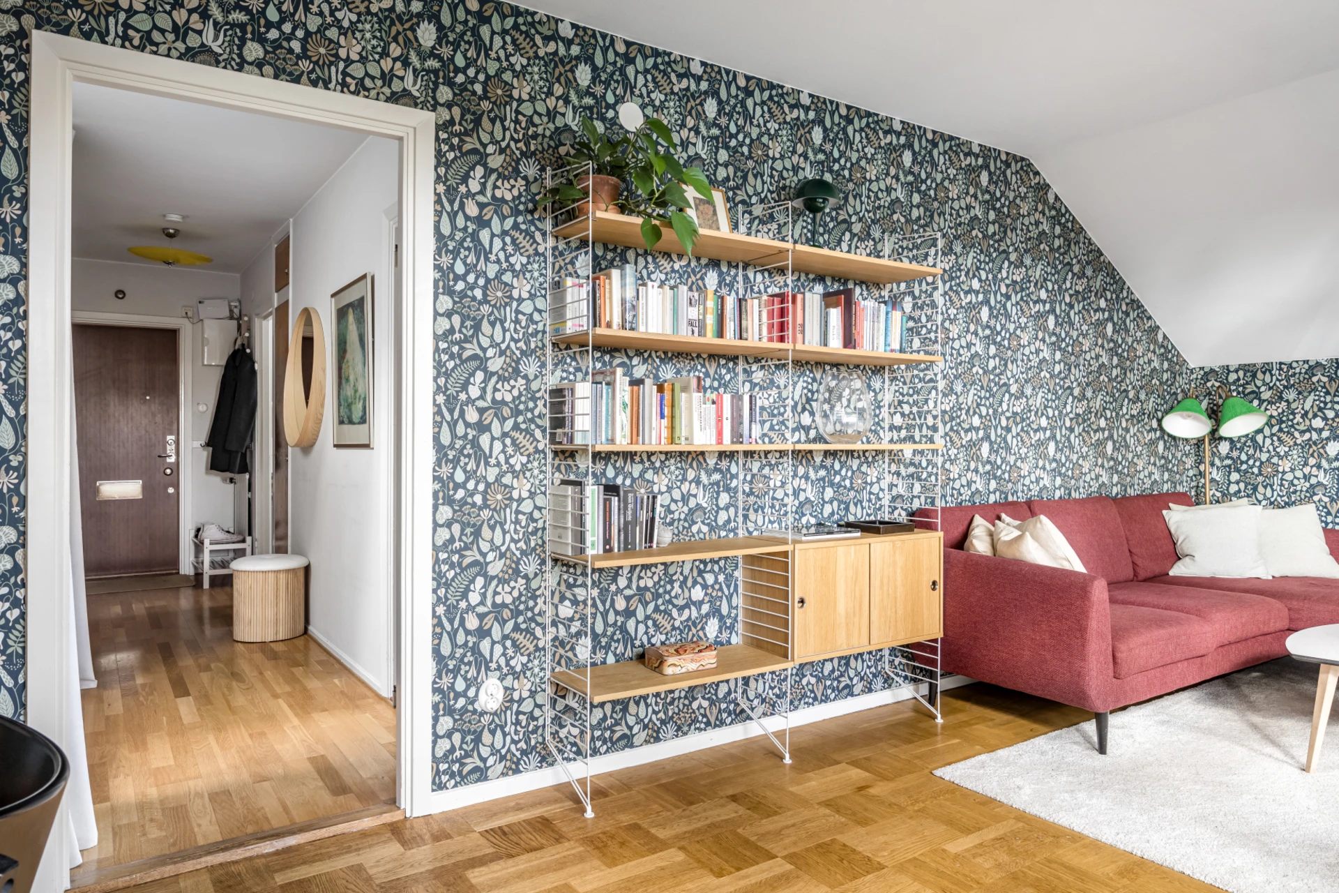 Ljust golv och ljusa väggar samt tapetserade väggar. Plats för soffa, soffbord, matgrupp samt annan önskad möblering. Delvis snedtak. Stort fönster och fransk balkong.