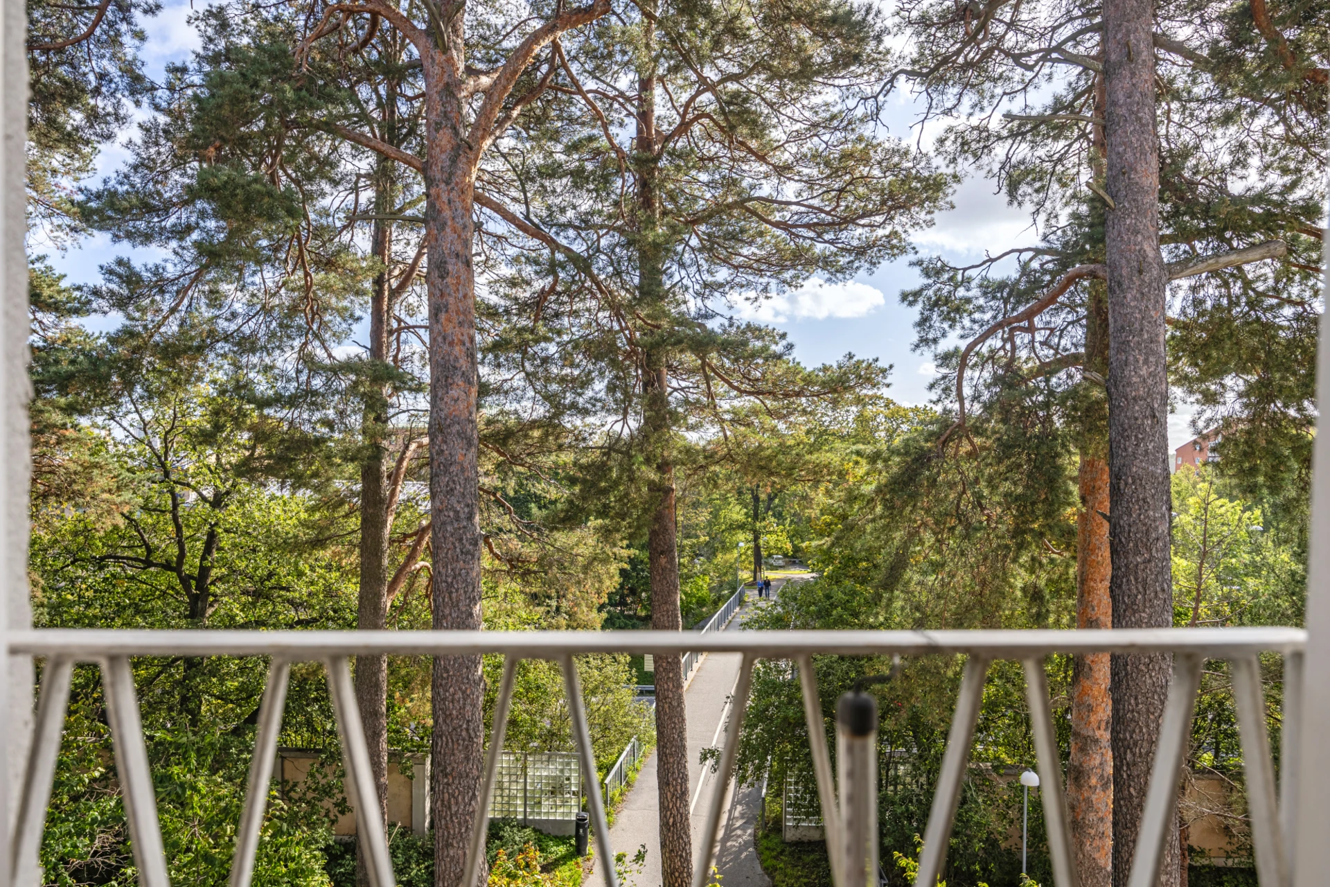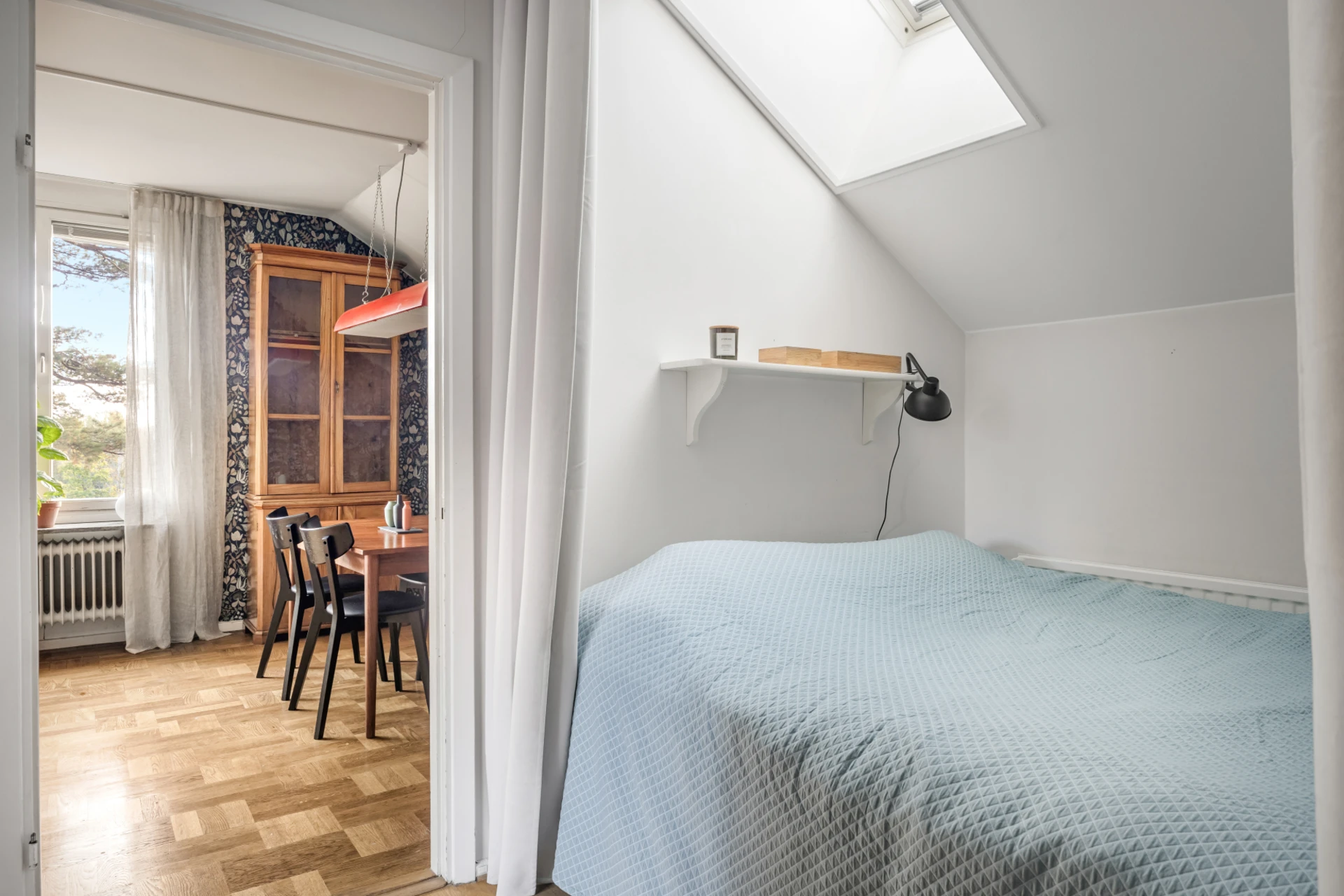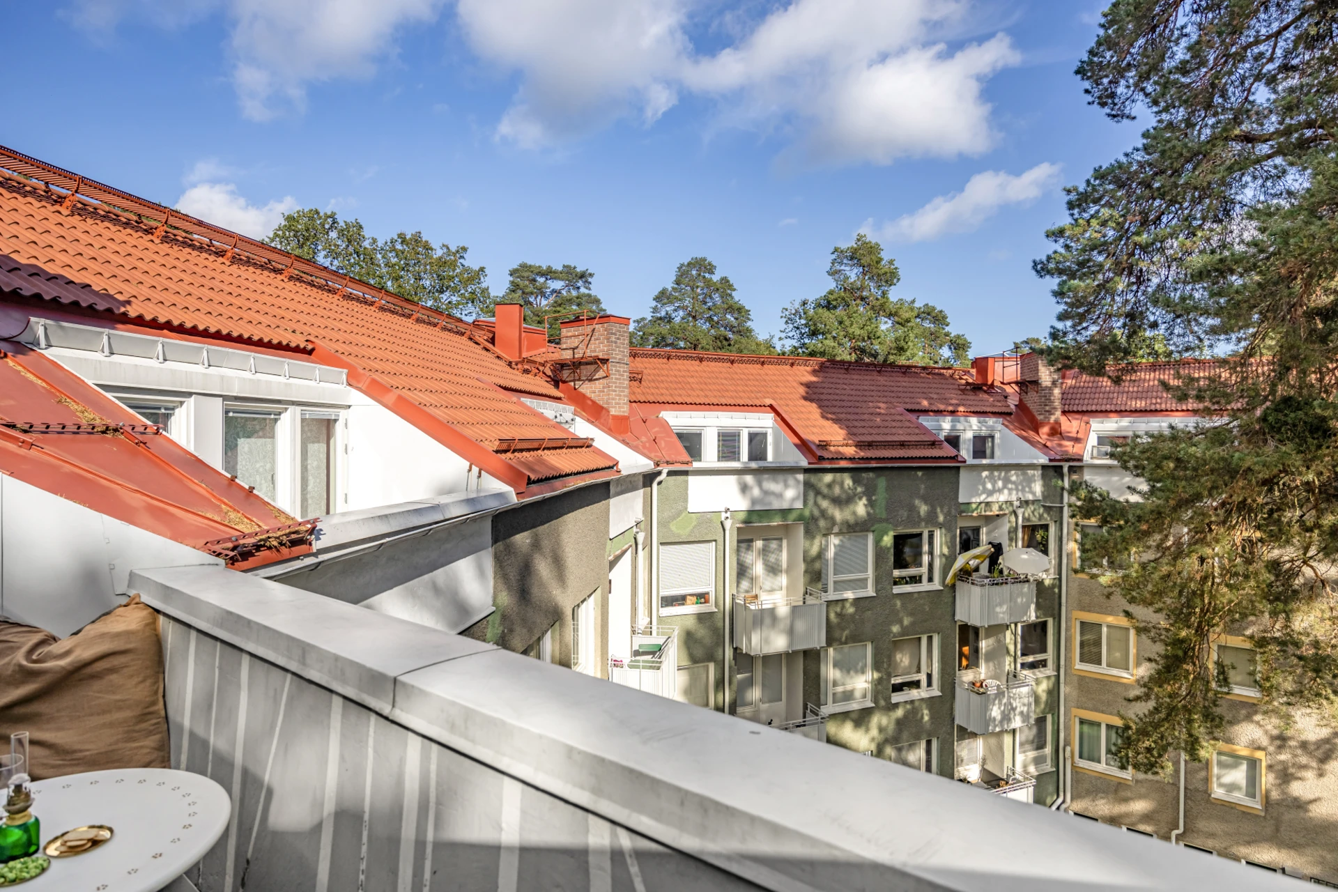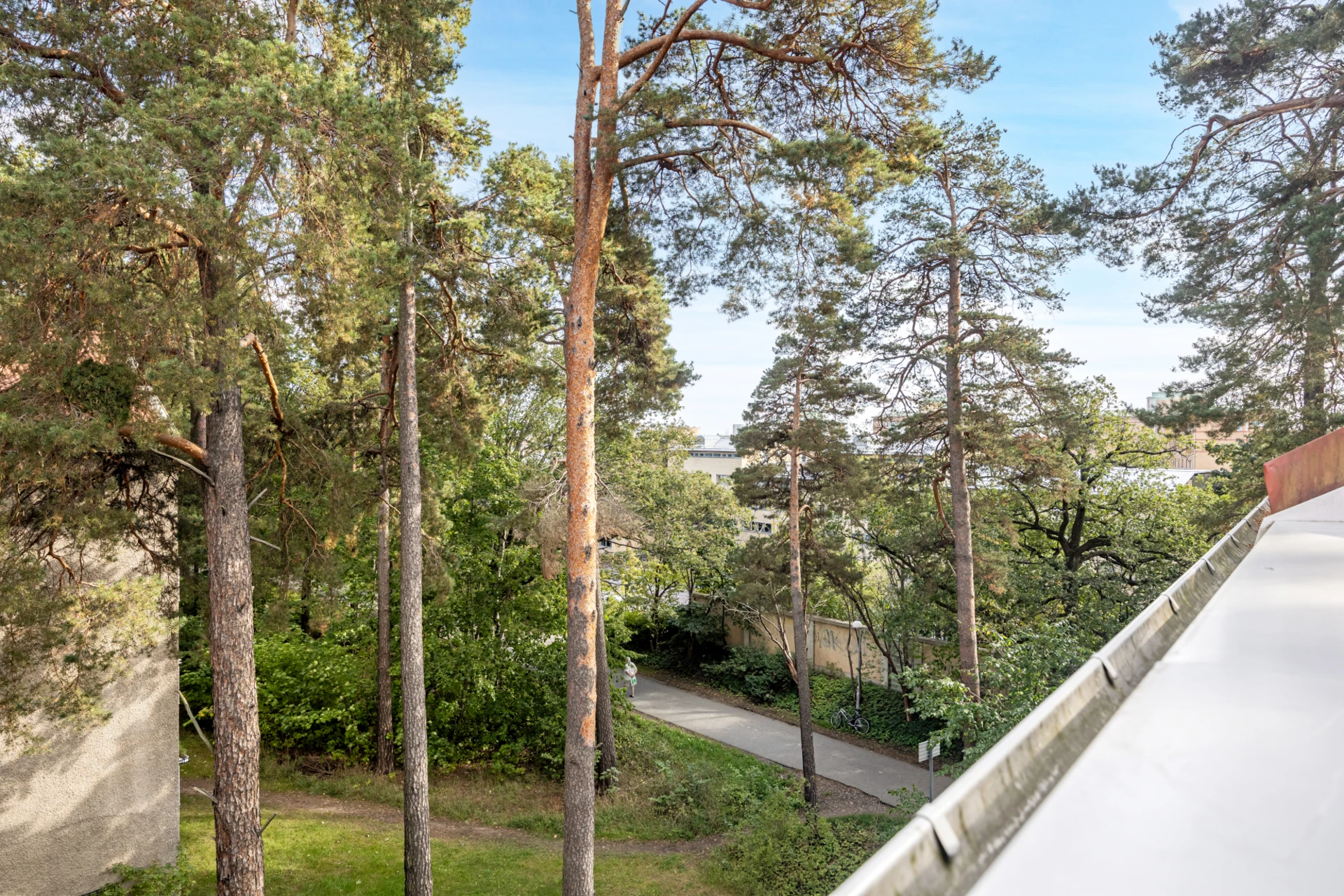 Välkommen till denna mysiga lägenhet högst upp i huset! En fantastisk terrass där du kan njuta av solen med ekorrar och fåglar som grannar bland de gamla tallarna intill. Stor innerhall som idag disponeras med en extra sovdel med takfönster. Samtliga fönster och takfönster (ej fönster vardagsrum) är renoverade och balkongdörr. Stambytt helkaklat badrum med golvvärme och tvättmaskin. Taken är omlagda i hela föreningen. Förvaringsmöjligheterna är goda med klädkammare och inbyggda garderober. Därtill finns två källarförråd.