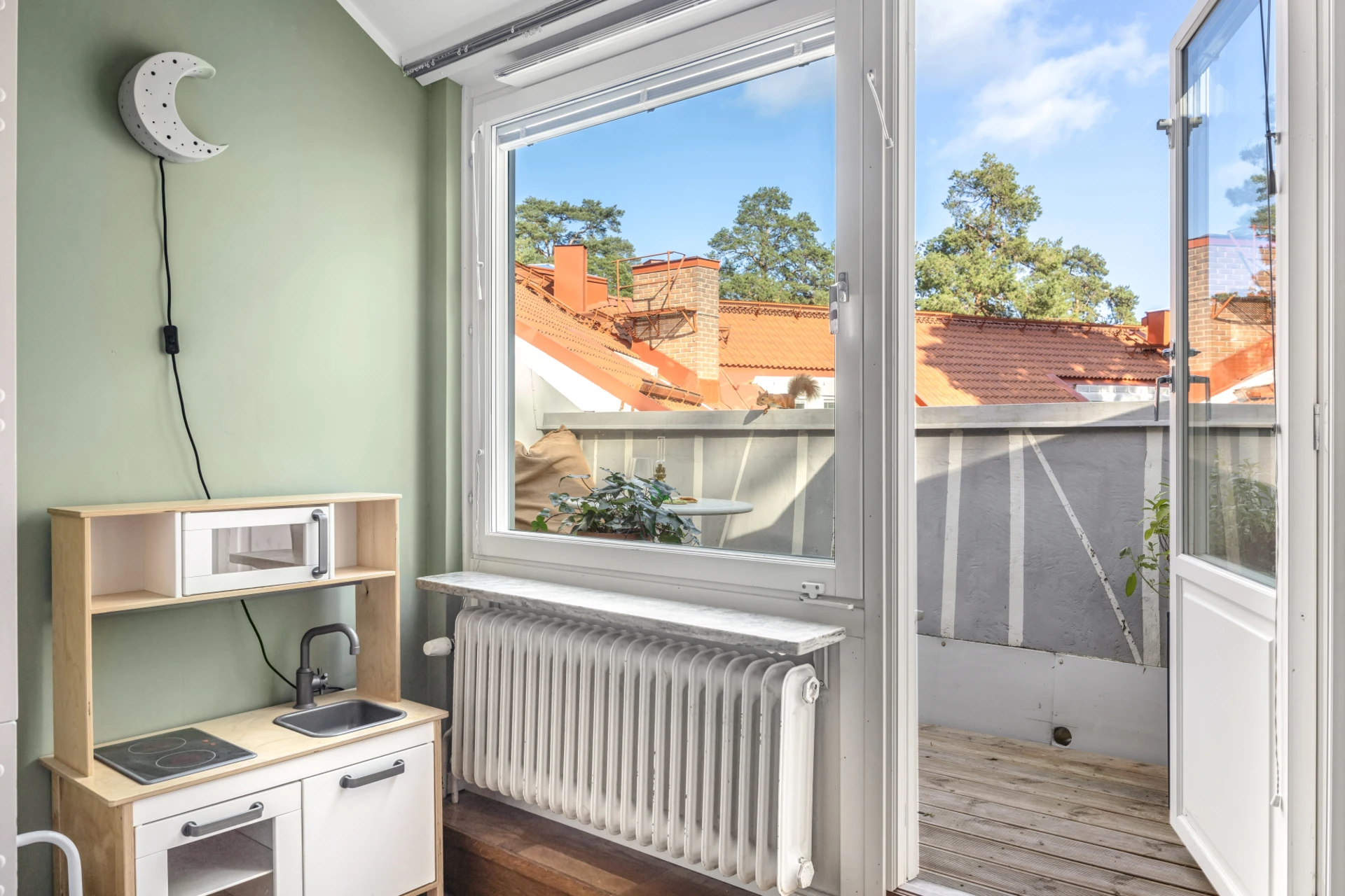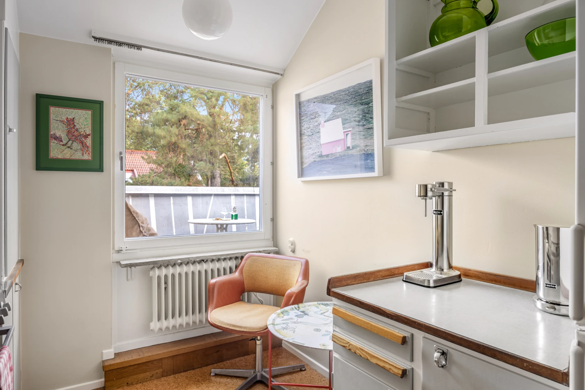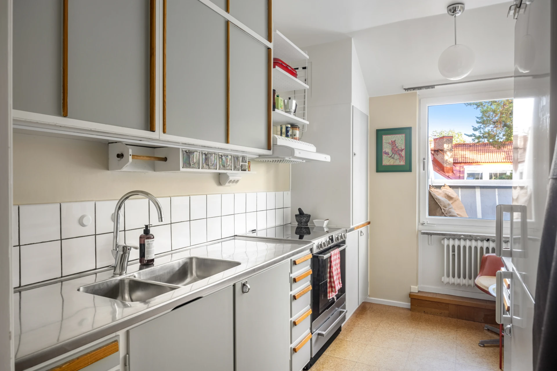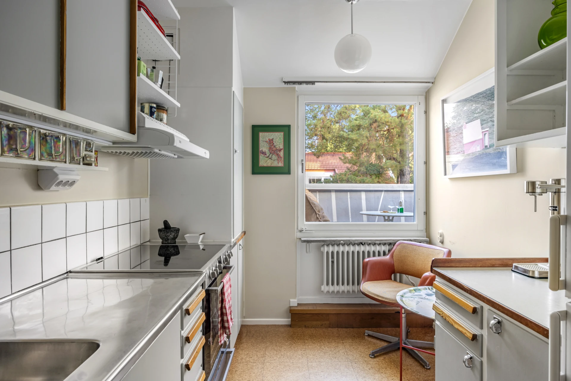Välkommen till denna mysiga lägenhet högst upp i huset! En fantastisk terrass där du kan njuta av solen med ekorrar och fåglar som grannar bland de gamla tallarna intill. Stor innerhall som idag disponeras med en extra sovdel med takfönster. Samtliga fönster och takfönster (ej fönster vardagsrum) är renoverade och balkongdörr. Stambytt helkaklat badrum med golvvärme och tvättmaskin. Taken är omlagda i hela föreningen. Förvaringsmöjligheterna är goda med klädkammare och inbyggda garderober. Därtill finns två källarförråd.