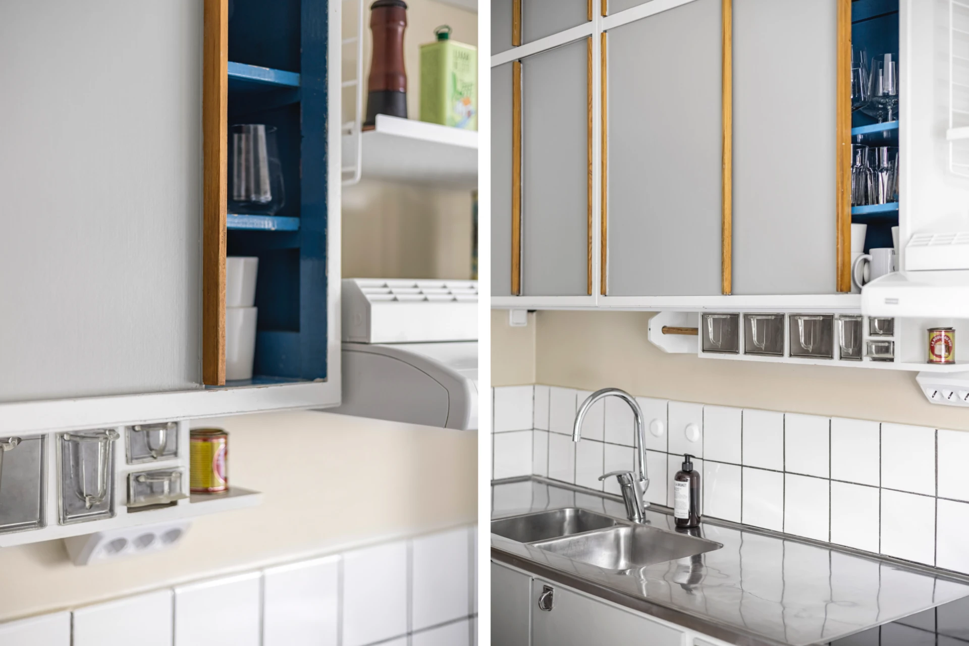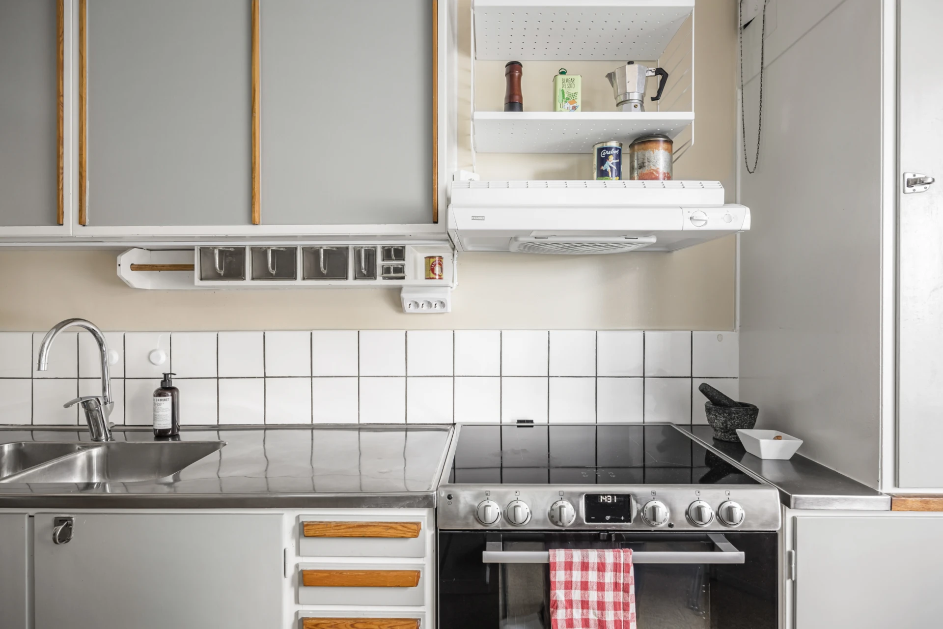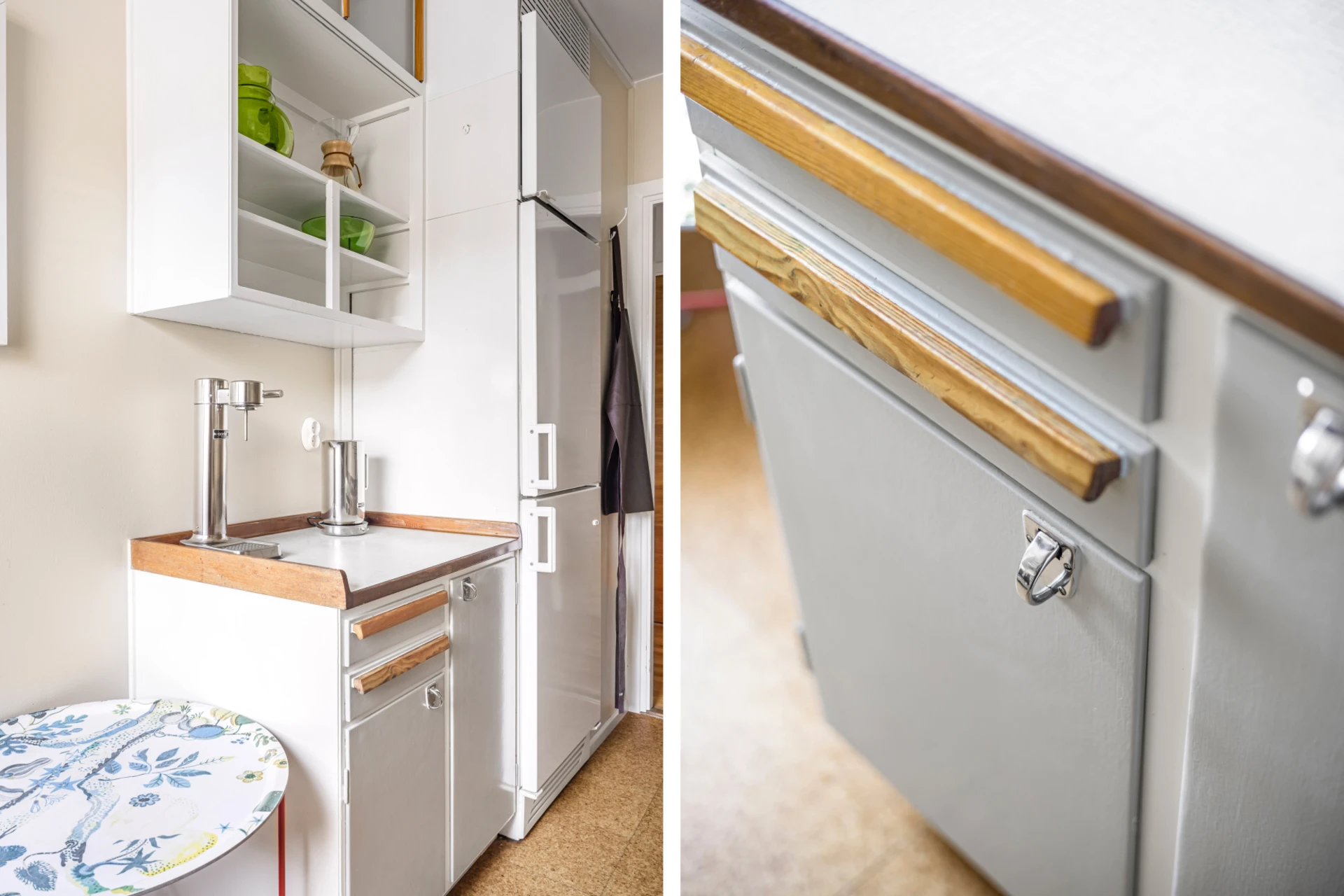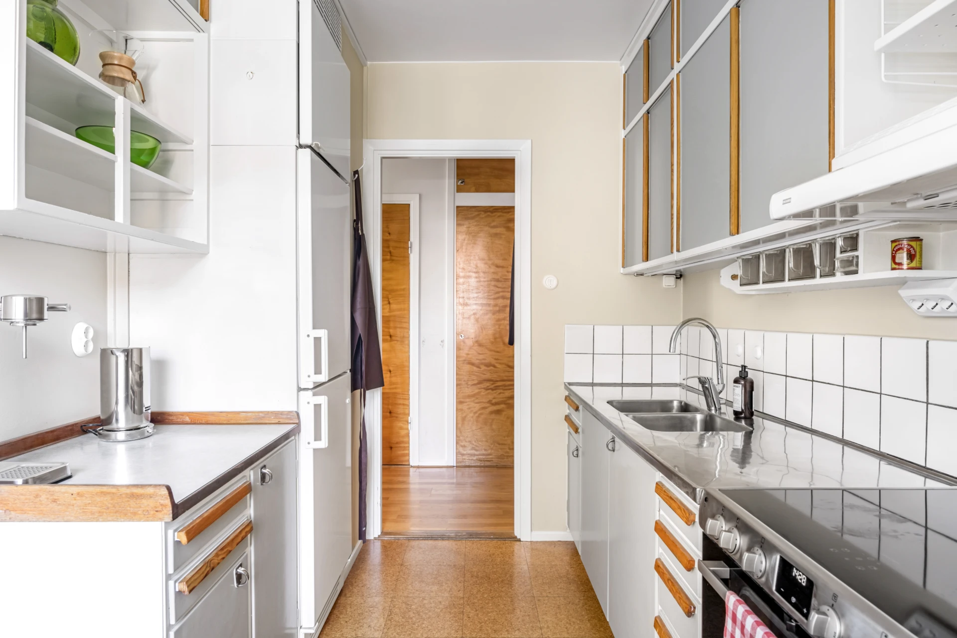 Ljust korkgolv i original med plast över, samt ljusa väggar. Ljus köksinredning i original med skjutluckor. Bänkskiva i trä och rostfri diskbänk med diskho. Vitt liggande kakel ovan arbetsytor. Kyl/frys, ugn med häll och fläktkåpa. Utrymme för matplats.