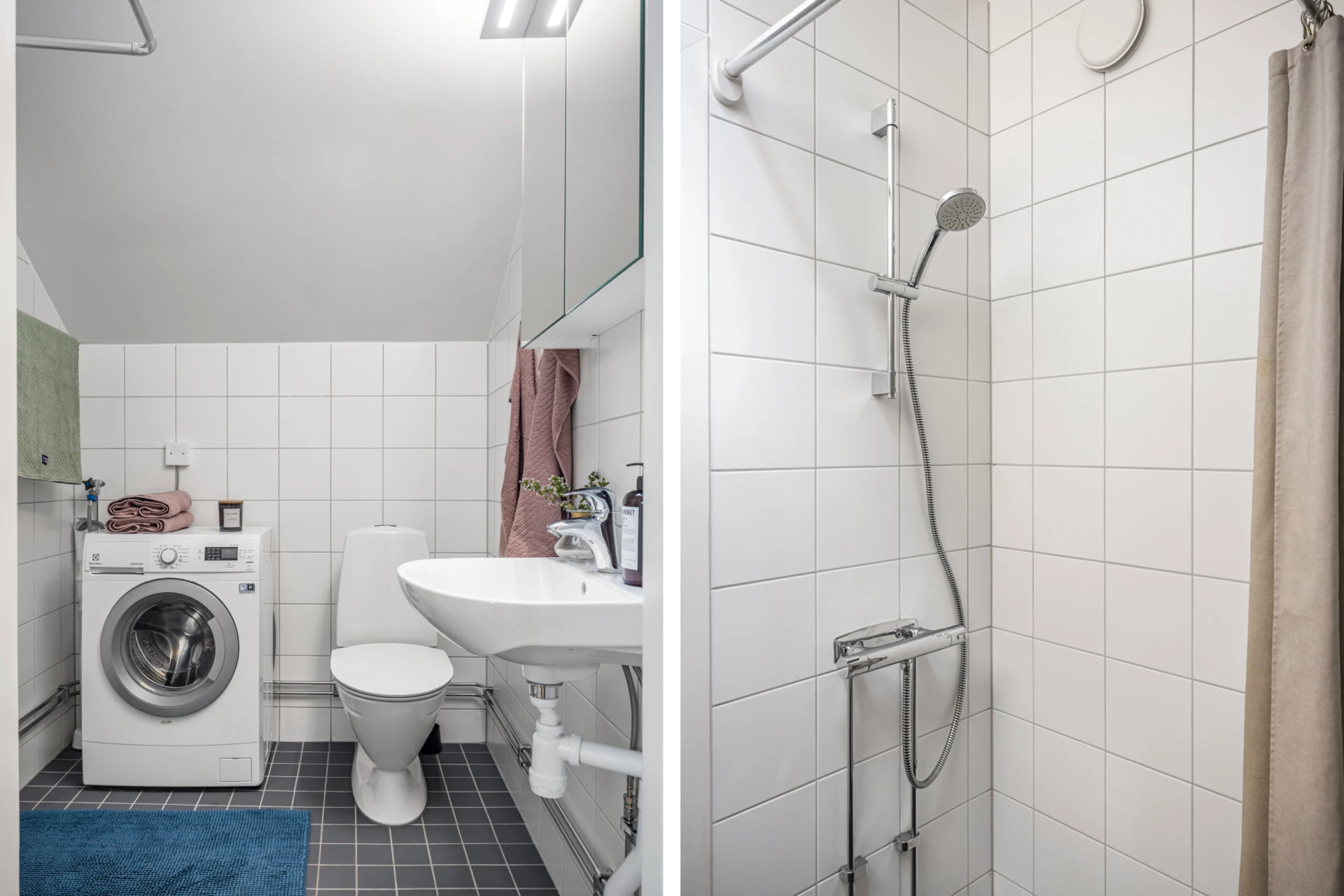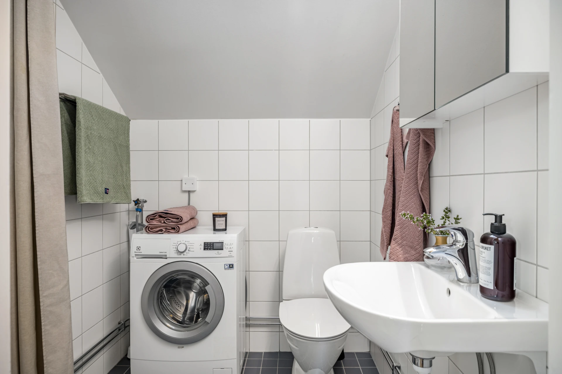 Klinkergolv i grå nyans och vitkaklade väggar. Handfat, spegelskåp, toalett, tvättmaskin samt dusch.