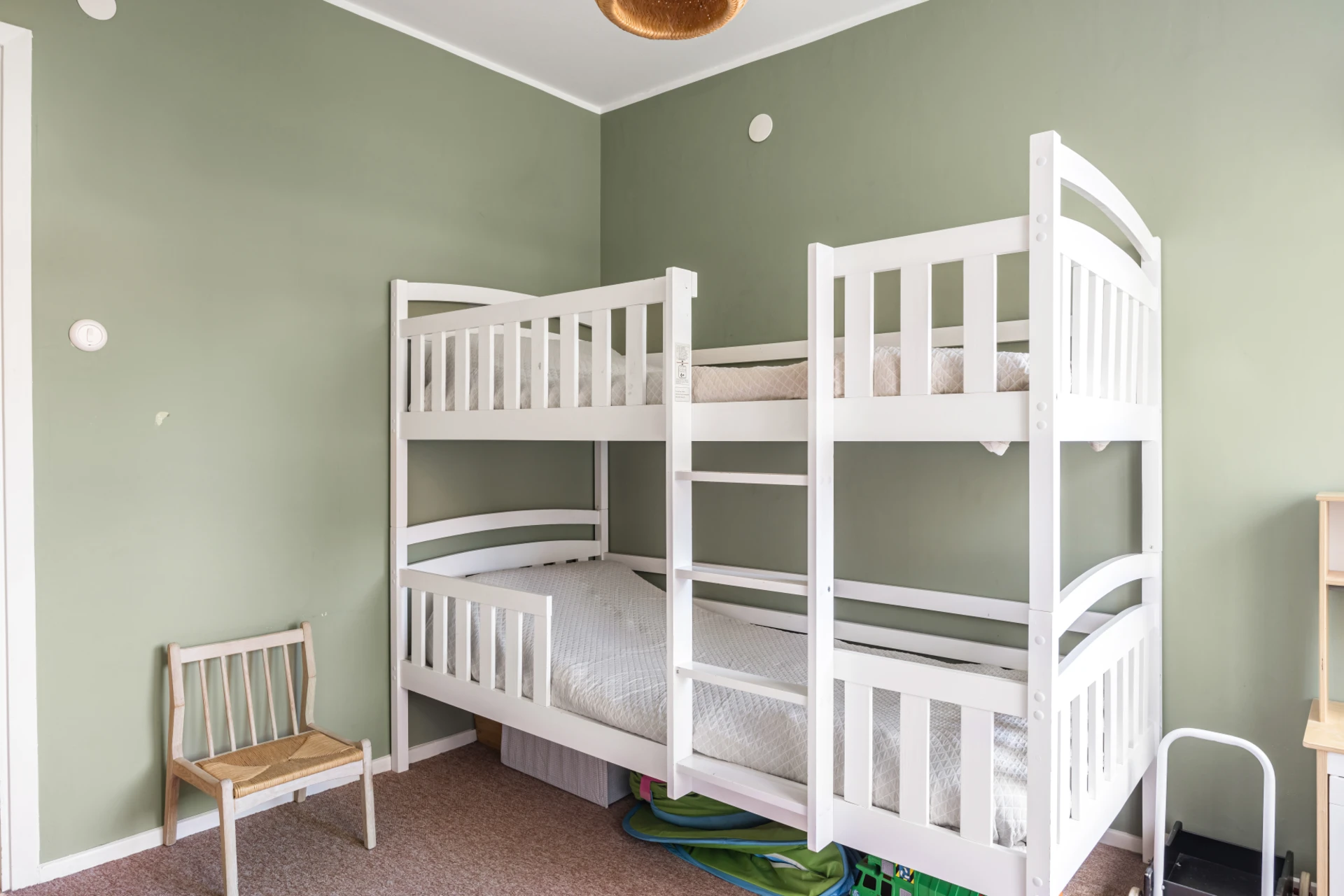 Ljust parkettgolv och ljusa väggar. Plats för avhängning. Två platsbyggda garderober med överskåp och stor klädkammare/ förråd.