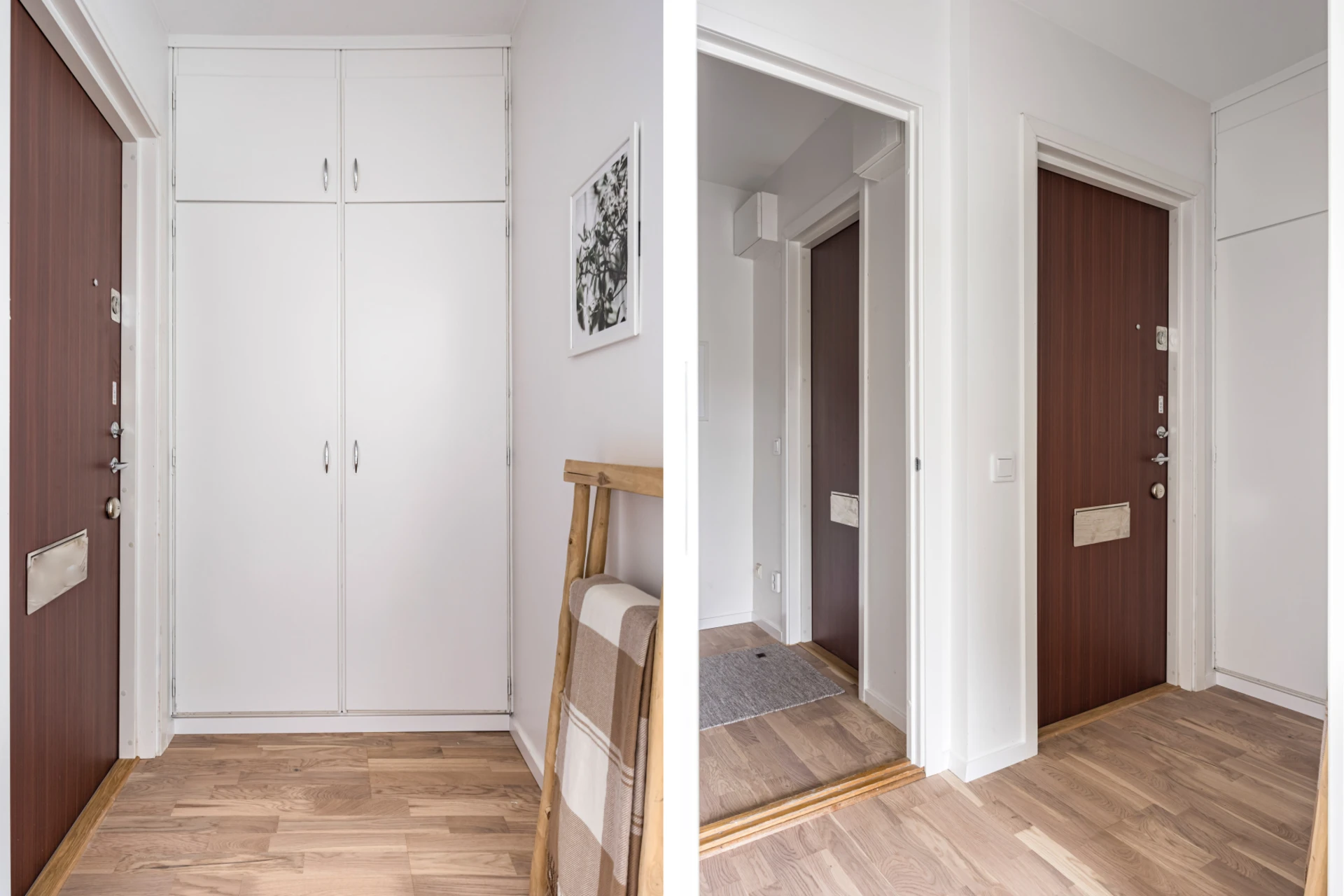 Välkomnande hall med ingång från två håll. Ljust golv och ljusa väggar. Plats för avhängning samt annan önskad möblering som till exempel en byrå. Garderober med god förvaring.