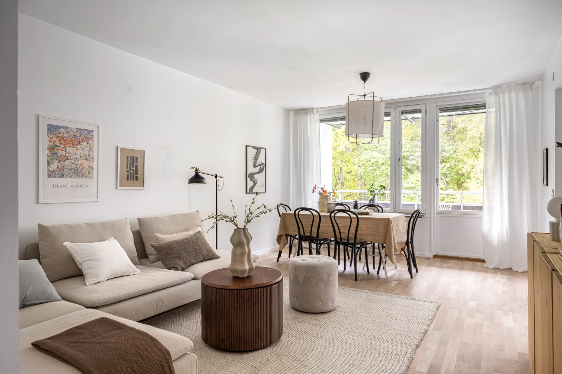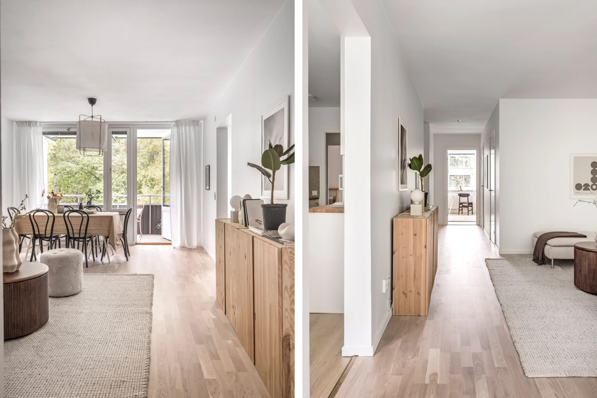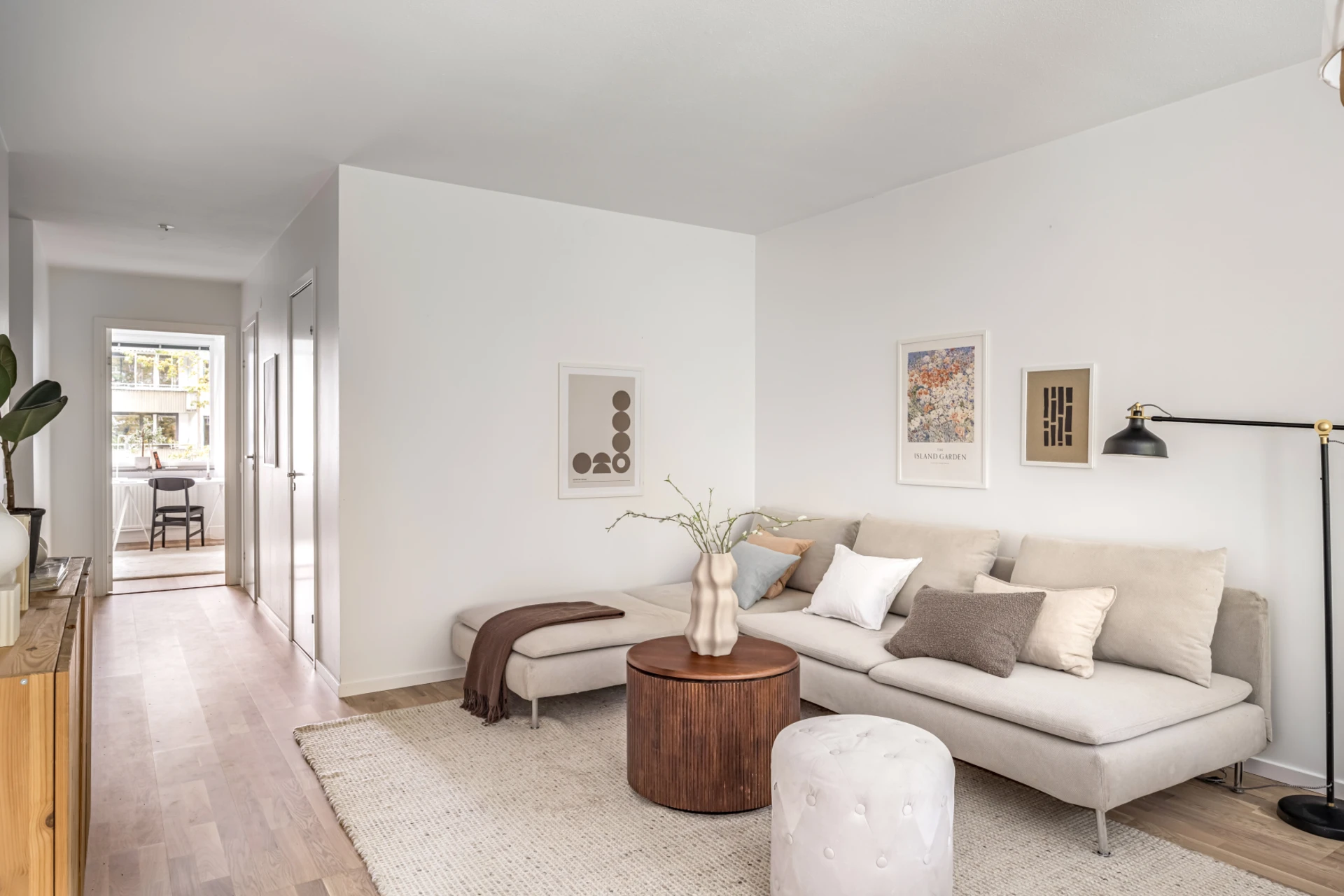 Ljust golv och ljusa väggar. Plats för soffa, soffbord och matgrupp. Utgång till balkong.