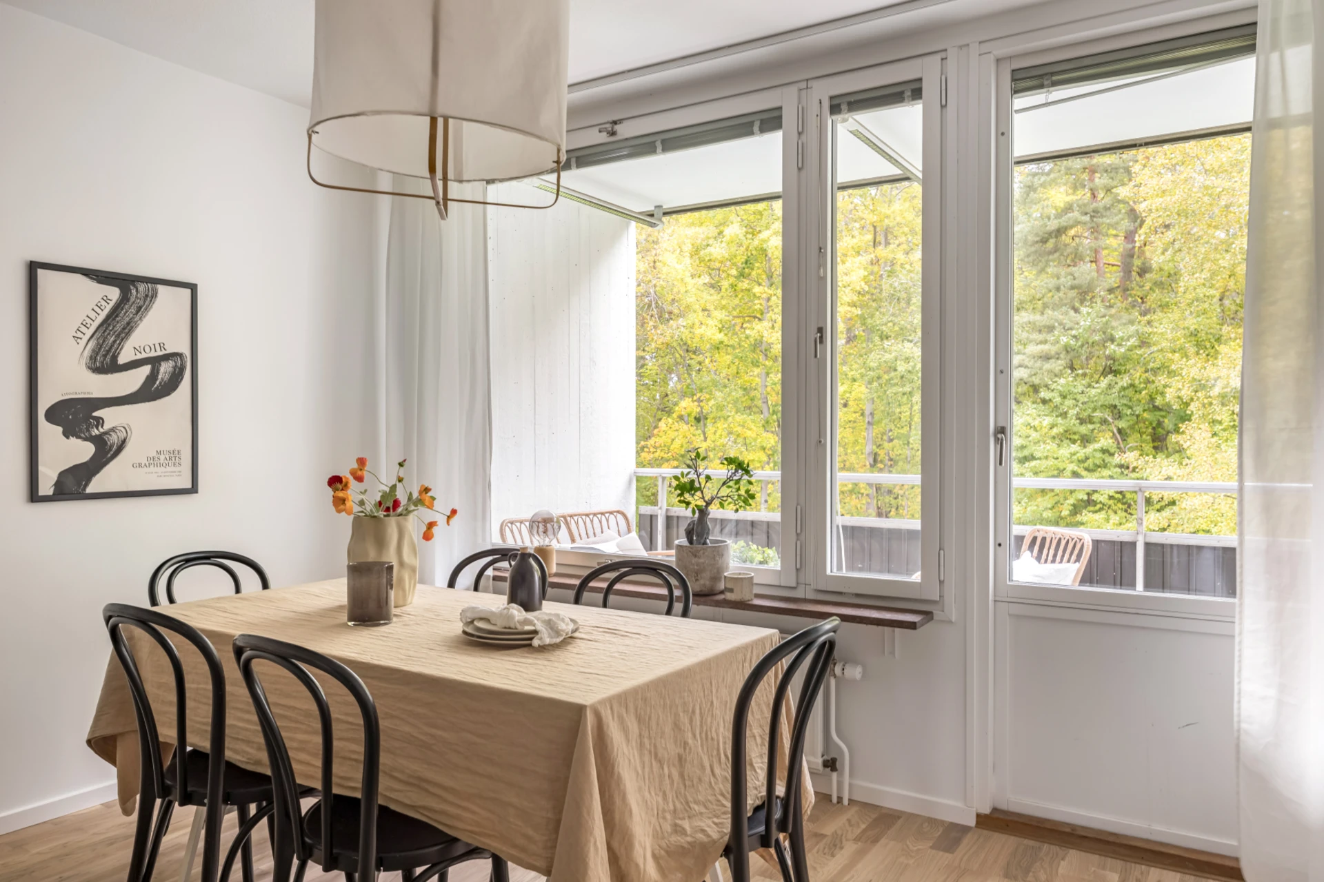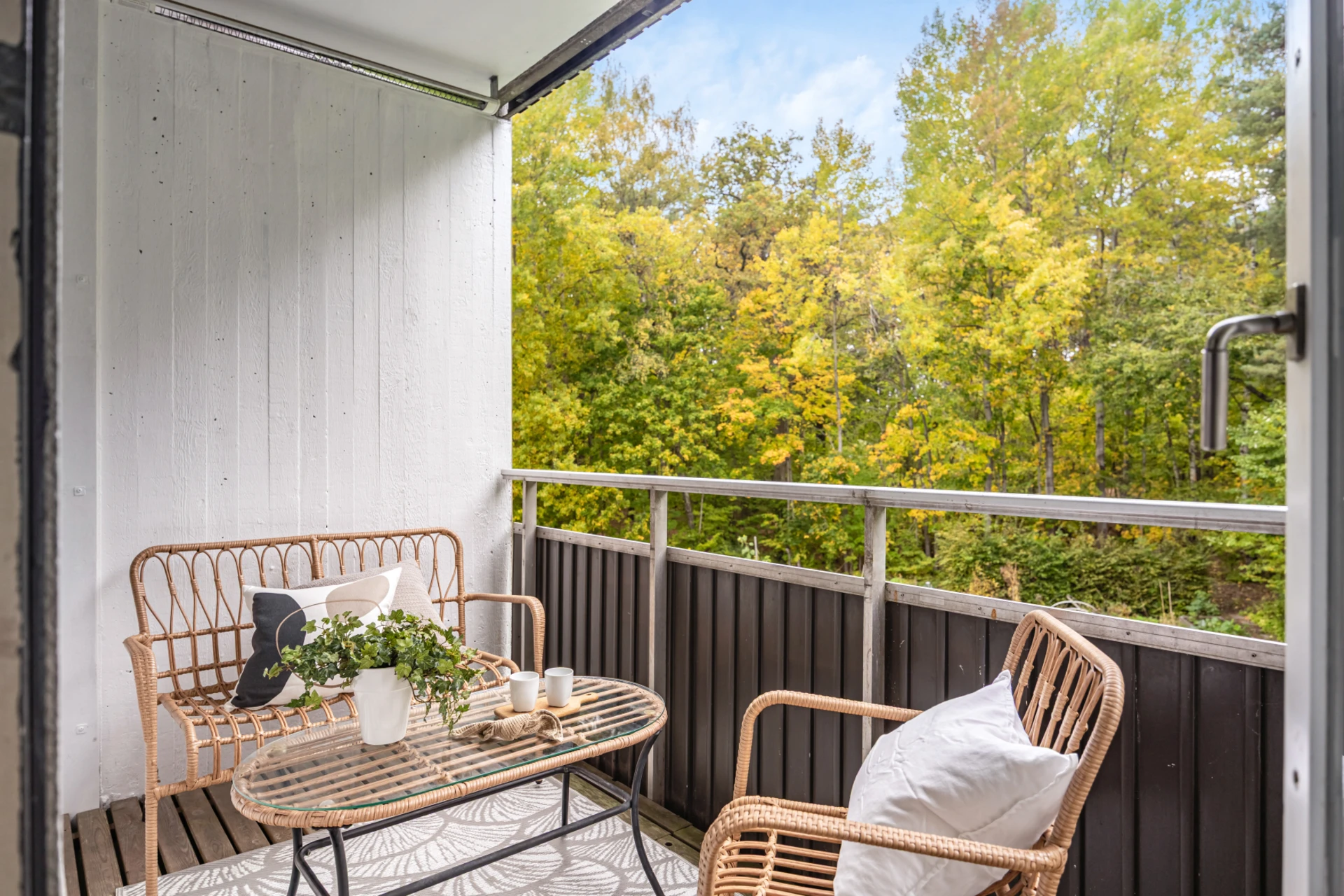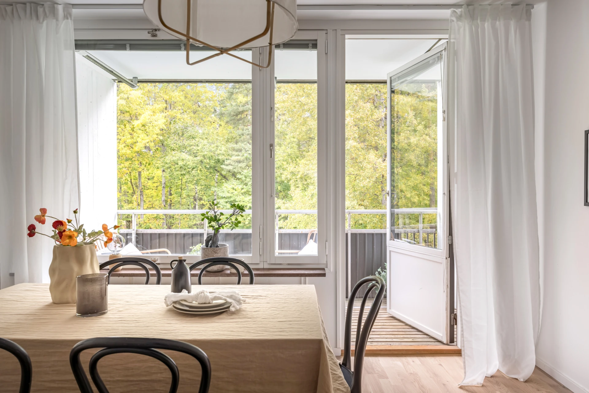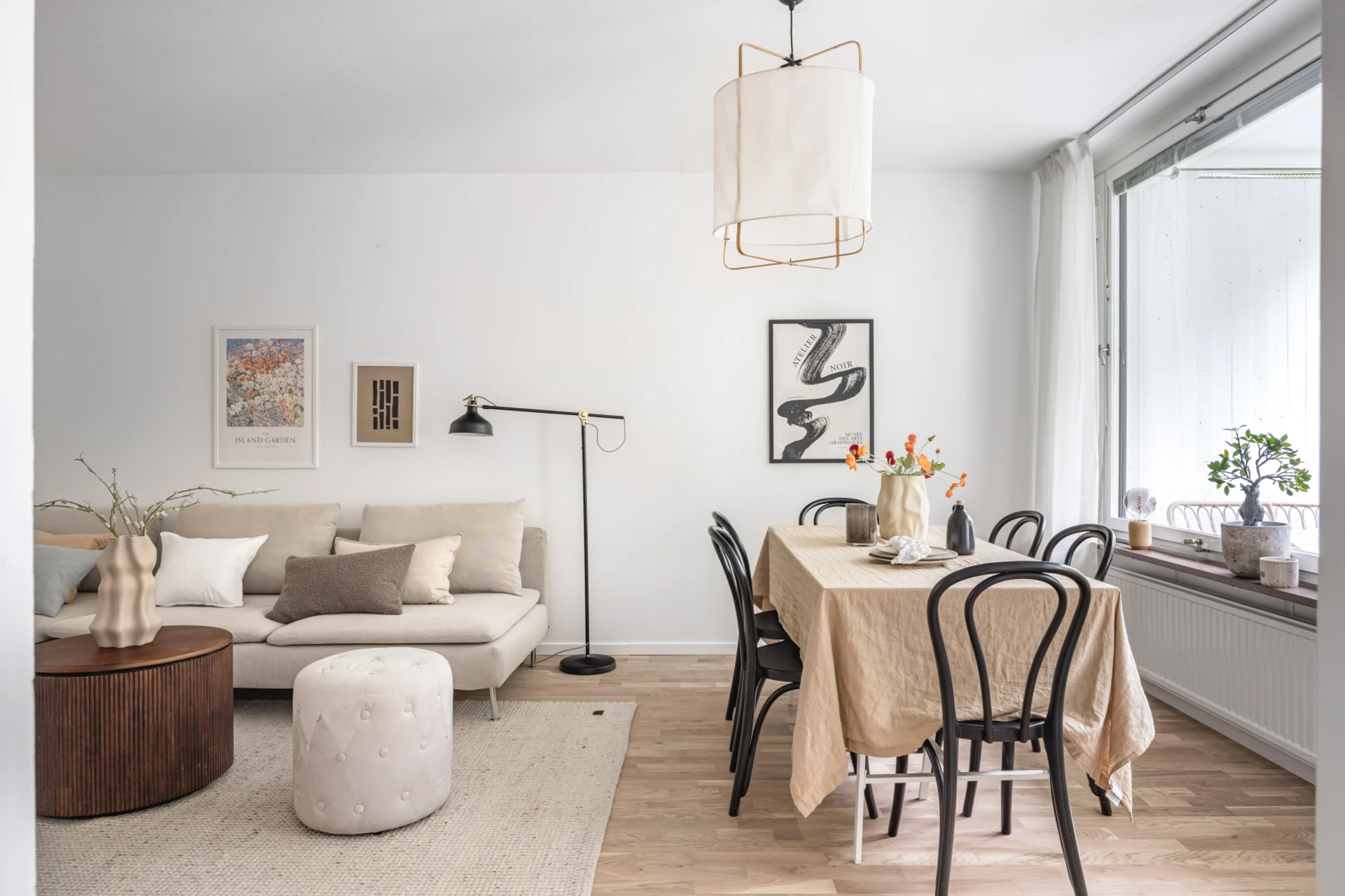 Ljust golv och ljusa väggar. Plats för soffa, soffbord och matgrupp. Utgång till balkong.