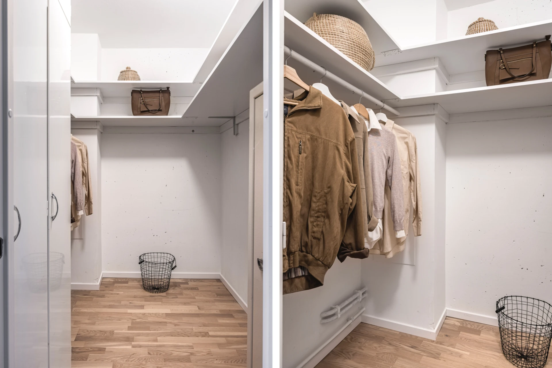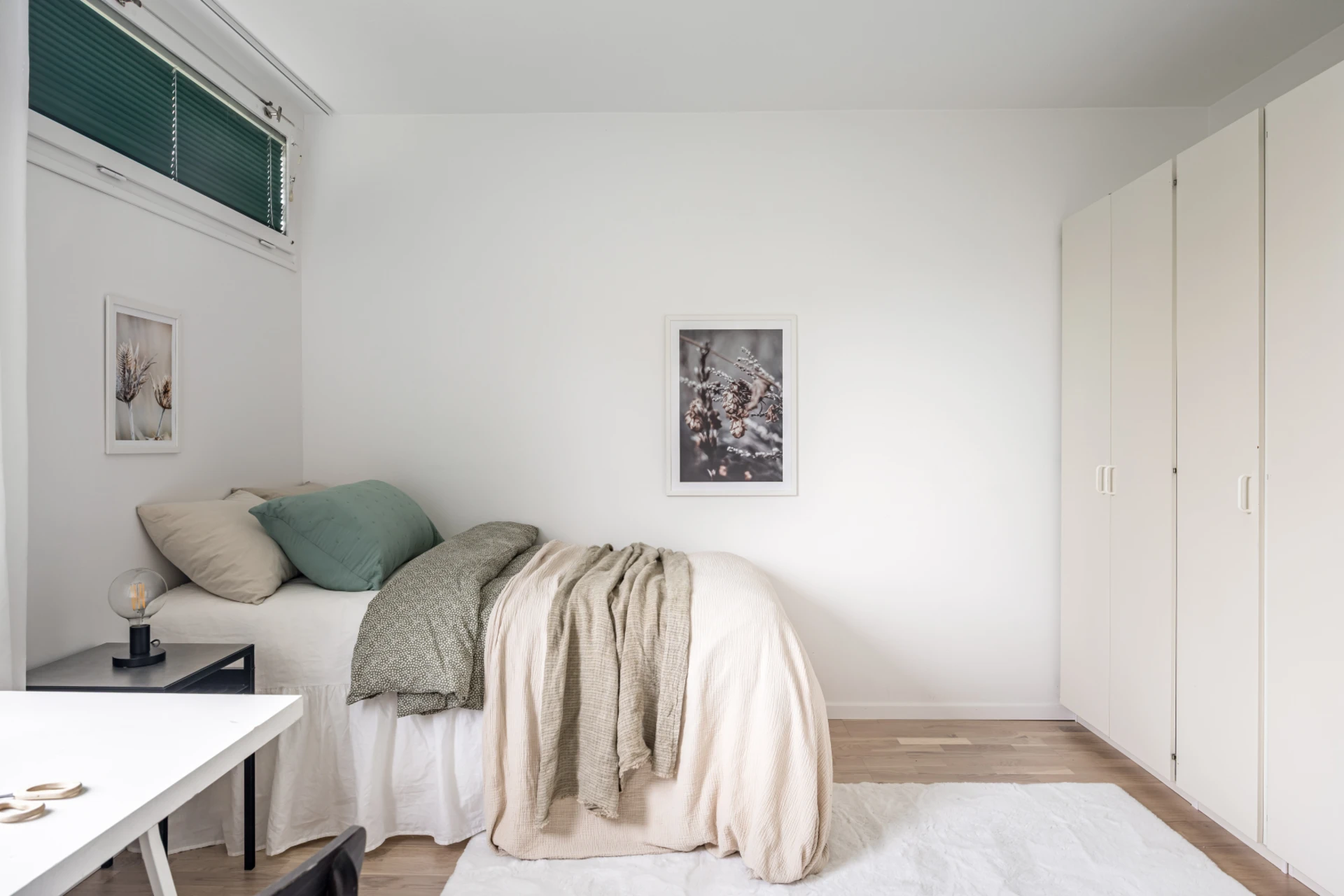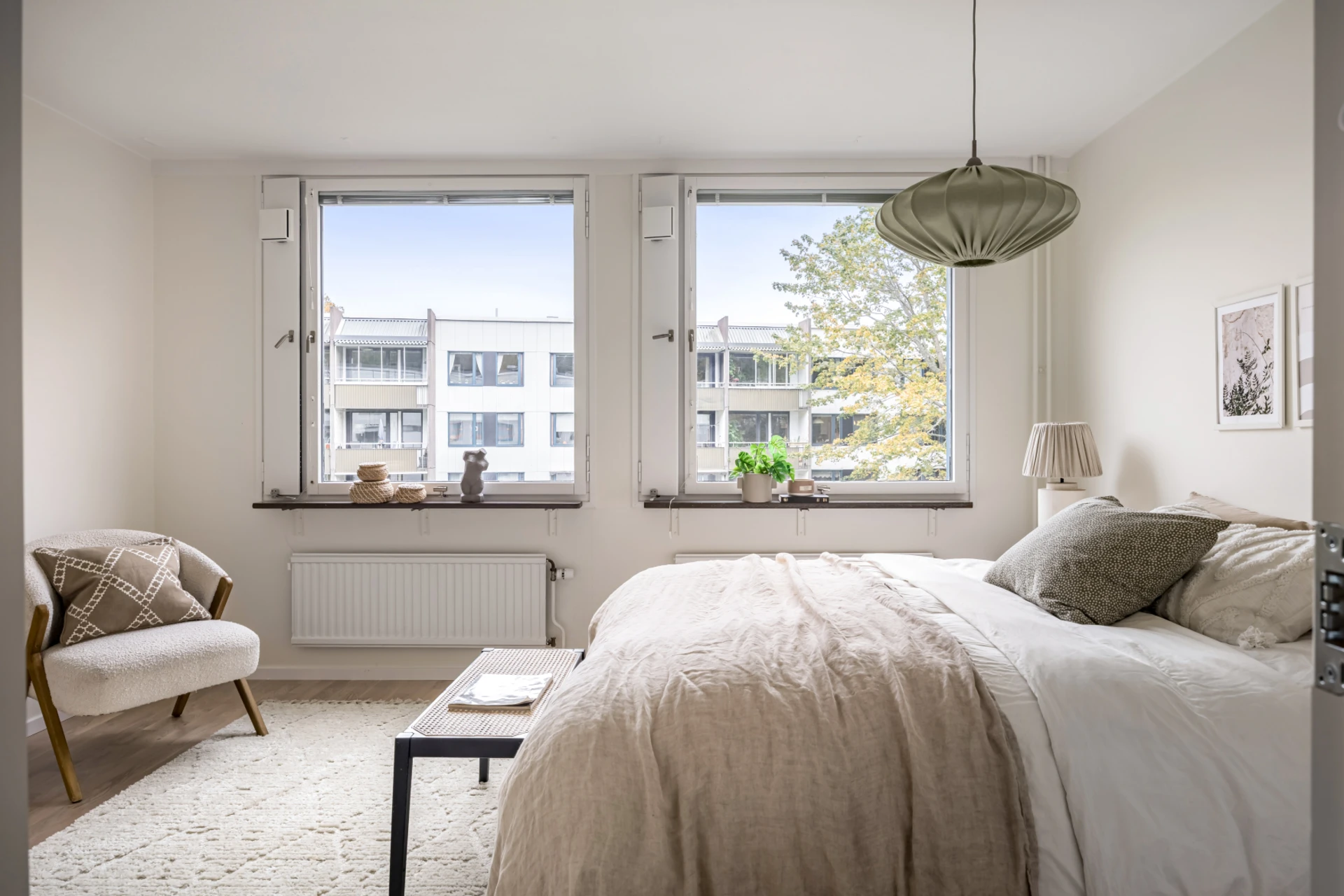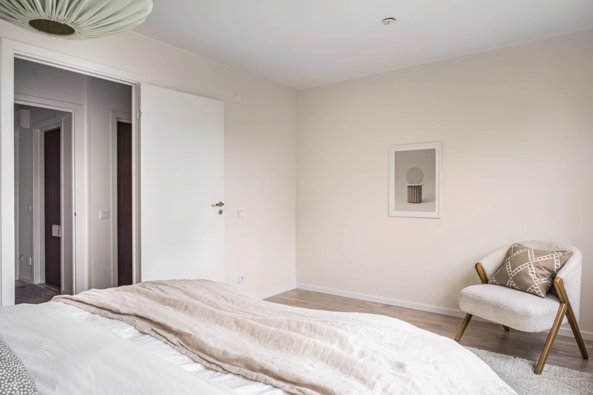 Rymligt sovrum med ljust golv och ljusa väggar. Plats för dubbelsäng, sängbord och skrivbord. Garderober med godförvaring.