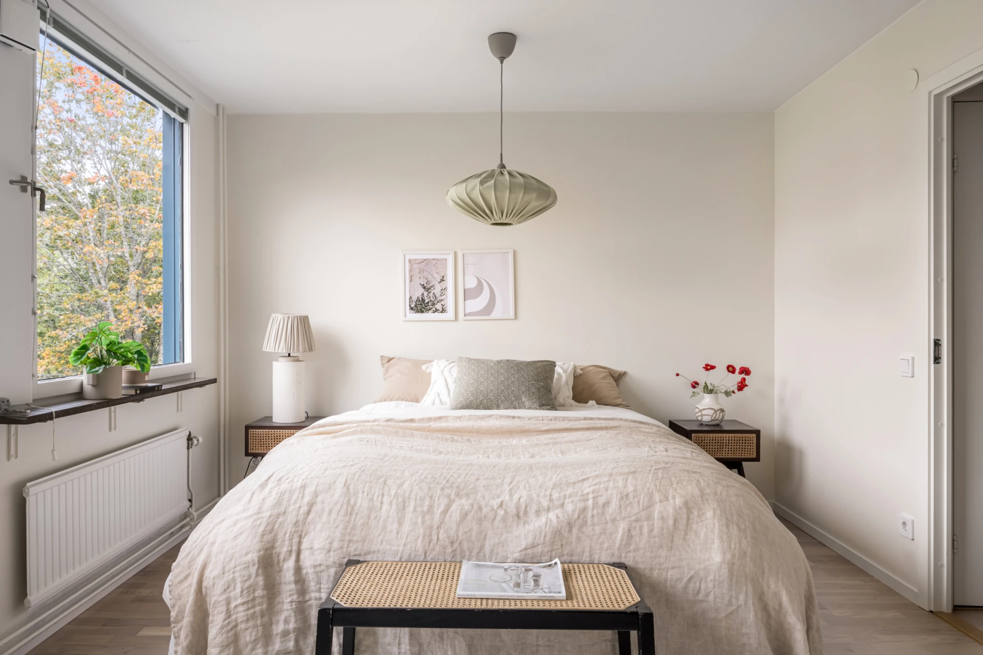 Rymligt sovrum med ljust golv och ljusa väggar. Plats för dubbelsäng, sängbord och garderober.