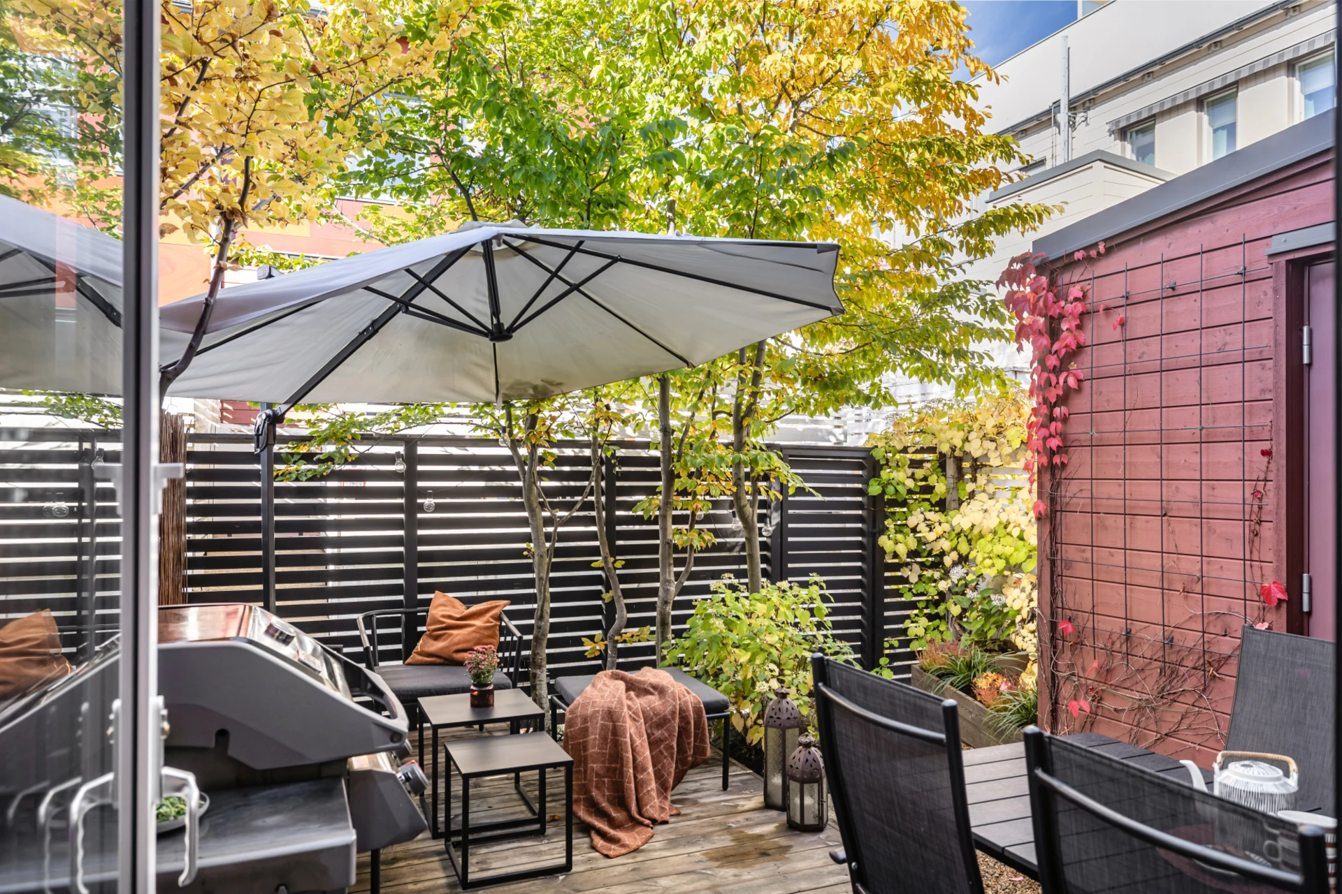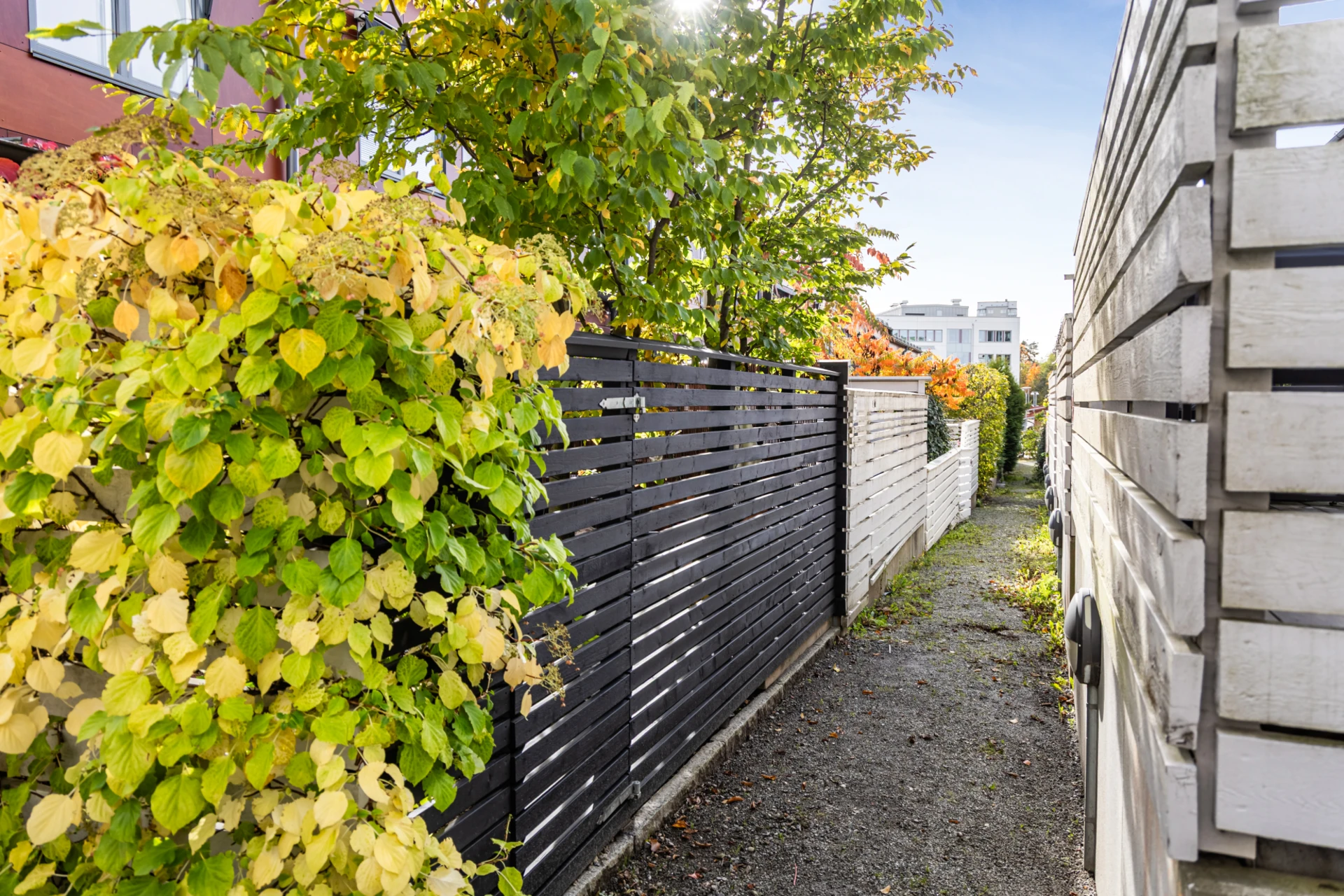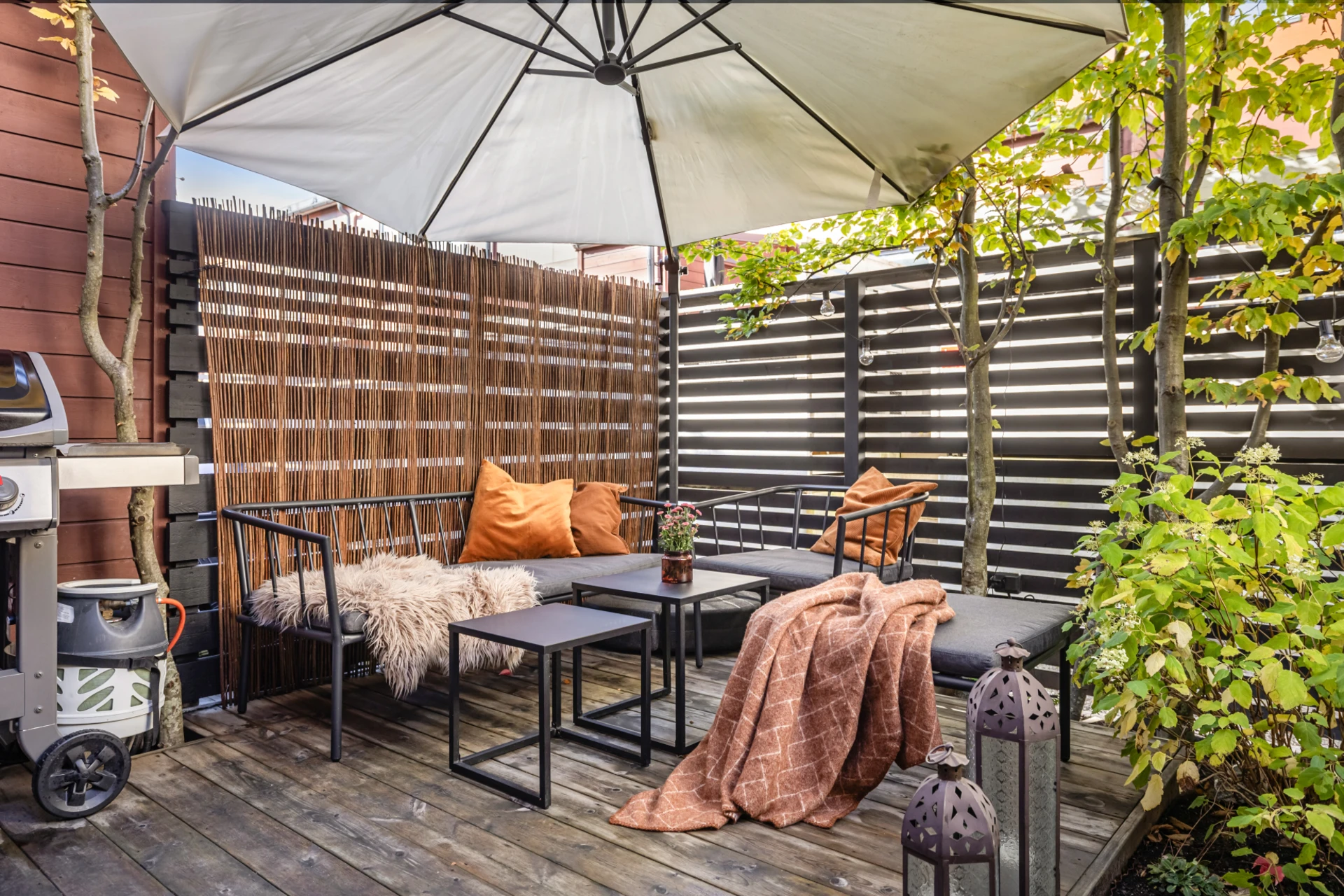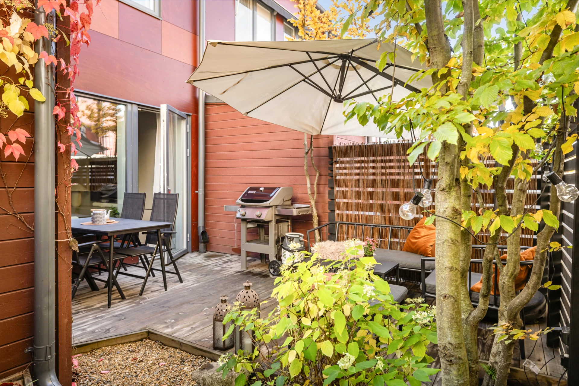 Mysig uteplats i lugnt läge med genomtänkt planering. Majoriteten av uteplatsen har trall och bryts av utav mysig grusgång. Här ryms matgrupp, loungegrupp, grill och planteringar. Gott om förvaring i förråd. I planket har säljarna låtit bygga en grind.