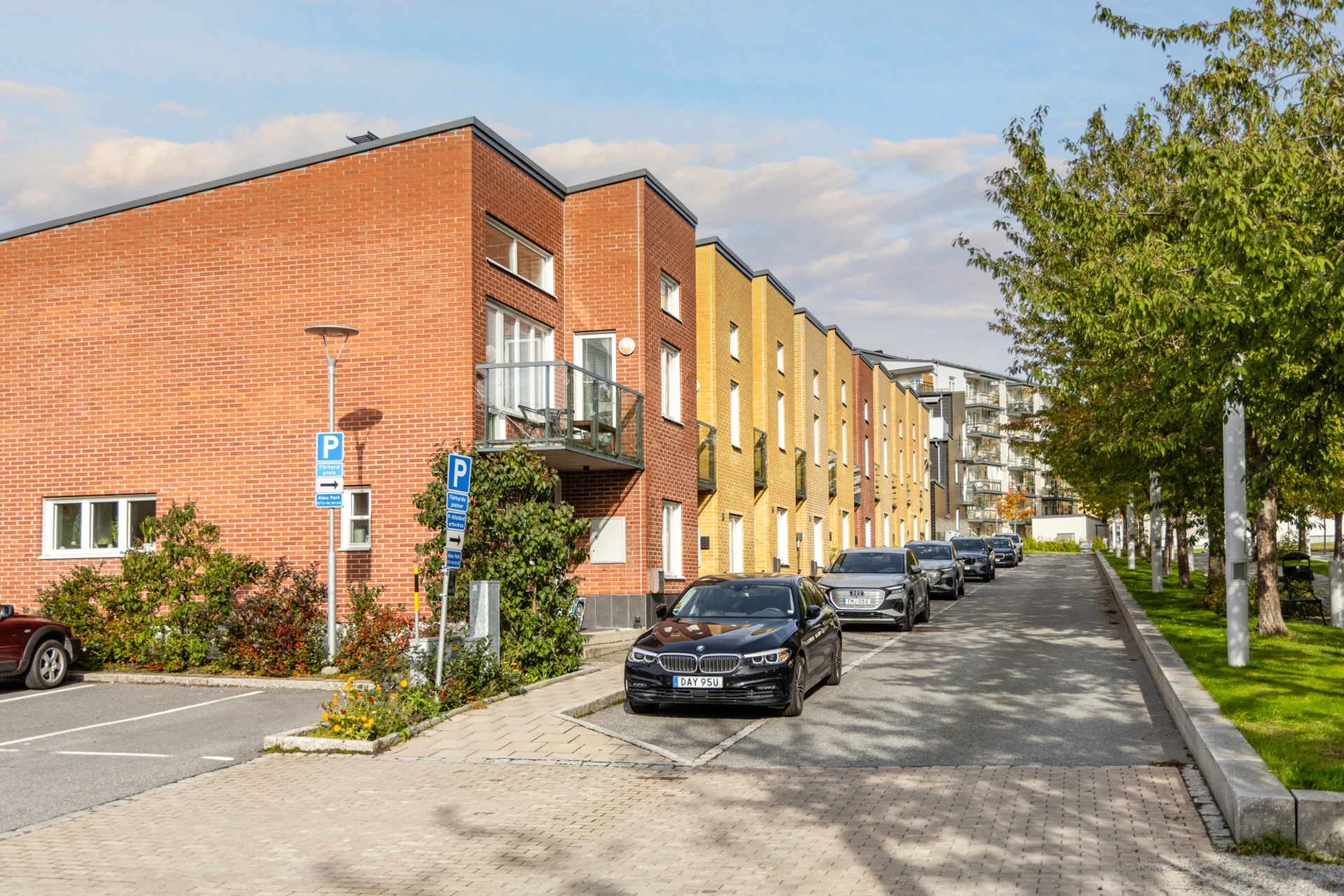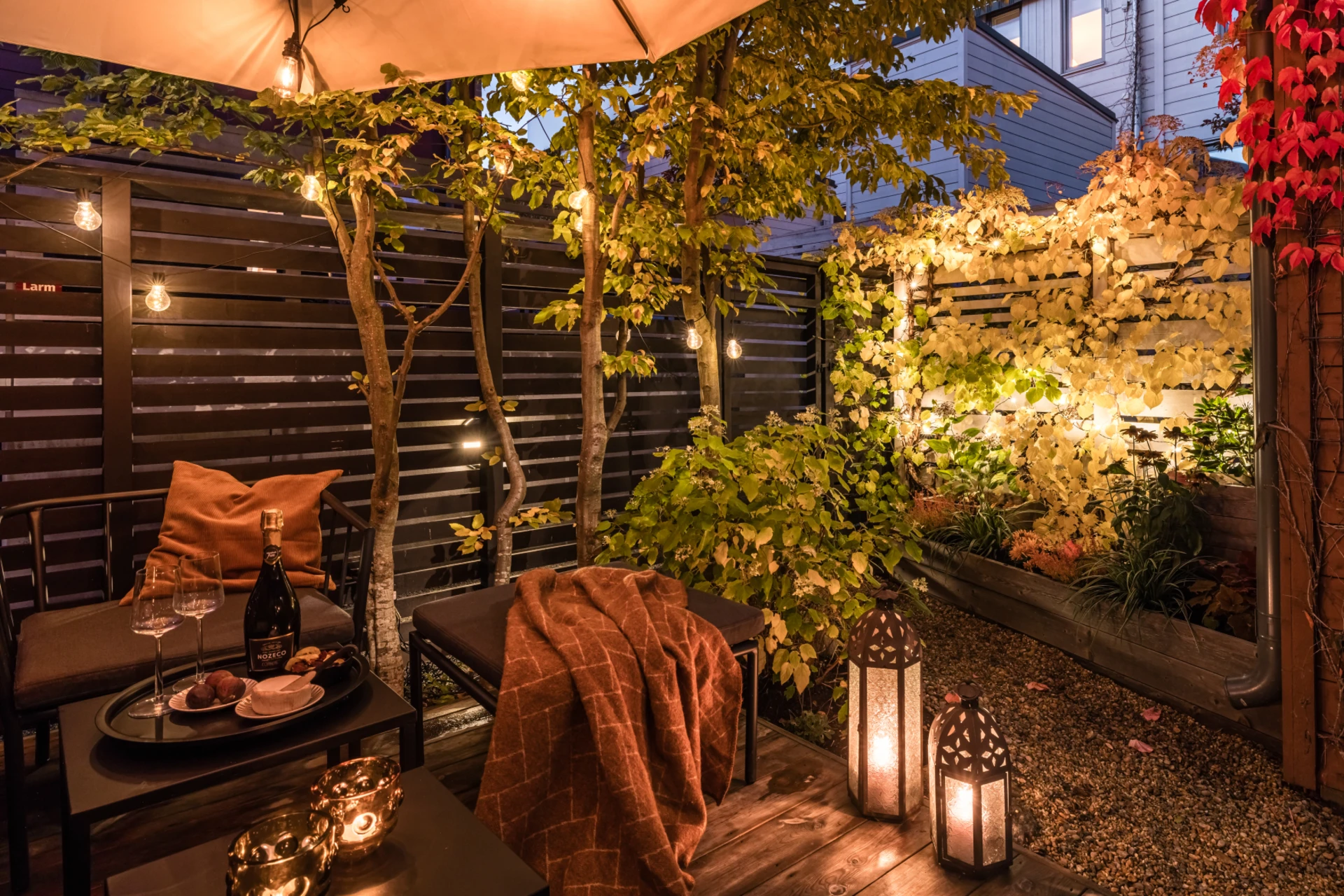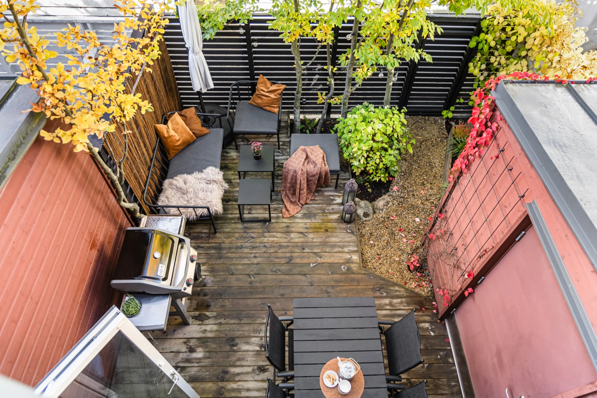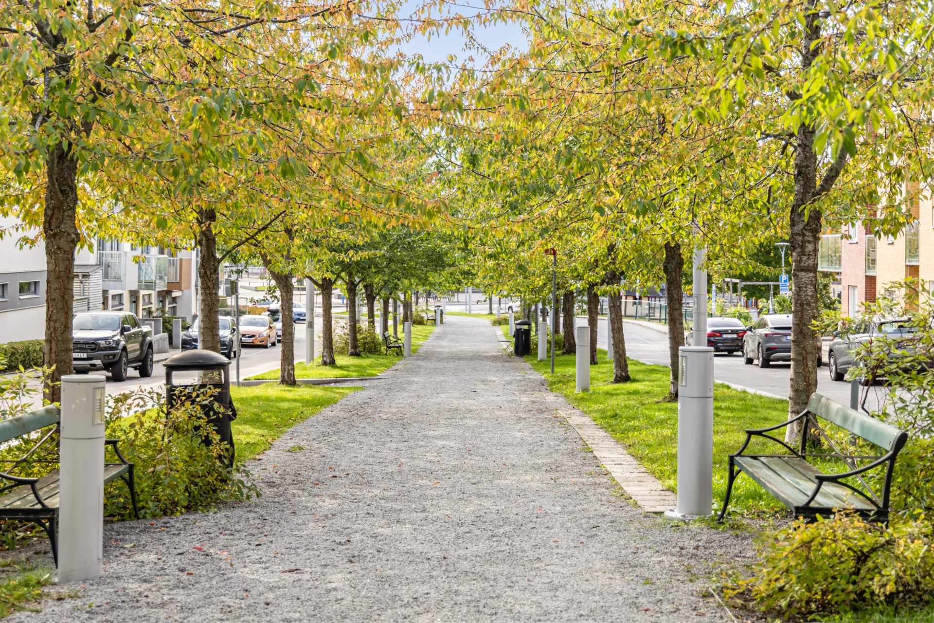 Mysig uteplats i lugnt läge med genomtänkt planering. Majoriteten av uteplatsen har trall och bryts av utav mysig grusgång. Här ryms matgrupp, loungegrupp, grill och planteringar. Gott om förvaring i förråd. I planket har säljarna låtit bygga en grind.