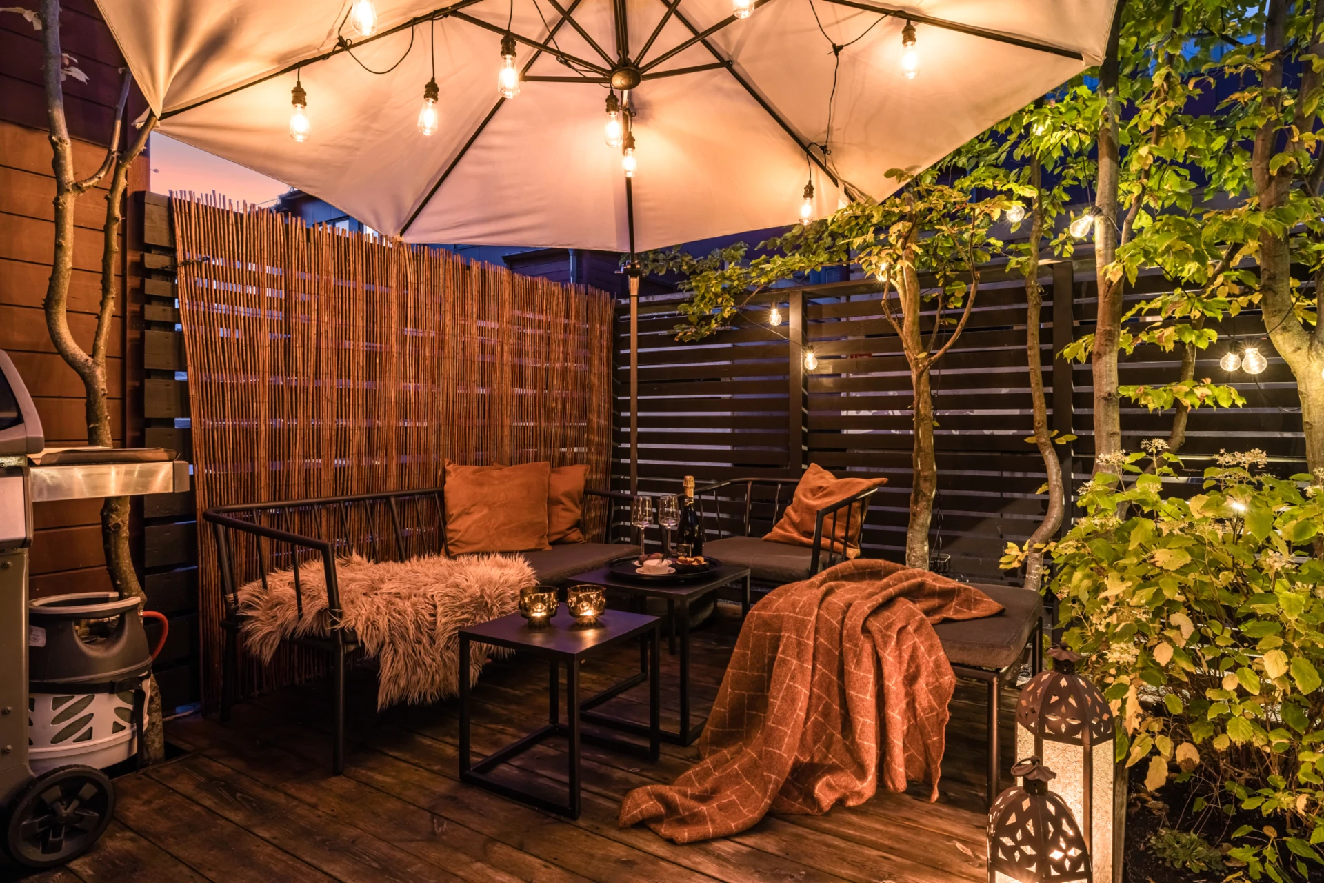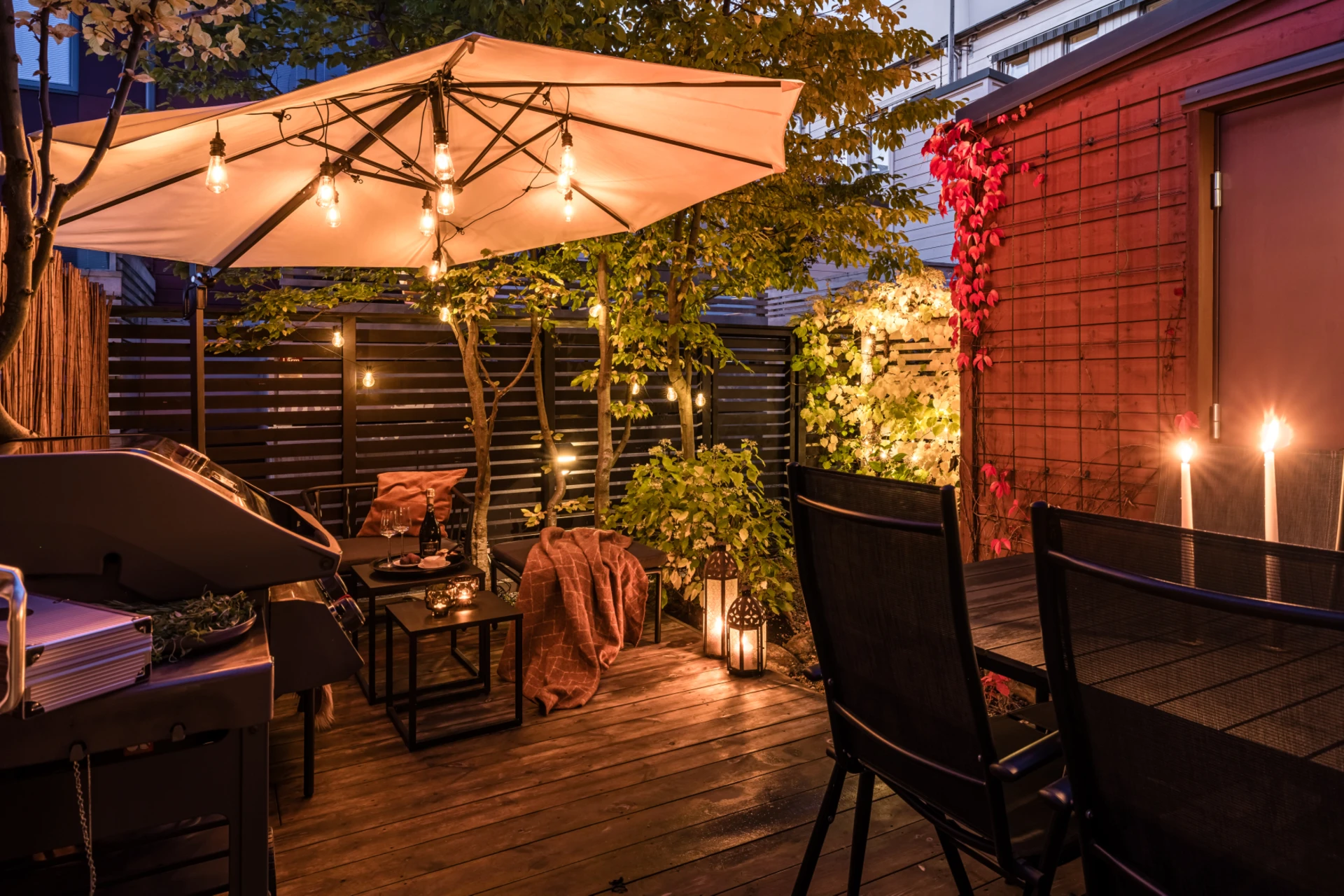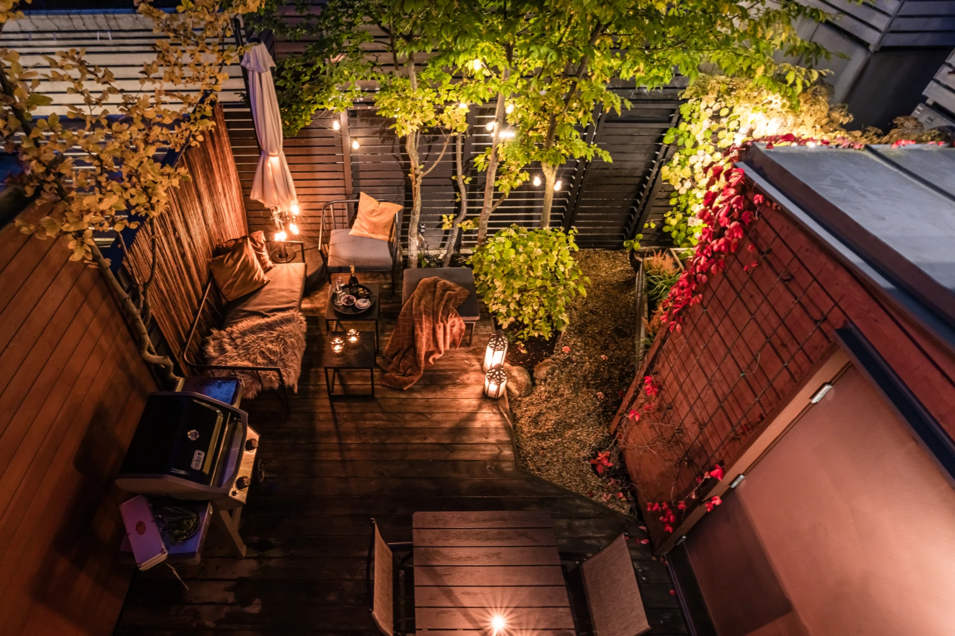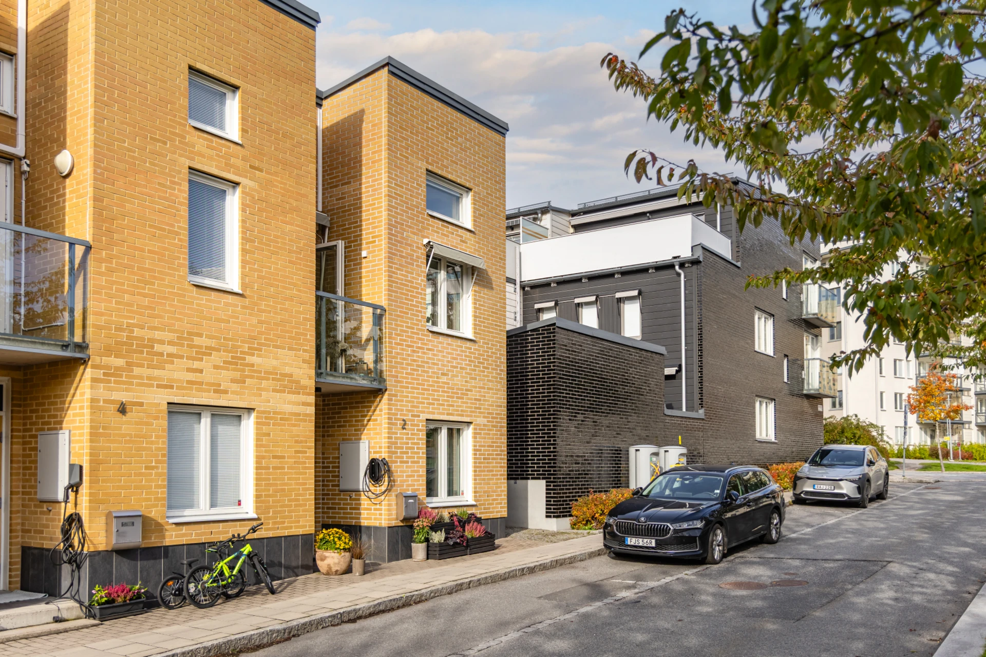 Mysig uteplats i lugnt läge med genomtänkt planering. Majoriteten av uteplatsen har trall och bryts av utav mysig grusgång. Här ryms matgrupp, loungegrupp, grill och planteringar. Gott om förvaring i förråd. I planket har säljarna låtit bygga en grind.