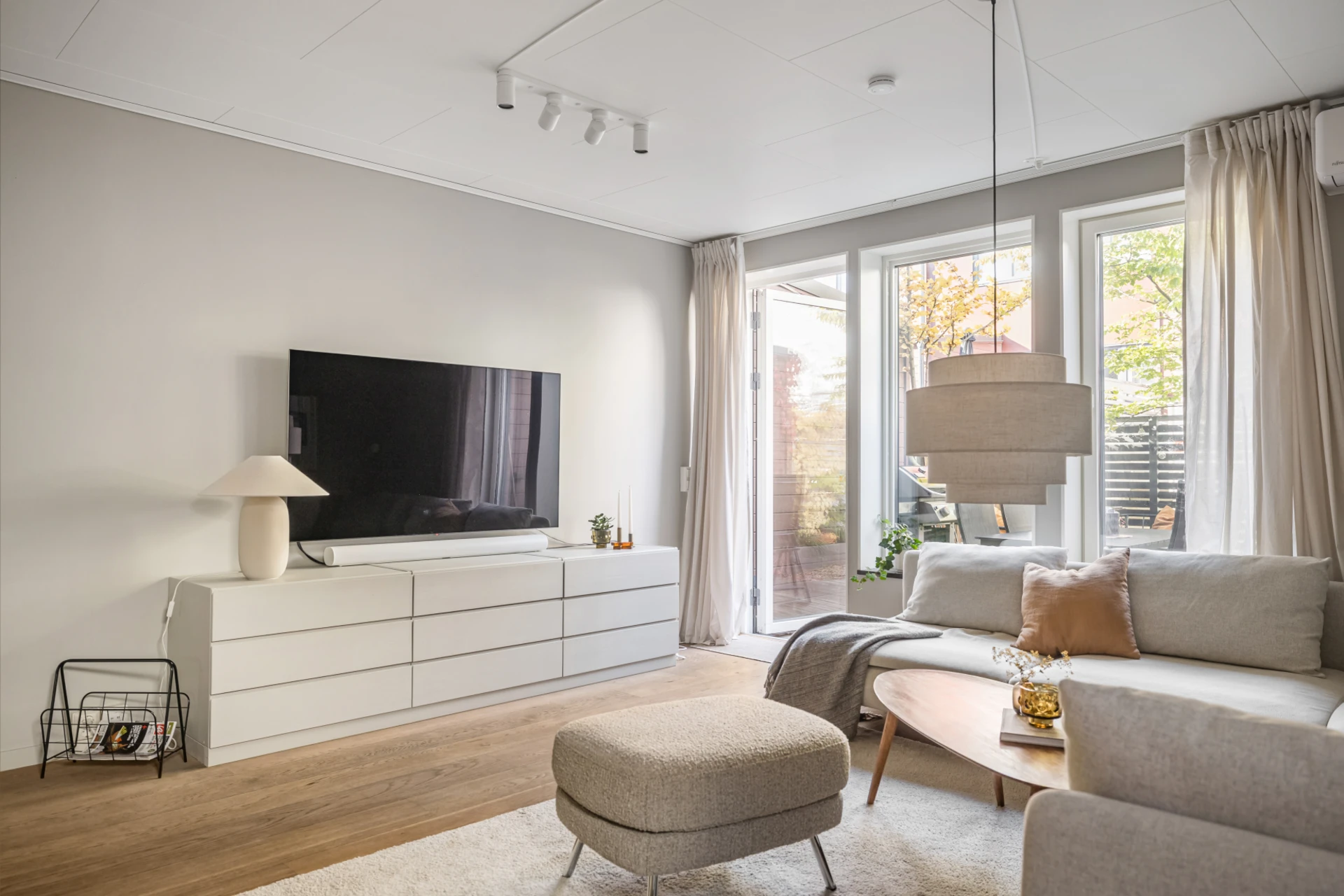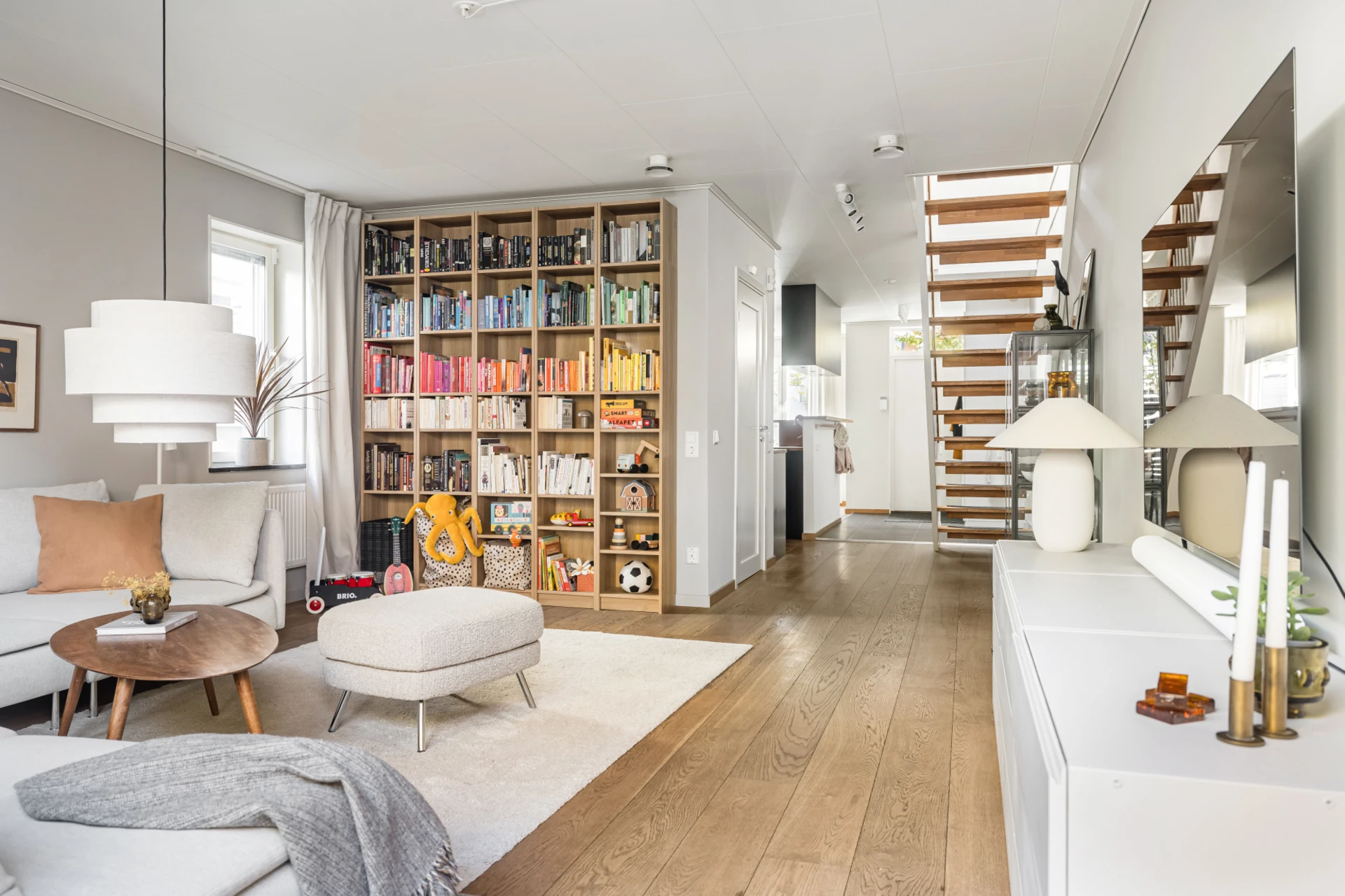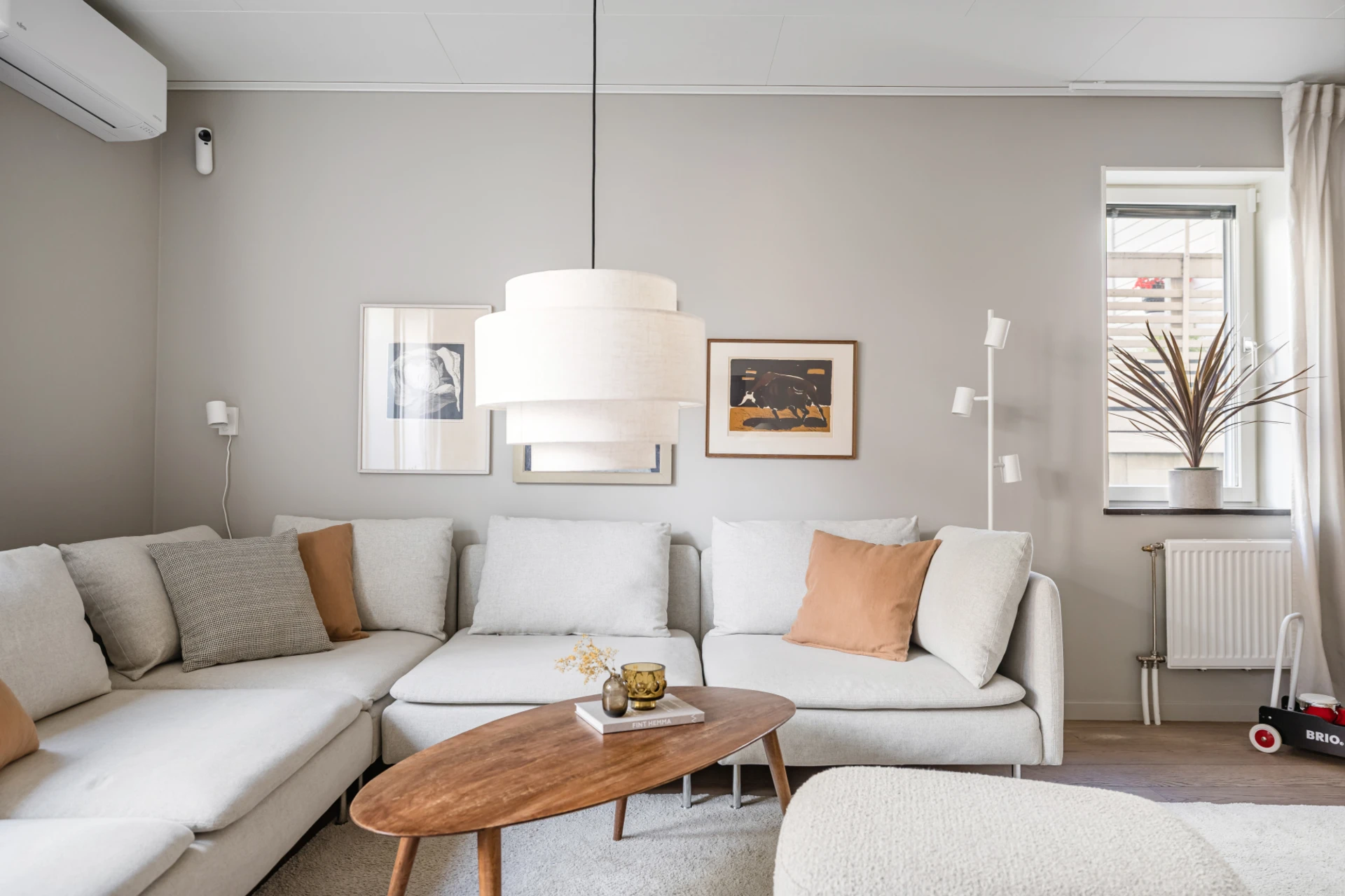 Luftigt vardagsrum med ljusa väggar och ljusinsläpp från två väderstreck tackvare gavelläget. Här finns gott om plats för soffgrupp, tv-möbel, bokhyllor samt annan önskad förvaring.