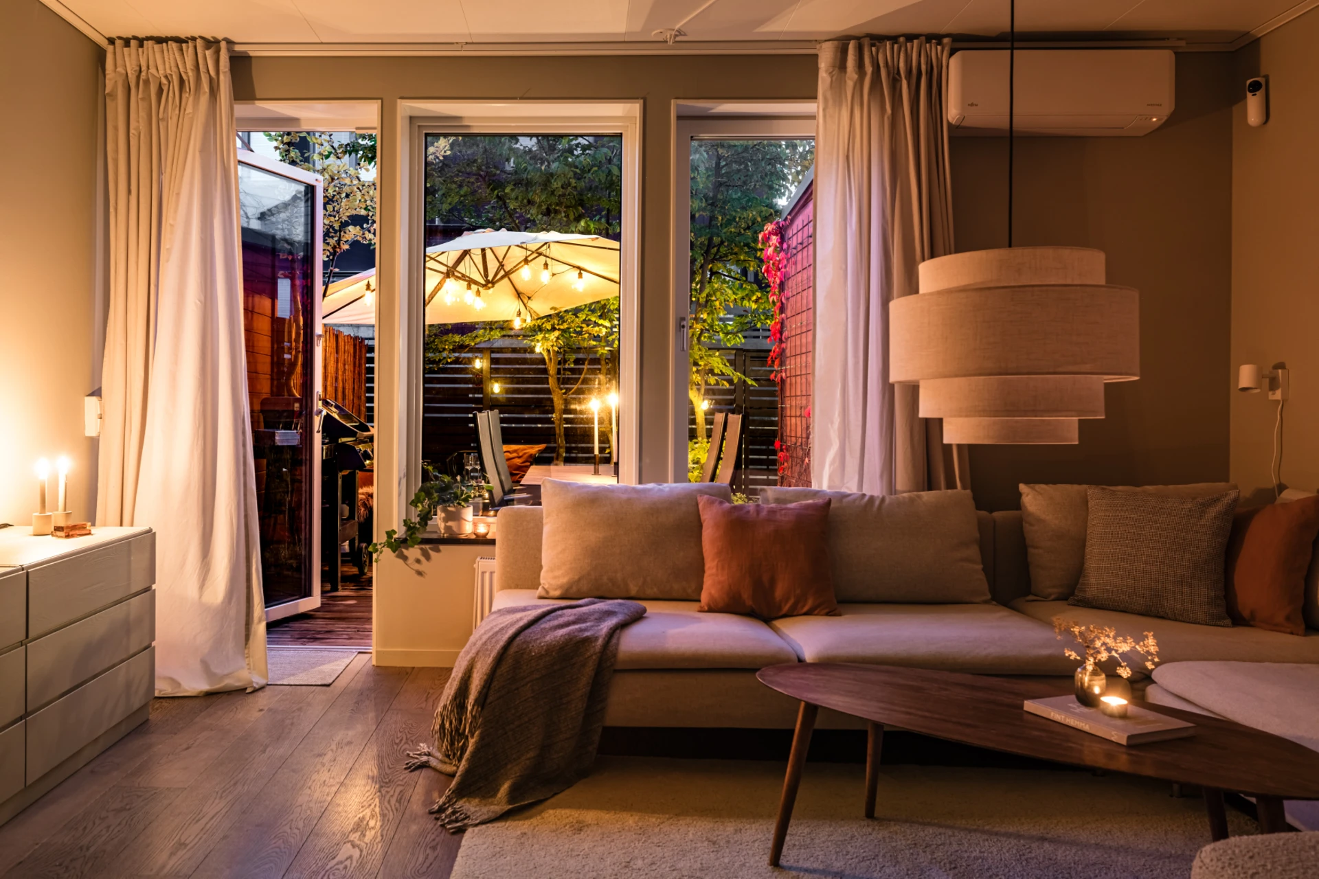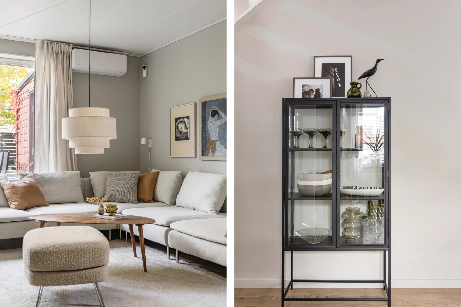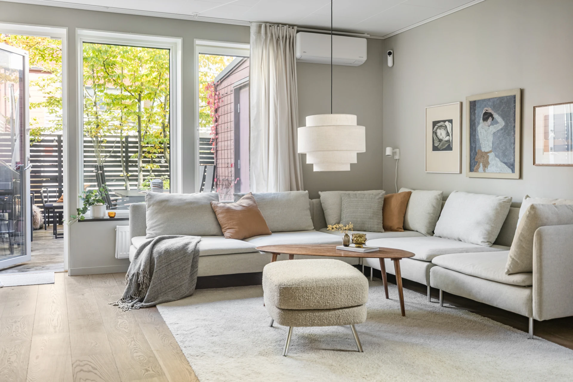 Luftigt vardagsrum med ljusa väggar och ljusinsläpp från två väderstreck tackvare gavelläget. Här finns gott om plats för soffgrupp, tv-möbel, bokhyllor samt annan önskad förvaring.