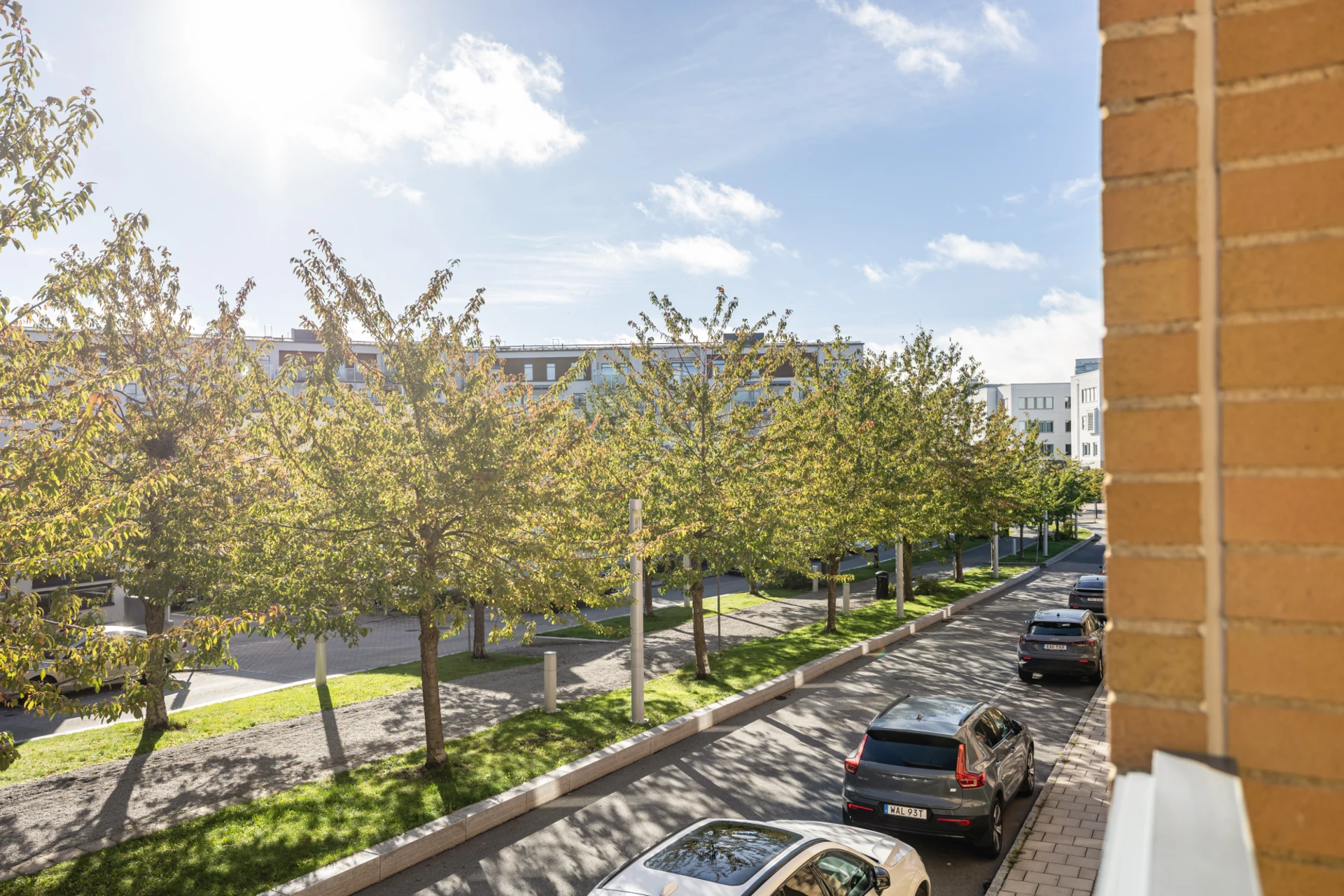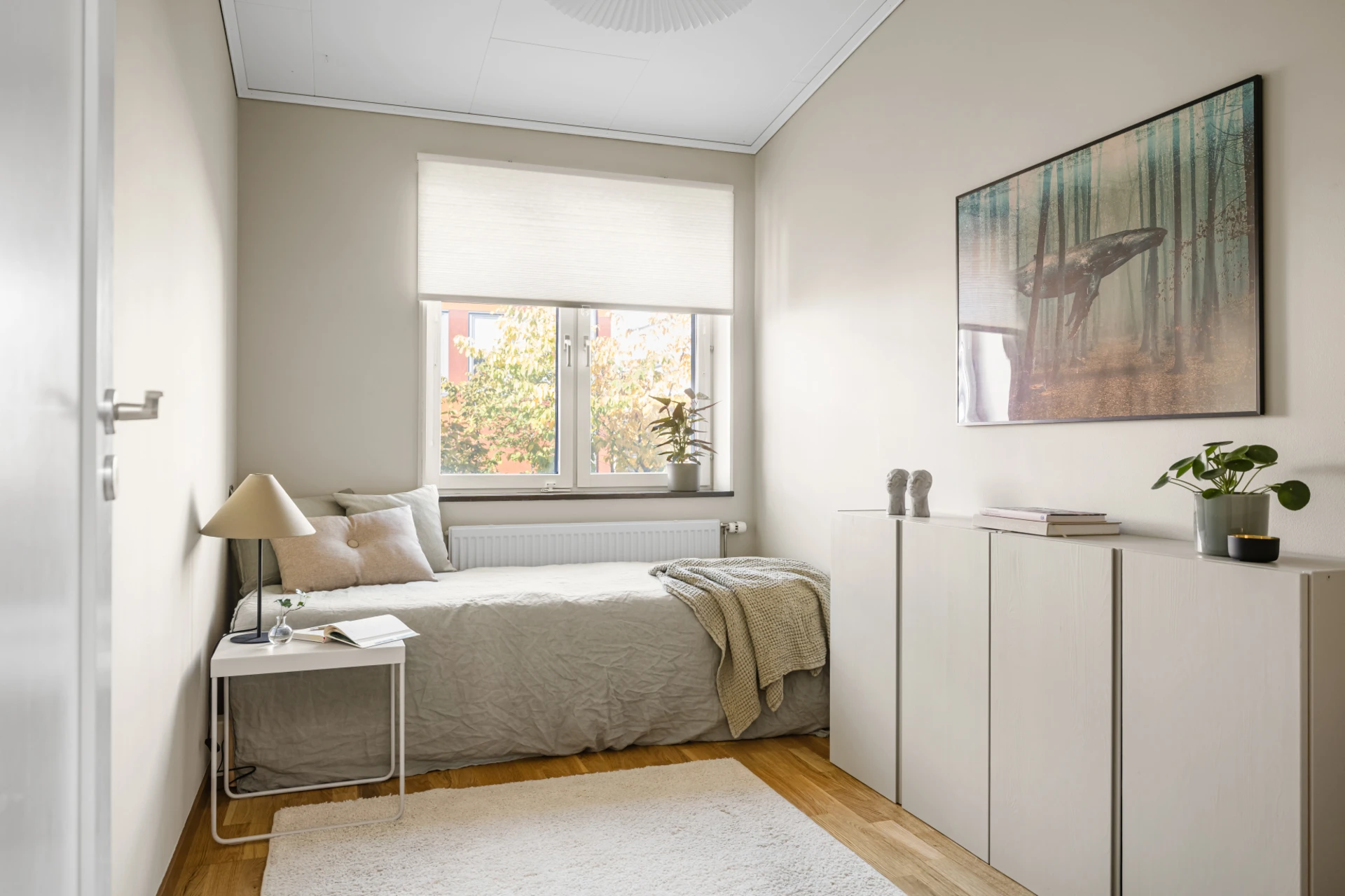 Vacker massiv en-stavsparkett från Boen. Ljusa väggar och fönster i lugnt läge mot baksidan. Här finns gott om plats för säng, sängbord, skrivbord samt annan önskad förvaring.