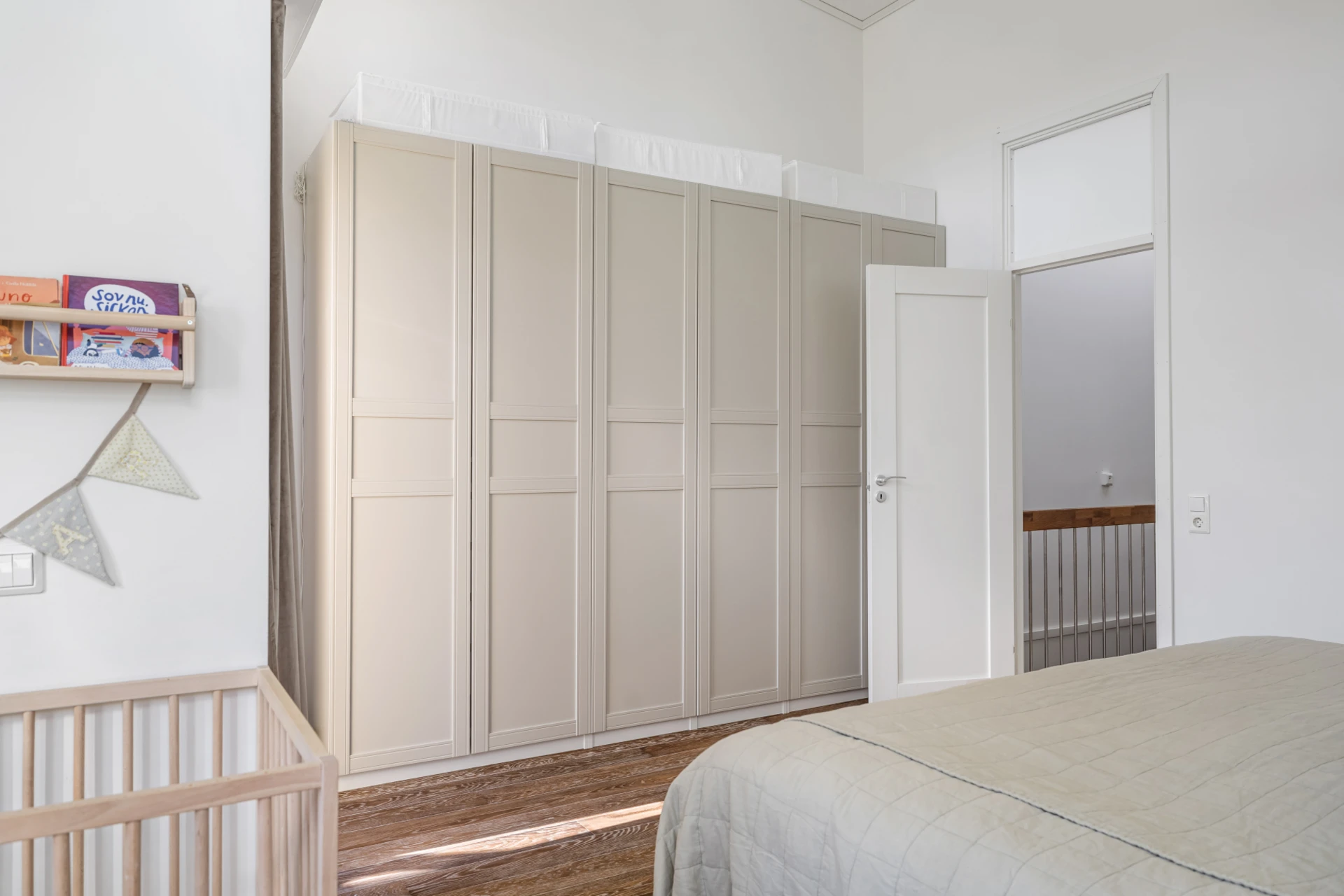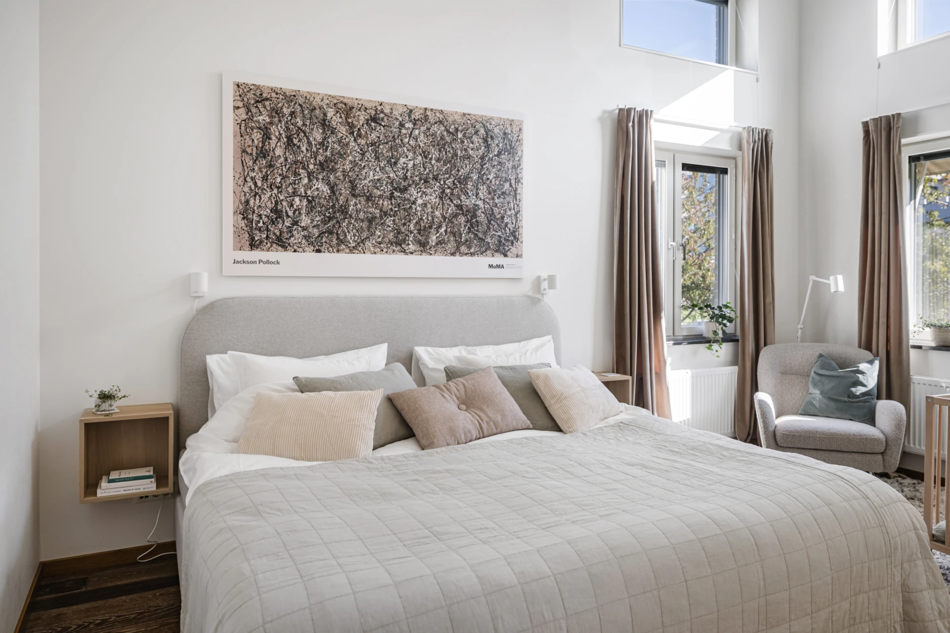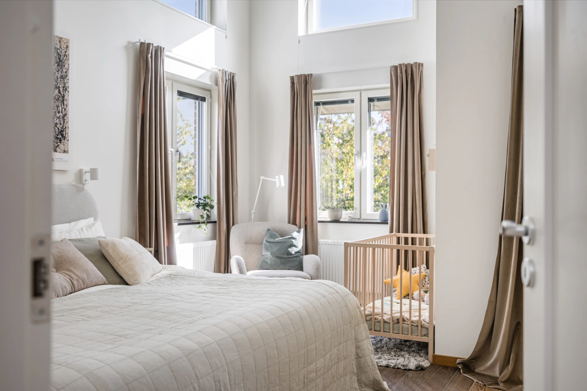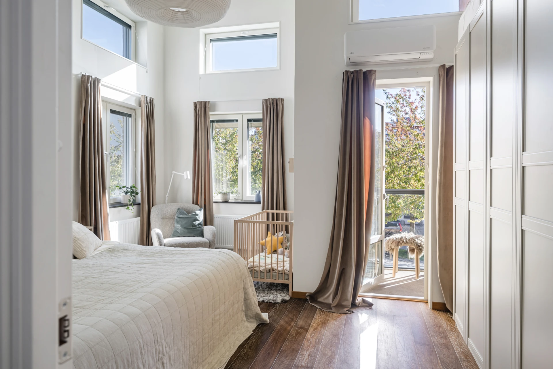 Vacker massiv en-stavsparkett från Boen och ljusa väggar. Ljuvligt sovrum med extraordinär takhöjd i vinkel vilket ger ett vackert ljusinsläpp. Här finns plats för dubbelsäng (idag möblerat med 210 cm), sängbord, läshörna, arbetsplats eller spjälsäng. Gott om förvaring i garderobsvägg.