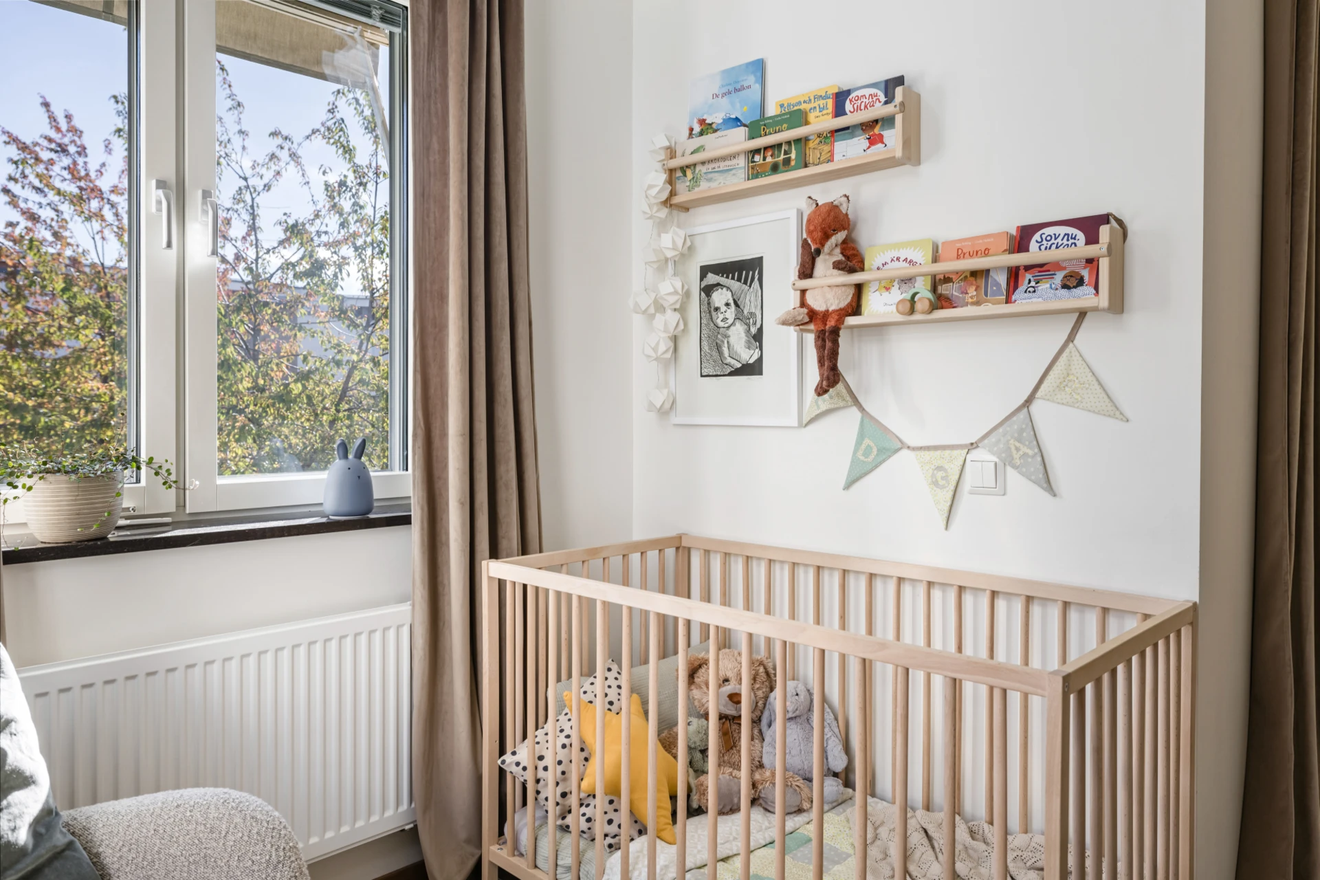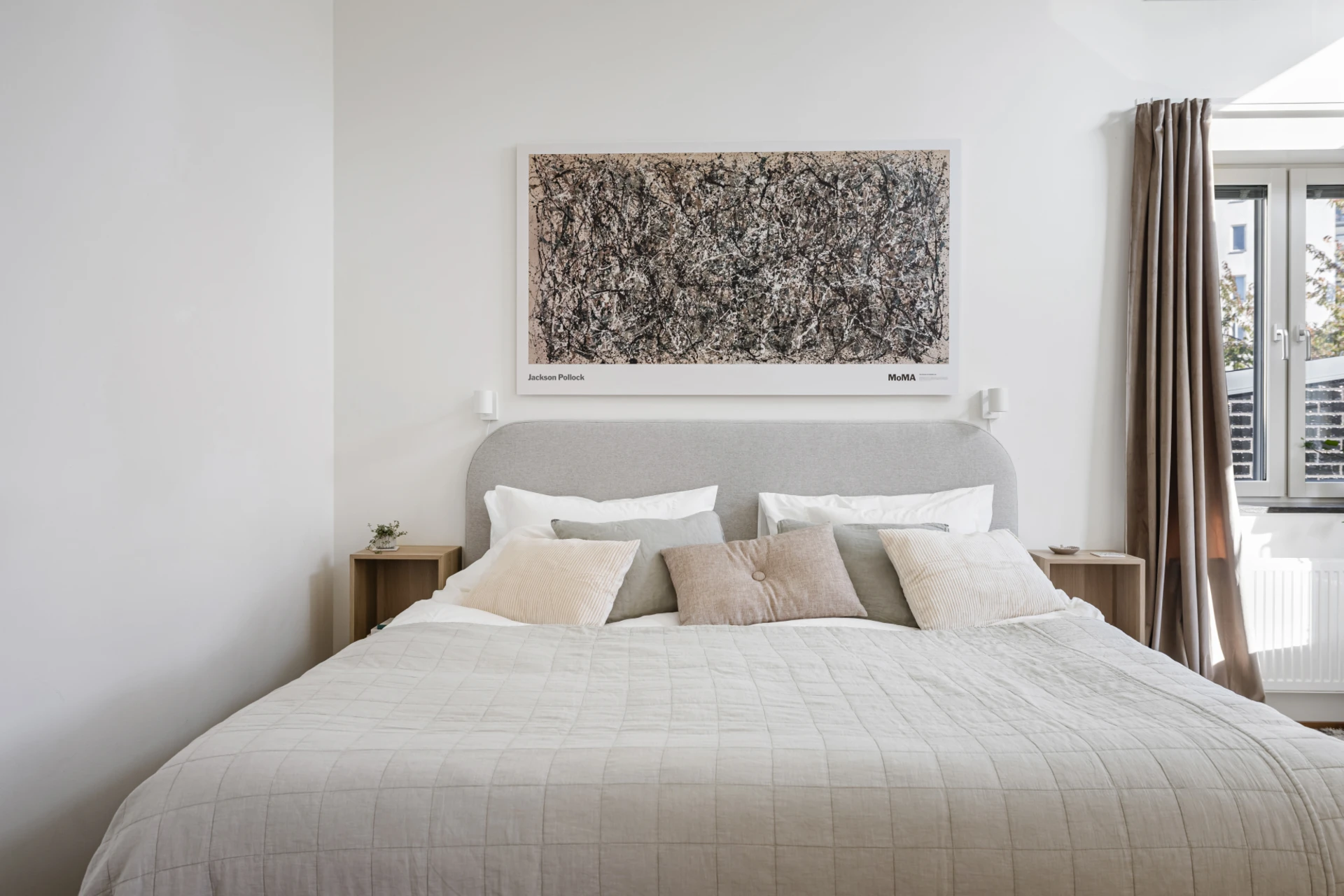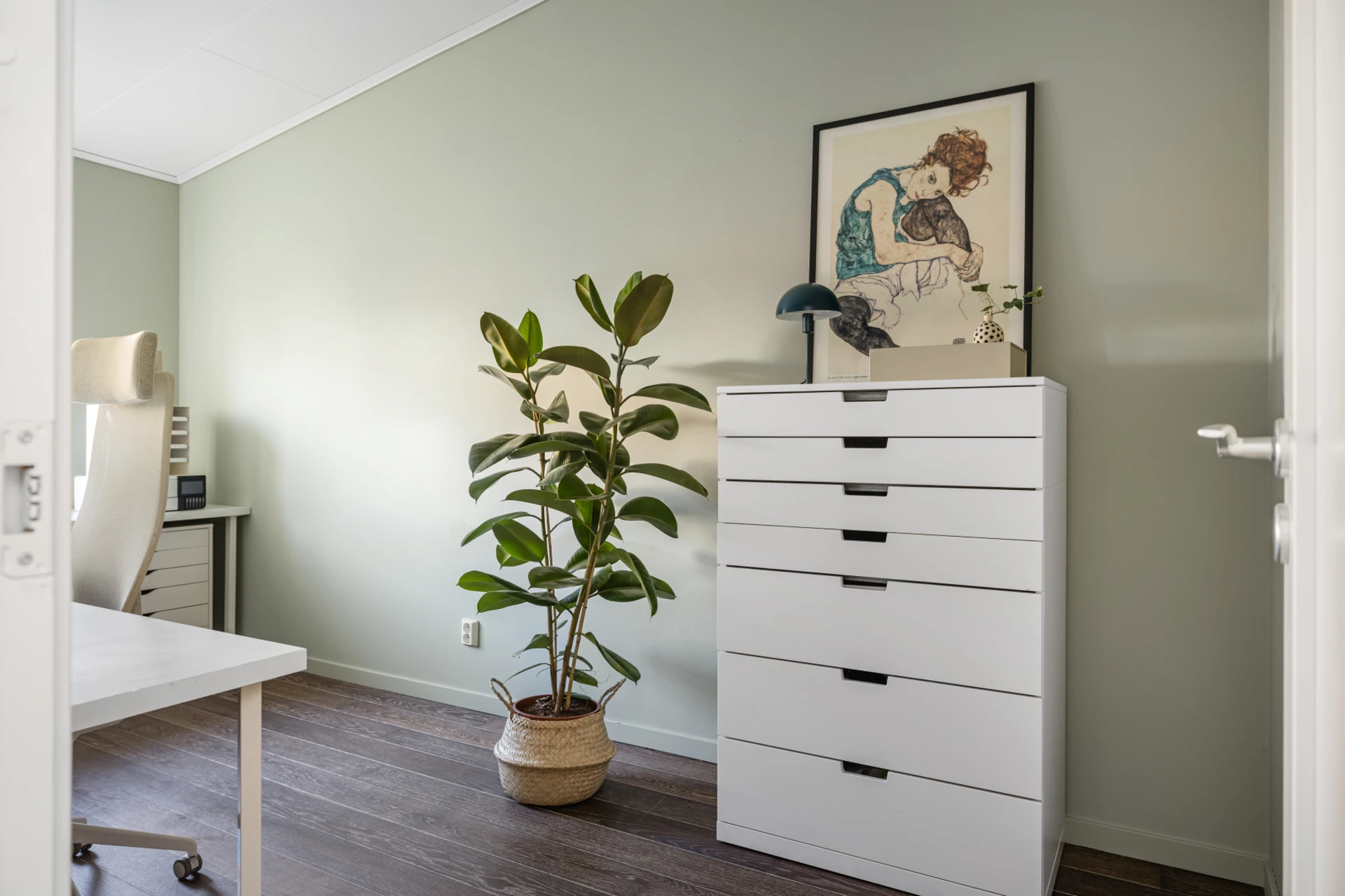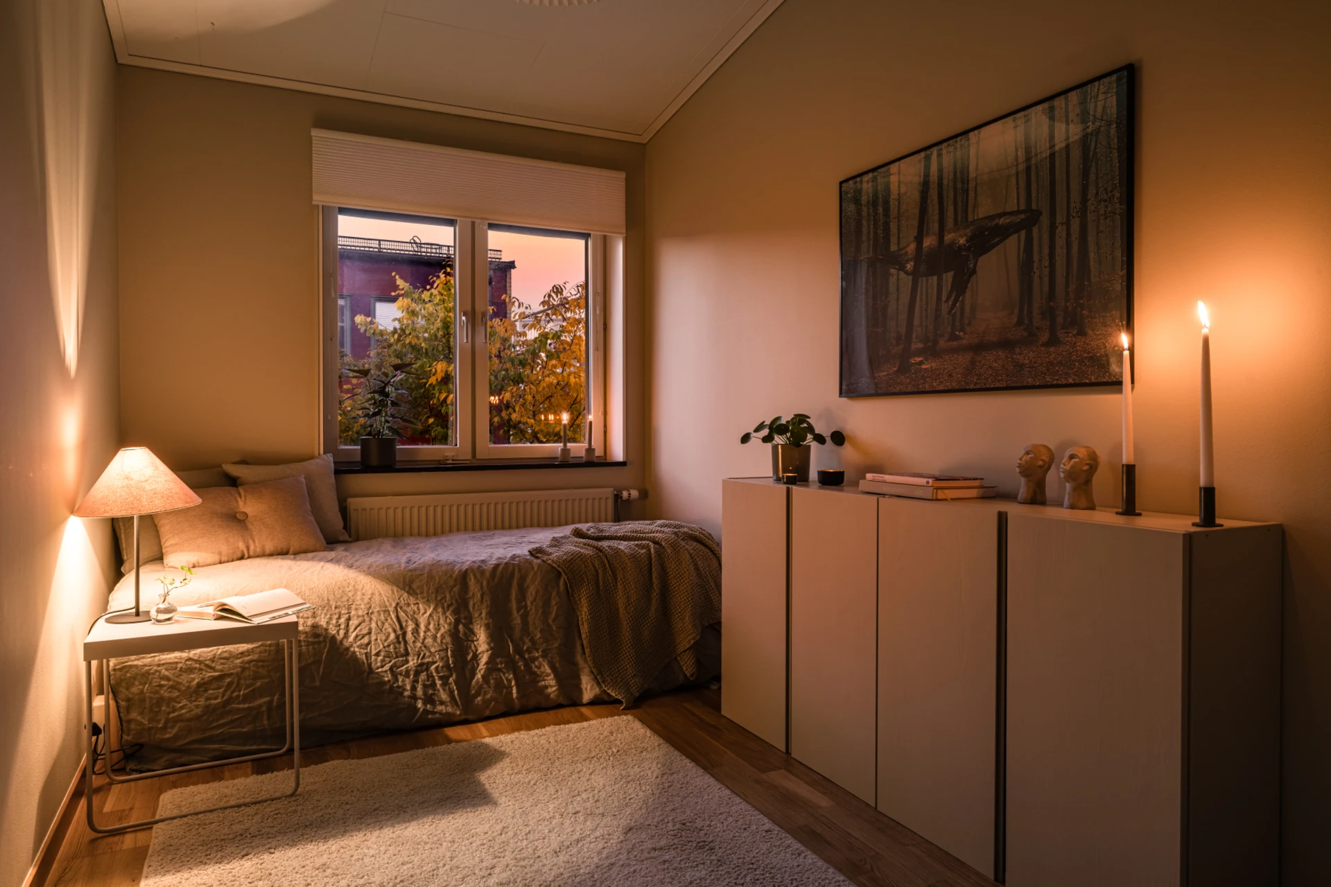Vacker massiv en-stavsparkett från Boen och ljusa väggar. Ljuvligt sovrum med extraordinär takhöjd i vinkel vilket ger ett vackert ljusinsläpp. Här finns plats för dubbelsäng (idag möblerat med 210 cm), sängbord, läshörna, arbetsplats eller spjälsäng. Gott om förvaring i garderobsvägg.