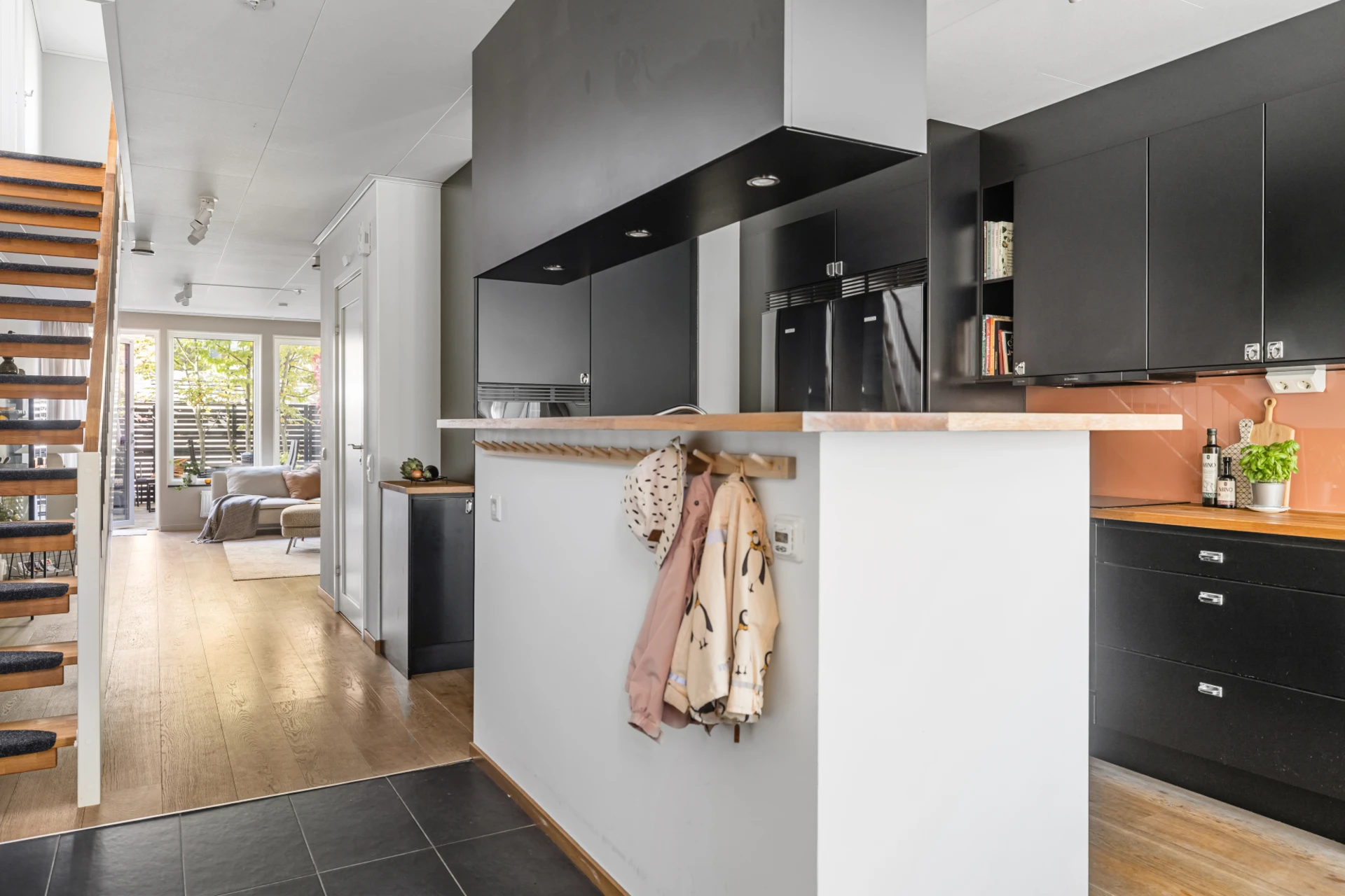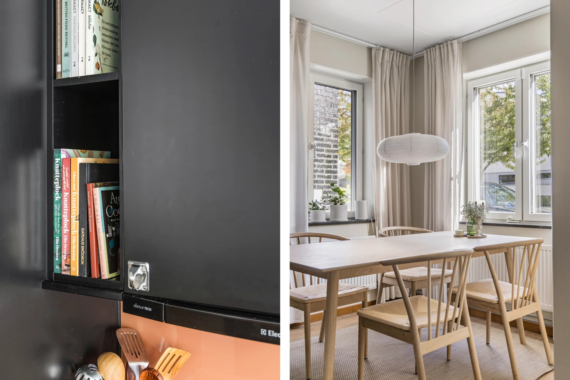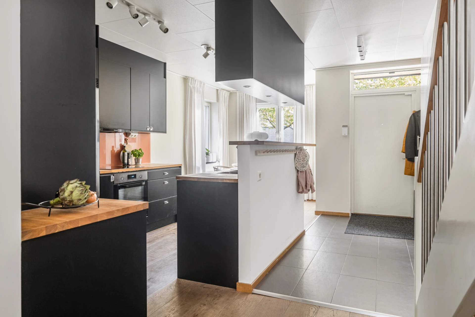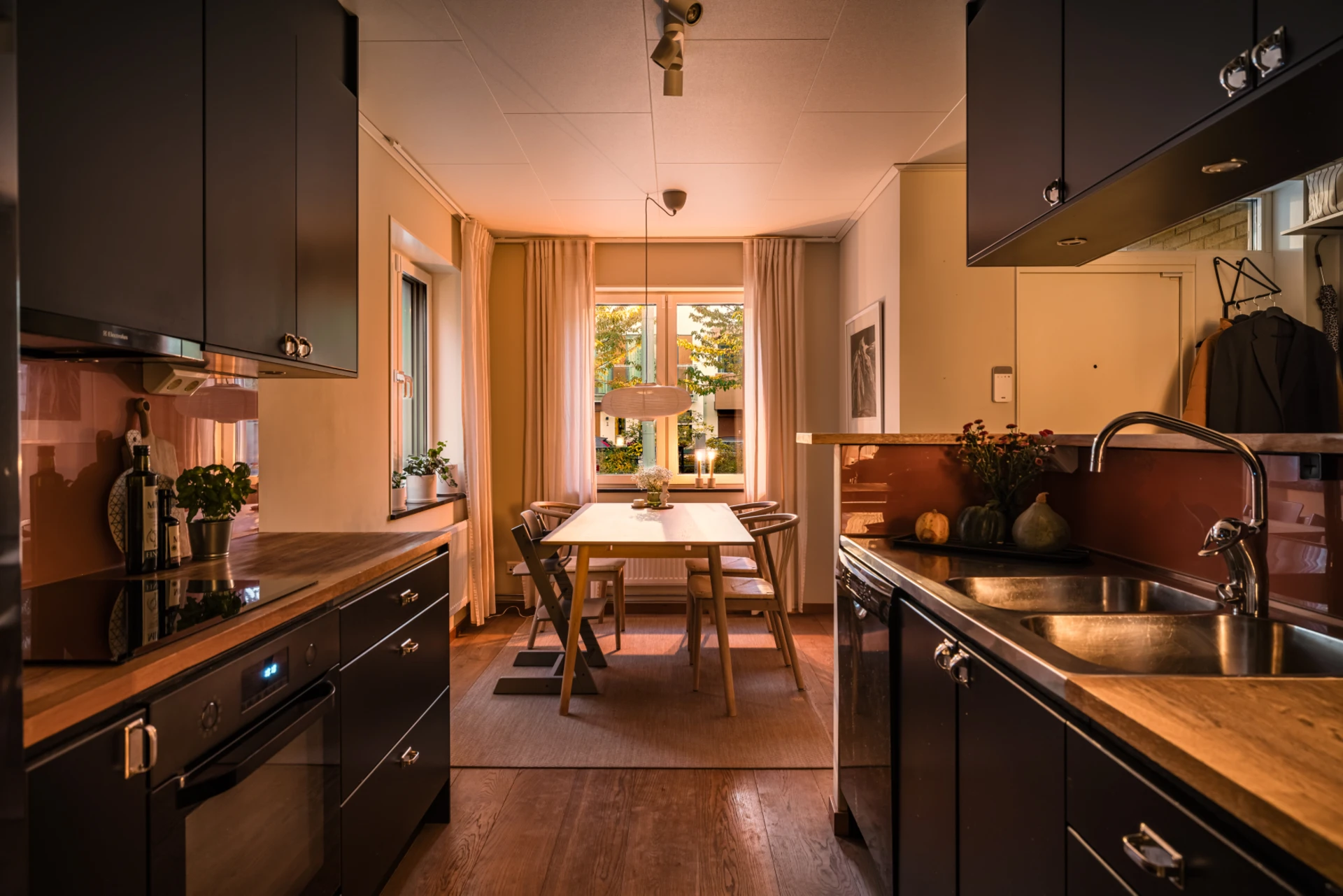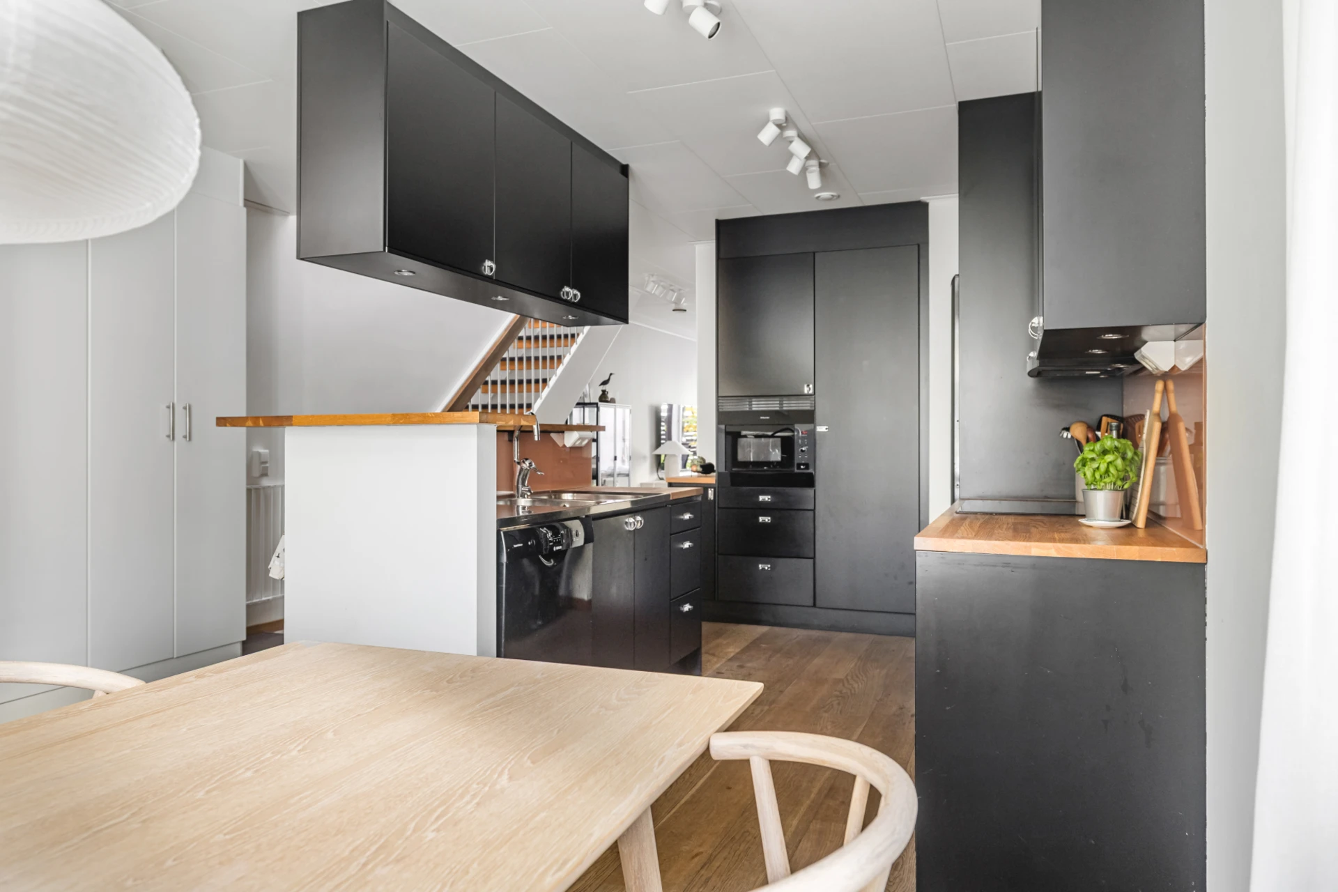 Smakfullt kök med ljusa väggar och fina detaljer. Mörka släta luckor, bänkskiva i ek och led-spotlights. Köket är utrustat med häll (Siemens 2024), ugn (Samsung 2022), micro, diskho, diskmaskin samt kyl och frys. Intill köket finns naturlig matplats intill fönster. Ljusinsläpp från två väderstreck tack vare gavelläget.