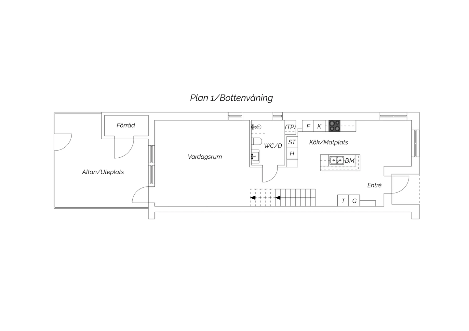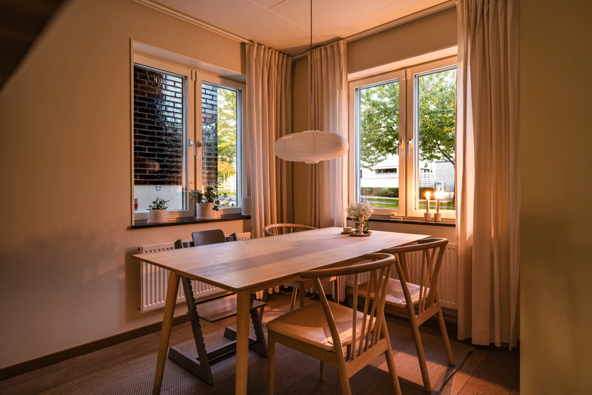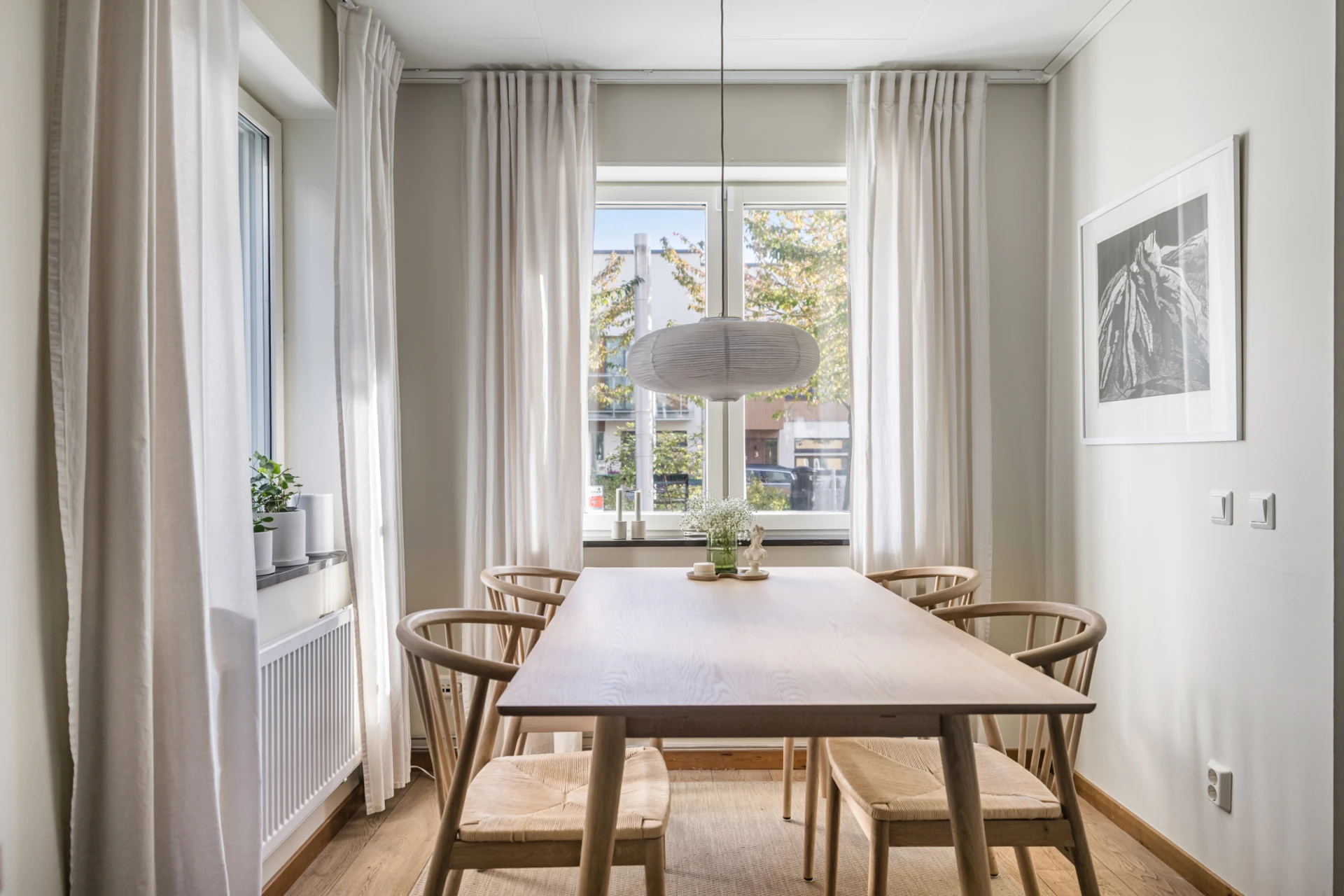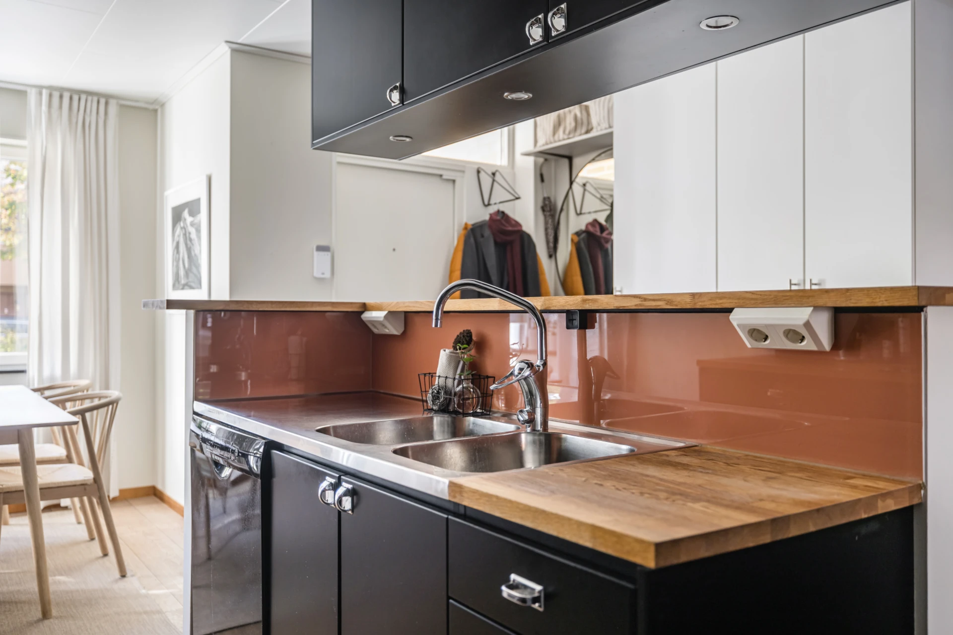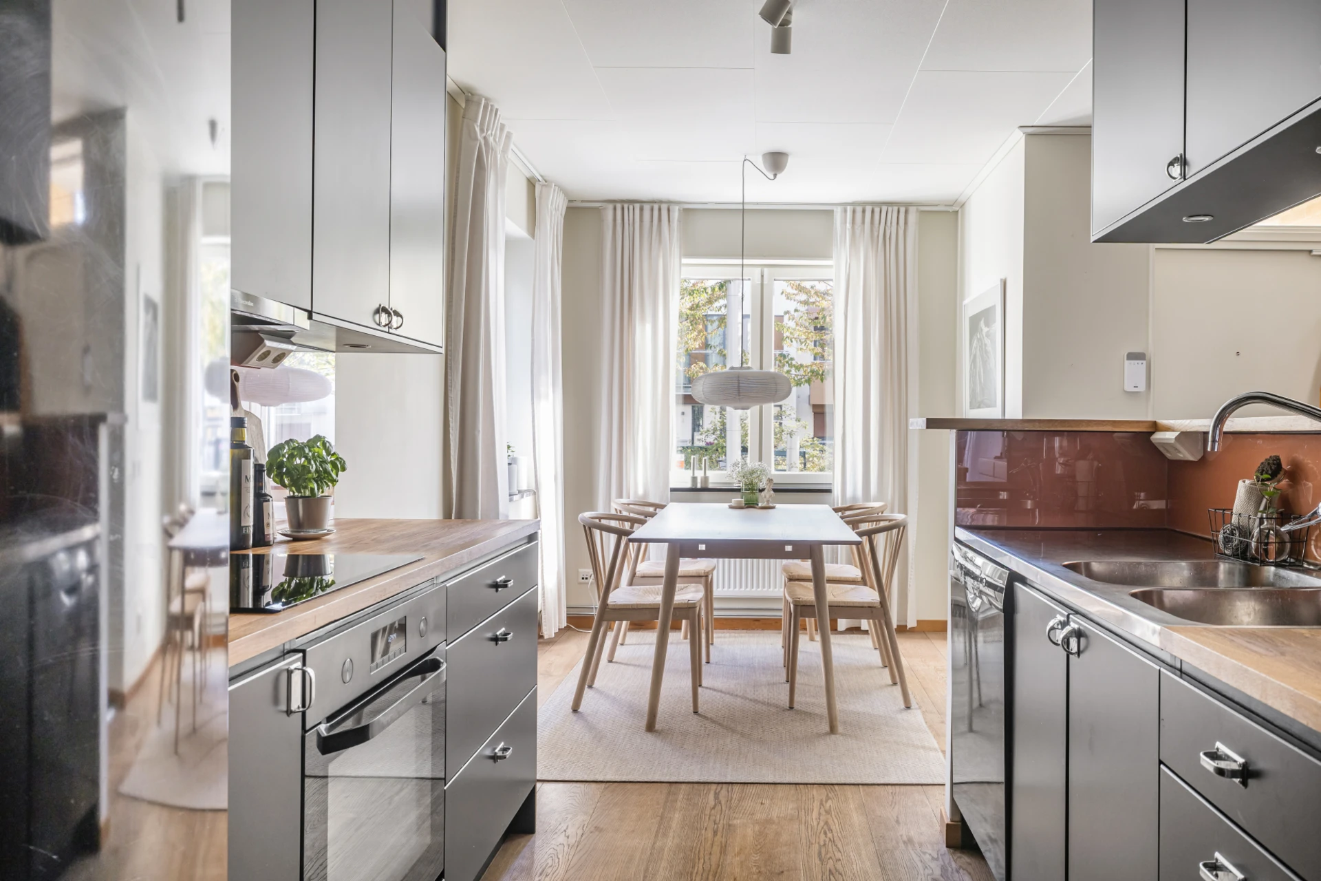 Smakfullt kök med ljusa väggar och fina detaljer. Mörka släta luckor, bänkskiva i ek och led-spotlights. Köket är utrustat med häll (Siemens 2024), ugn (Samsung 2022), micro, diskho, diskmaskin samt kyl och frys. Intill köket finns naturlig matplats intill fönster. Ljusinsläpp från två väderstreck tack vare gavelläget.