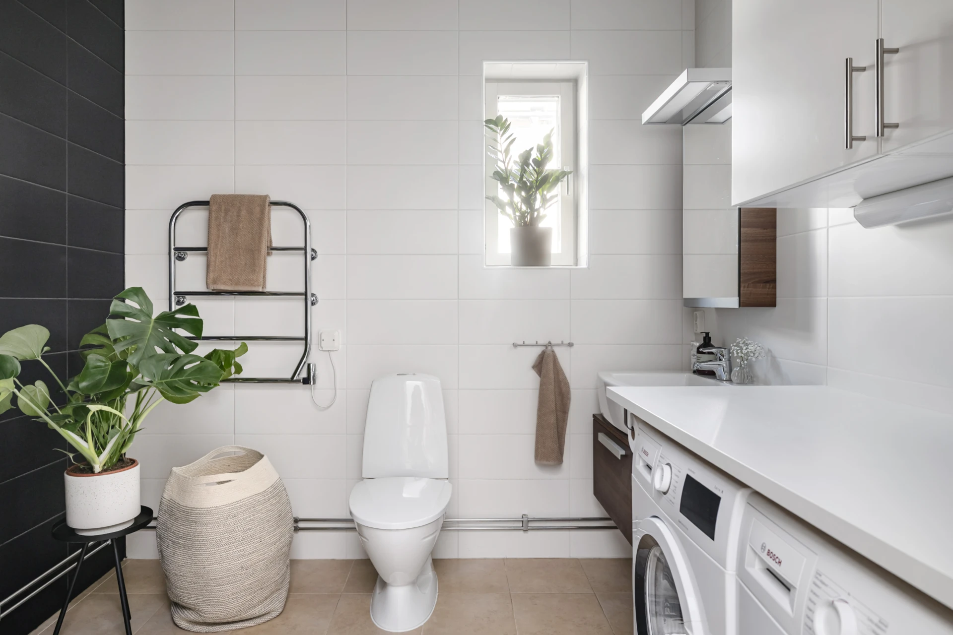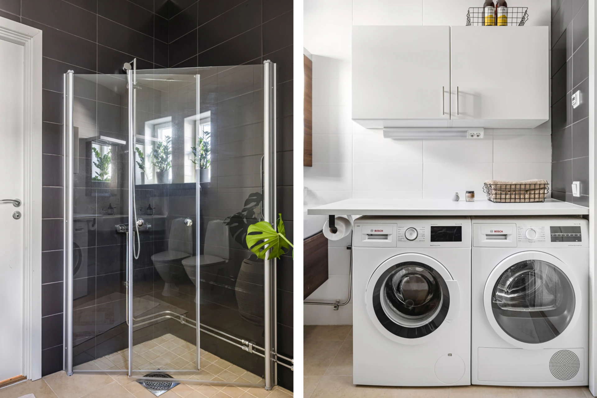 Smakfullt badrum med ljust klinker med golvvärme samt mörkt kakel. Härligt ljusinsläpp från fönster. Badrummet är utrustat med dusch med glasdörrar, handfat med kommod och WC. Praktisk tvättdel med tvättmaskin (Bosch 2025) och torktumlare (Bosch 2020) under arbetsbänk samt förvaring i väggskåp ovan.
