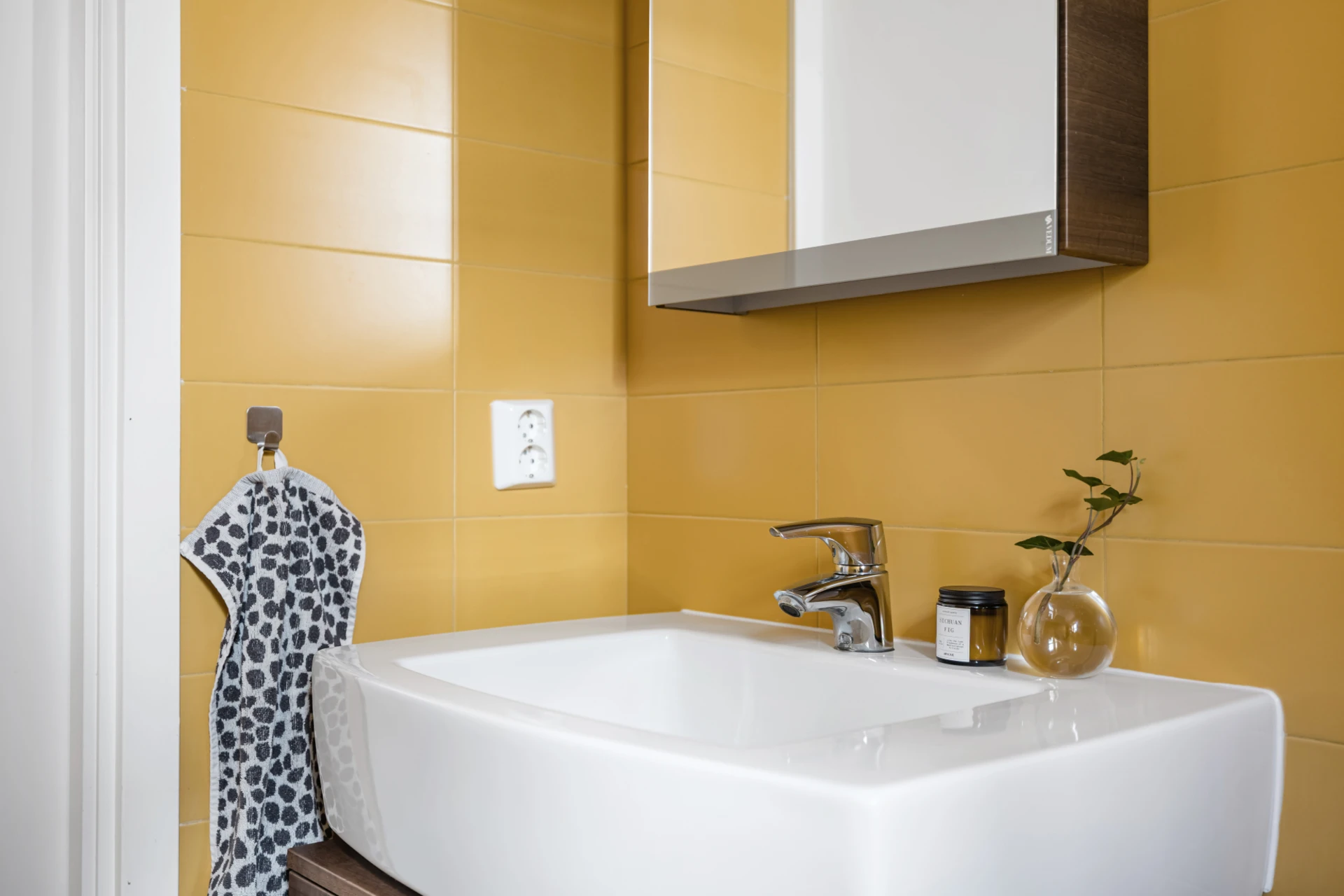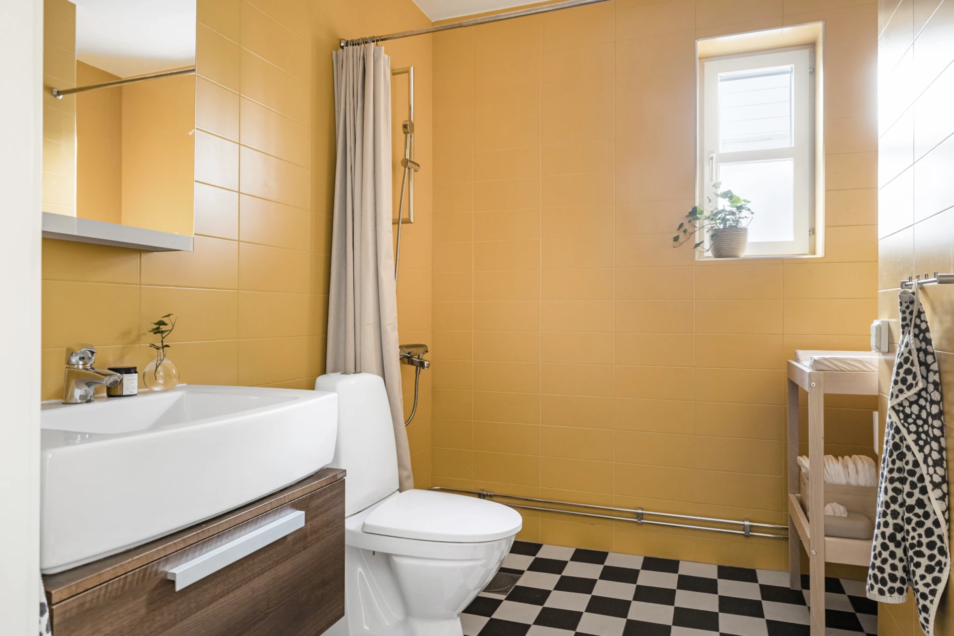 Stilrent badrum med svart/vitt klinker i schackmönster på golv med golvvärme och sobert gult kakel på väggarna vilket verkligen förstärker känslan av ett Townhouse i London. Härligt ljusinsläpp från fönster. Smart planerat med plats för skötbord in i smygen. Badrummet är utrustat med dusch, handfat med kommod och spegel samt WC. Även förberett för tvättpelare och badkarsblandare.