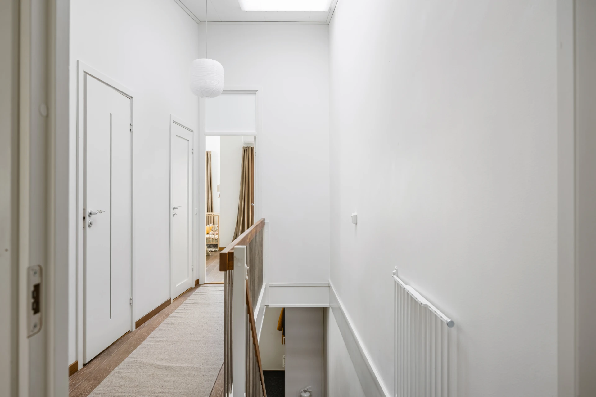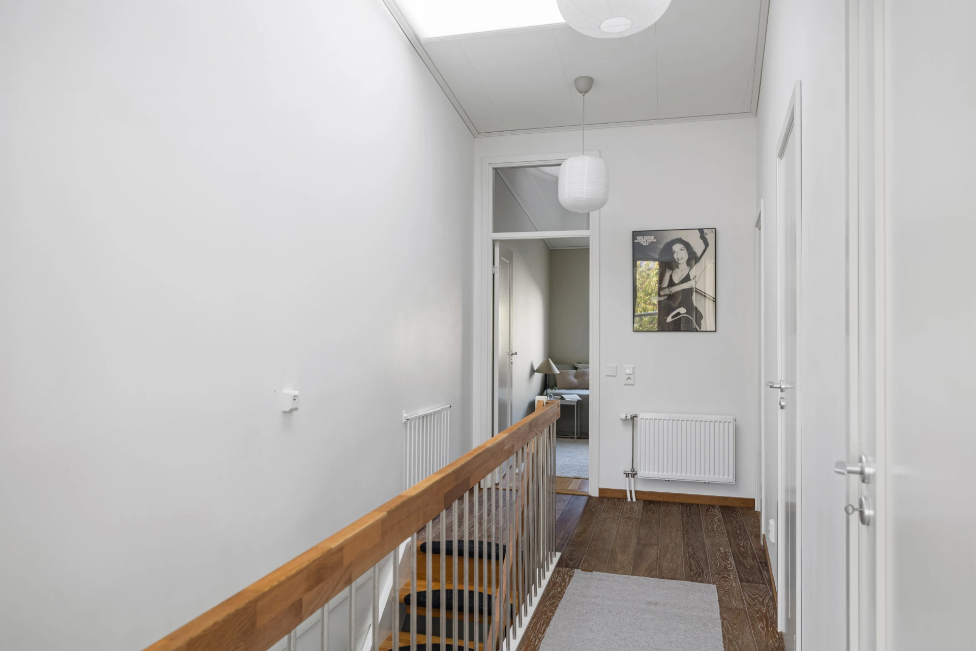Vacker massiv en-stavsparkett från Boen. Ljusa väggar och läckert takfönster med elektrisk jalusi som ger vackert ljus till hela övervåningen samt ner i trapphuset.