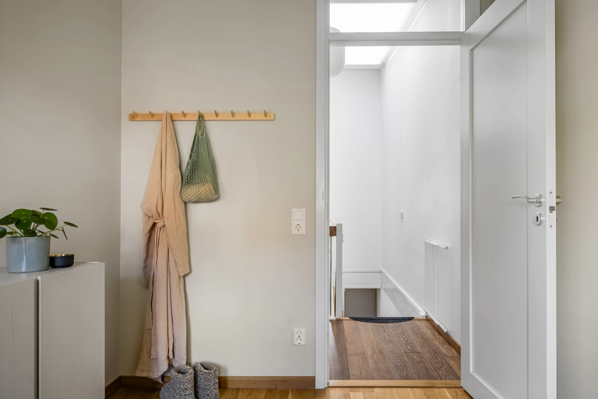 Välplanerad hall med ljusa väggar och praktisk mörk klinker, här finns gott om plats för avhängning, barnvagn samt förvaring i garderob.