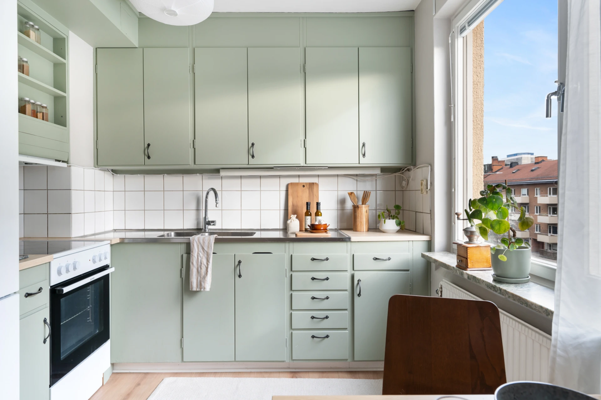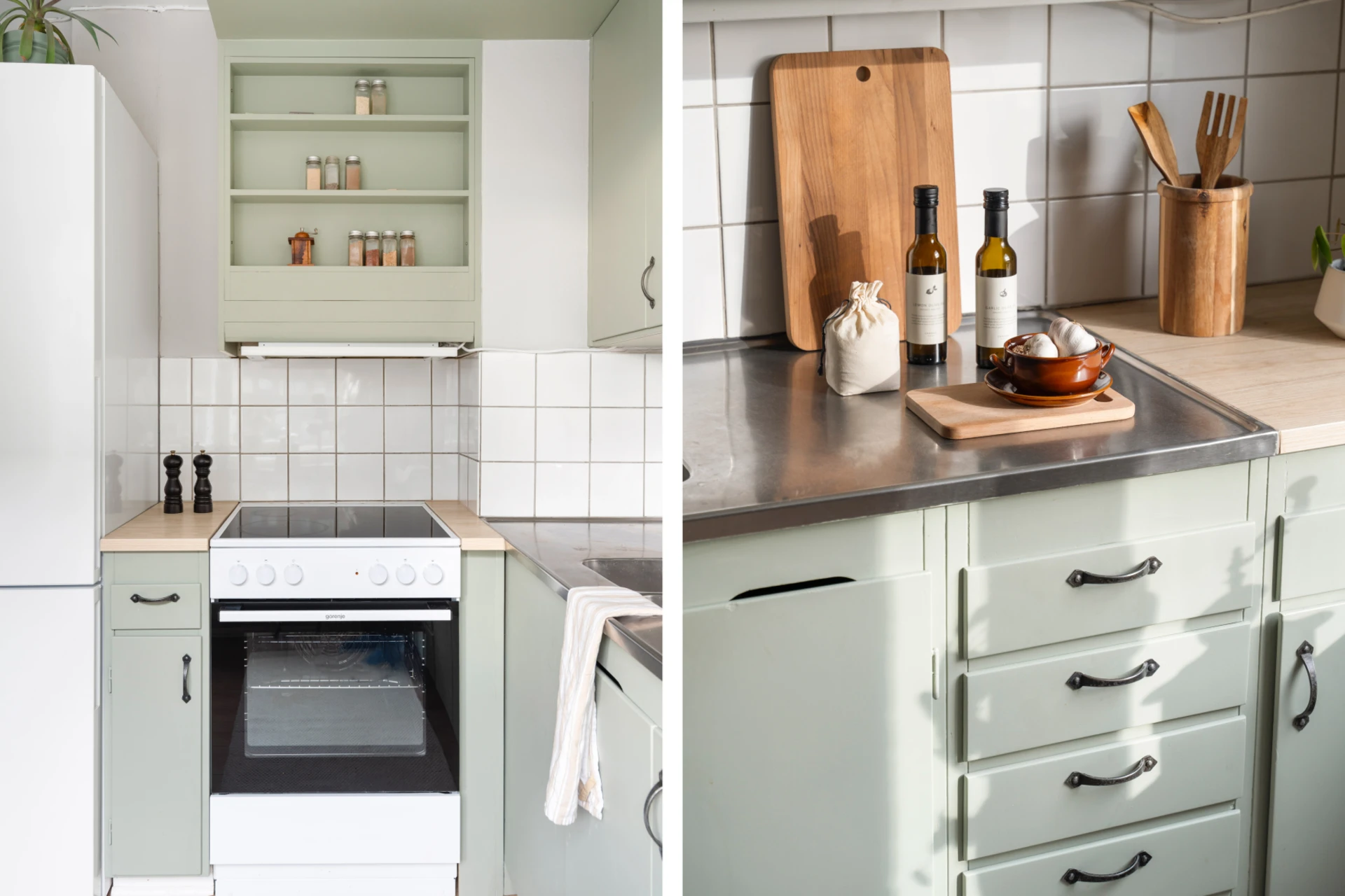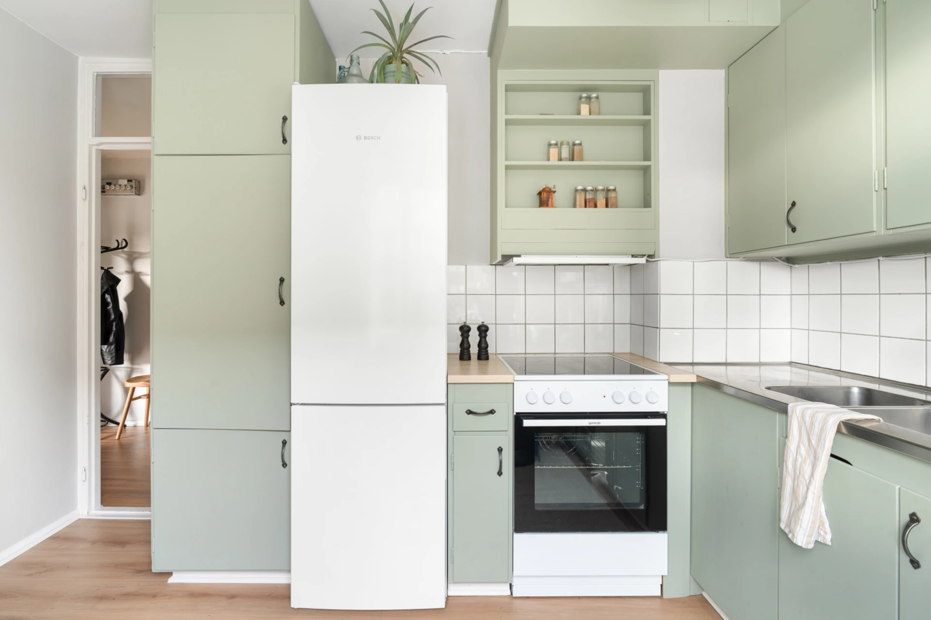 Ljust golv och ljusa väggar. Vitt kakel ovan arbetsbänk, skåpsluckor i grön kulör samt lådfronter. Utrustat med diskho, spis, ugn, fläkt samt kyl/frys. Plats för mindre matgrupp.
