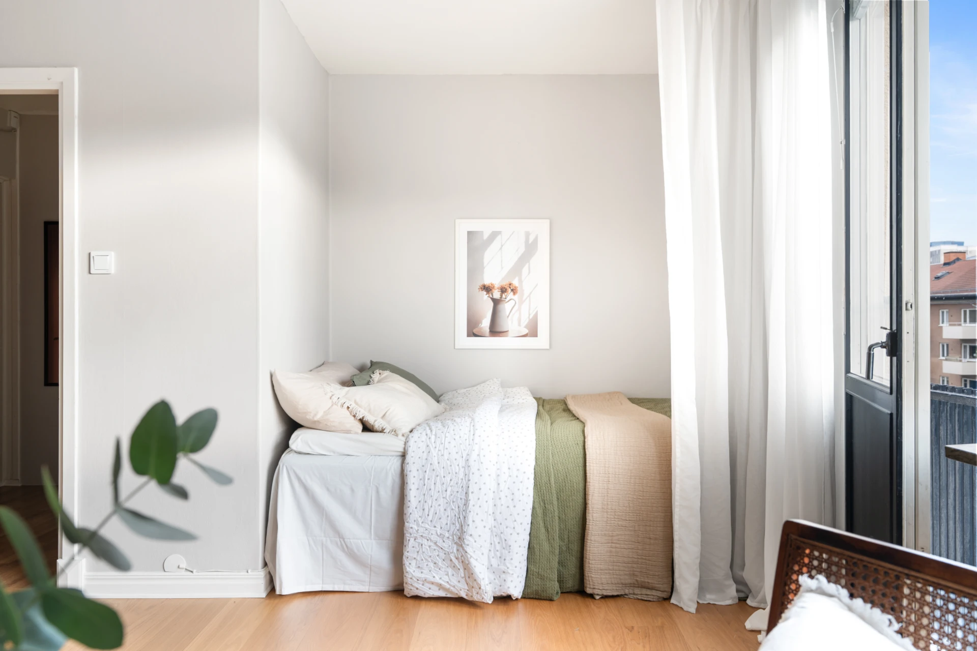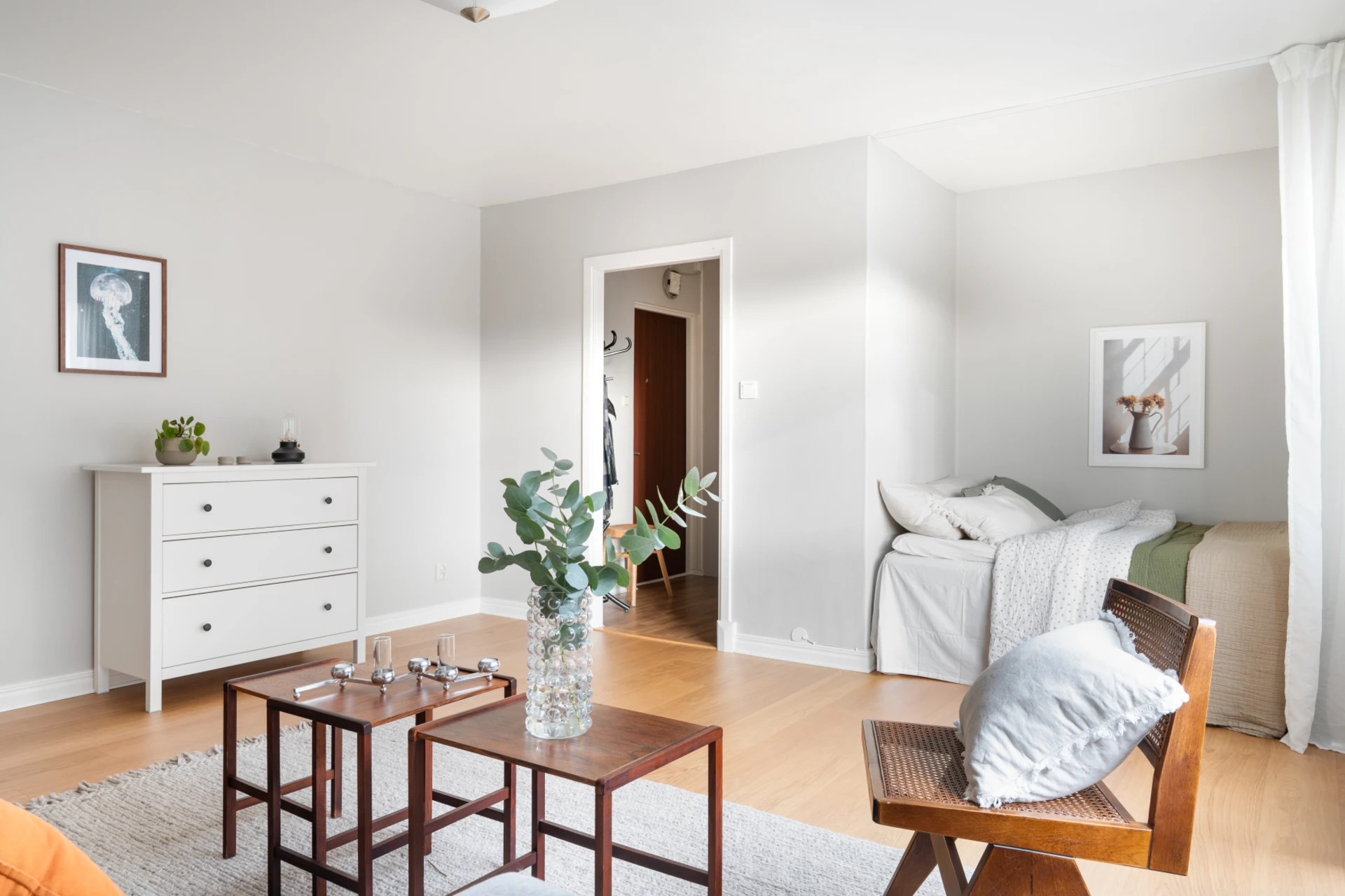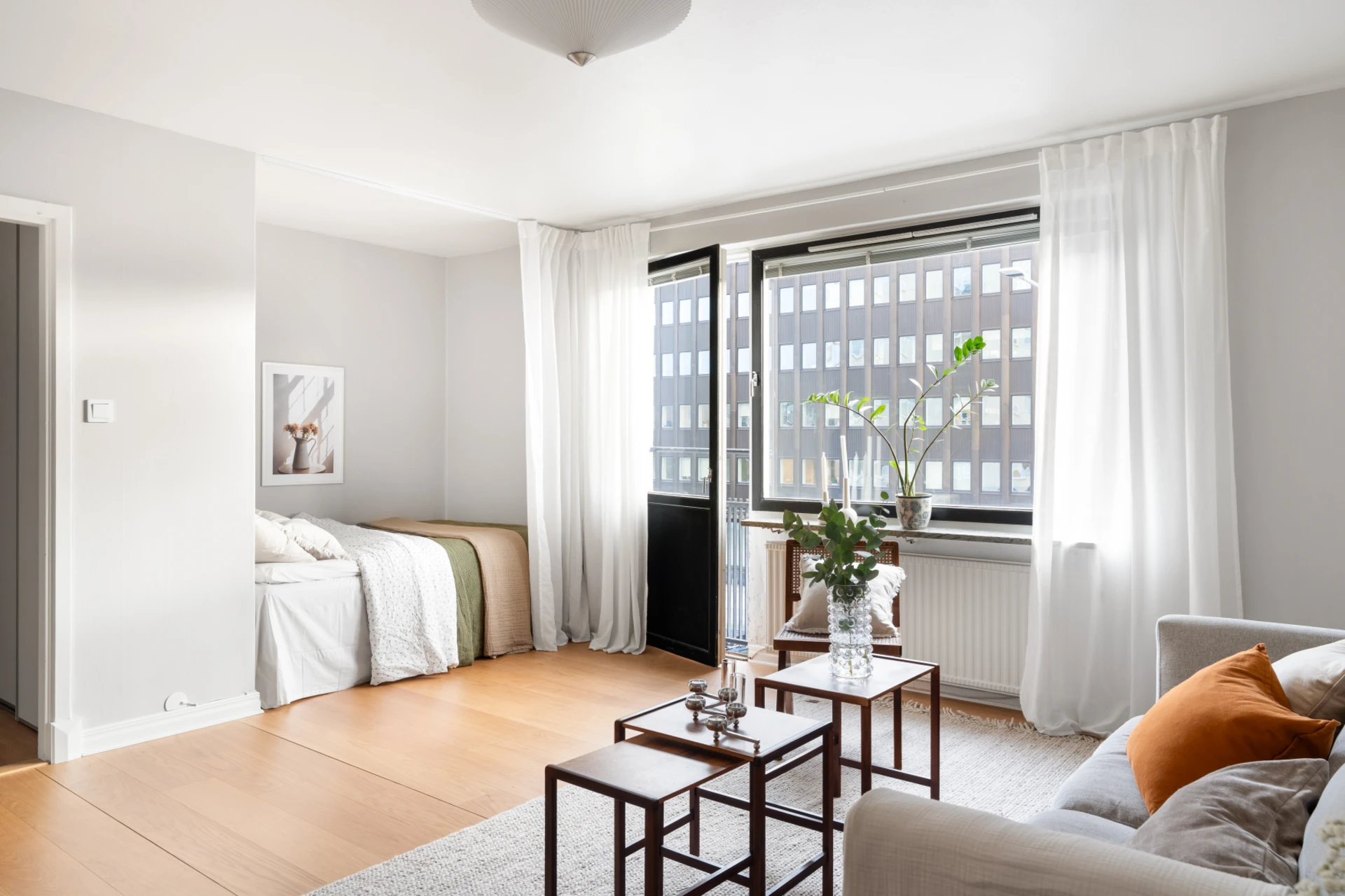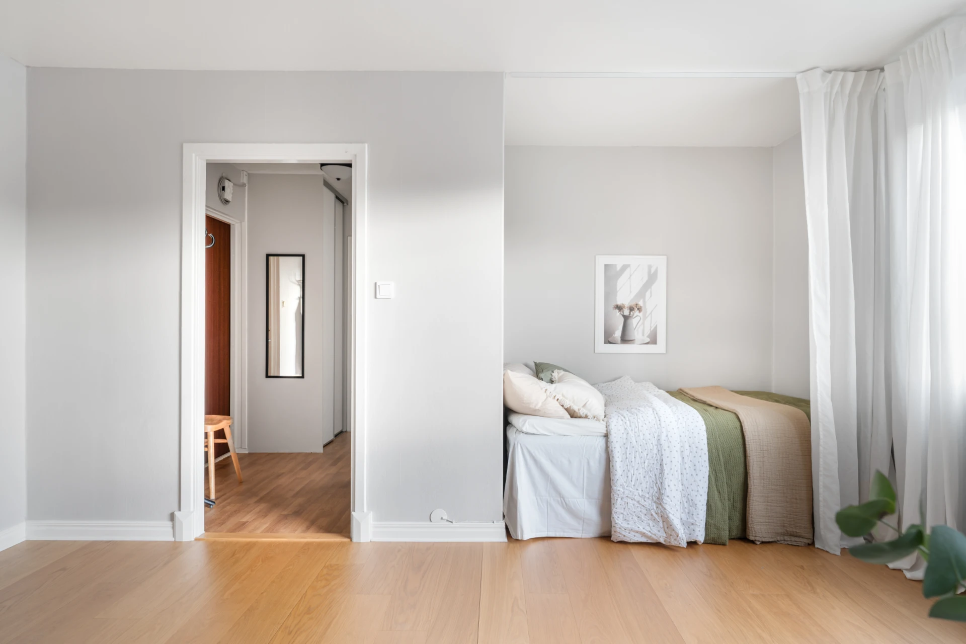 Ljust golv och ljusa väggar. Plats för soffa, soffbord, matgrupp samt annan önskad möblering. Sovalkov med plats för säng. Utgång till fransk balkong.