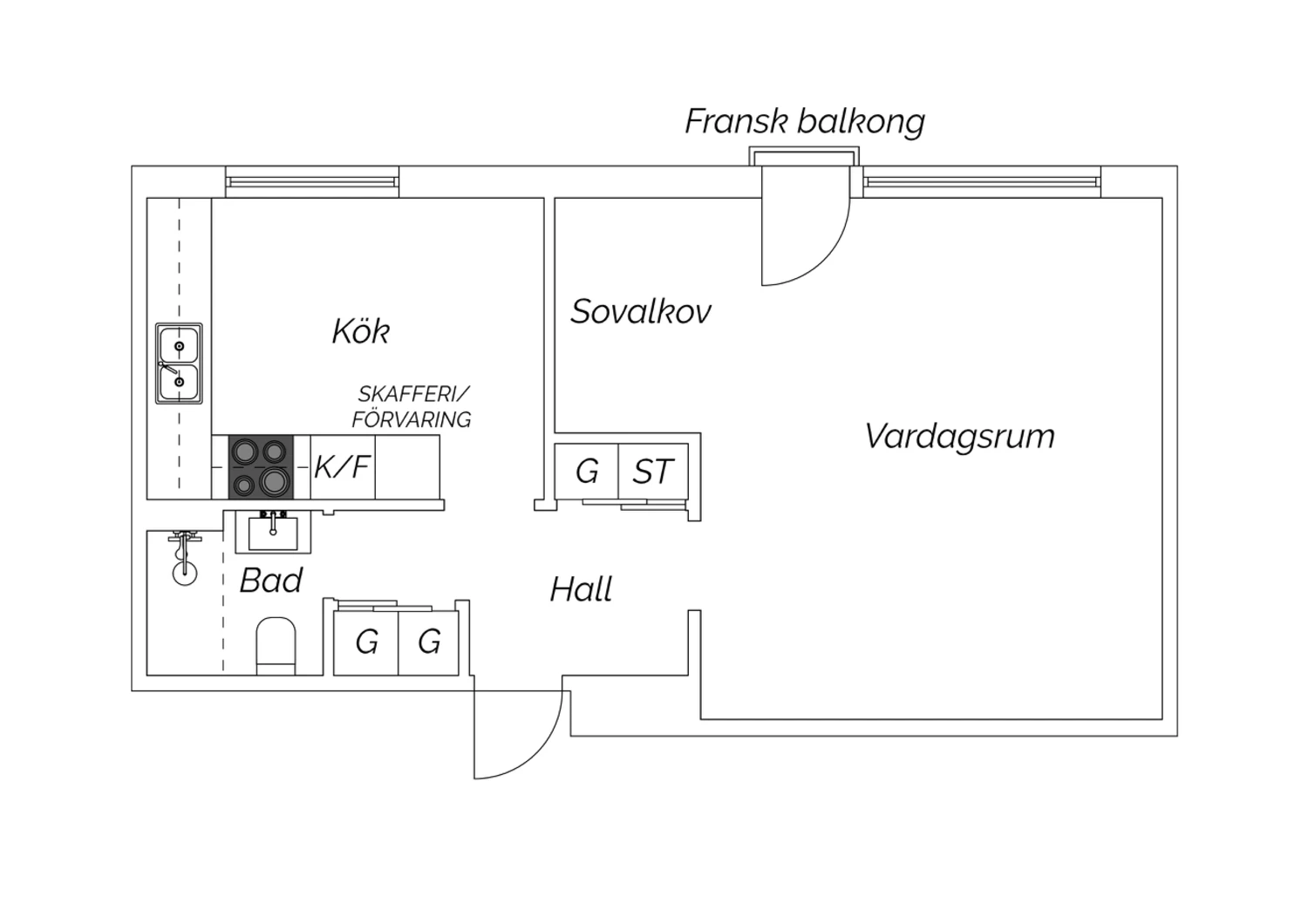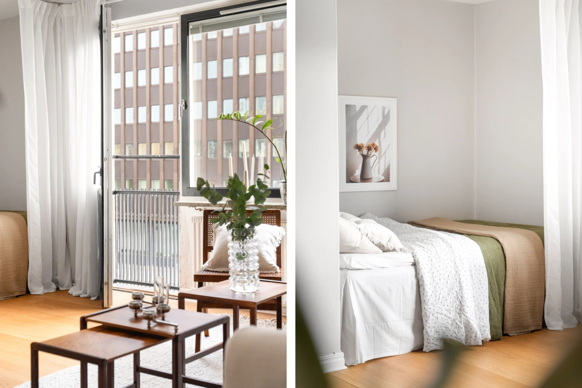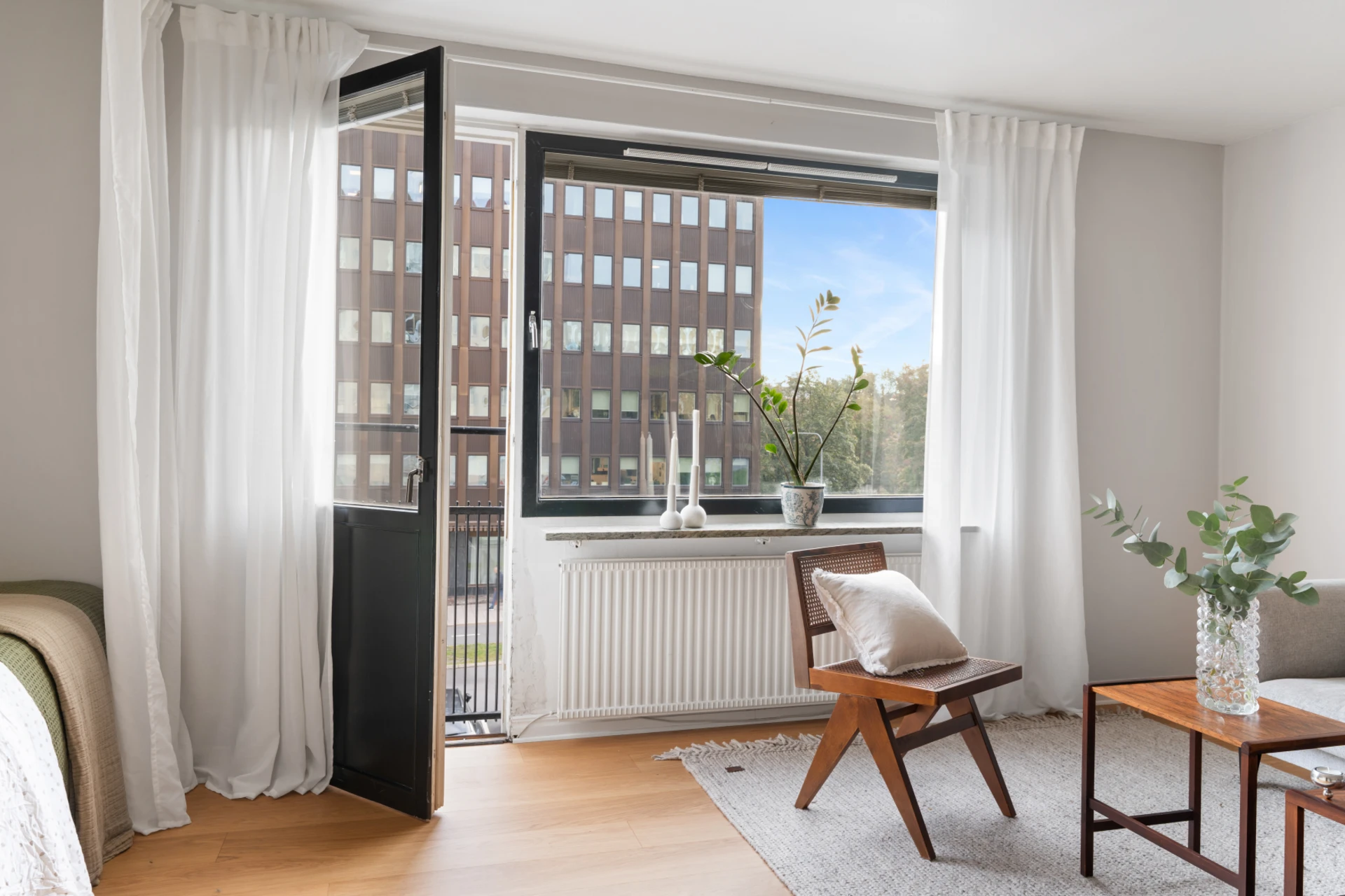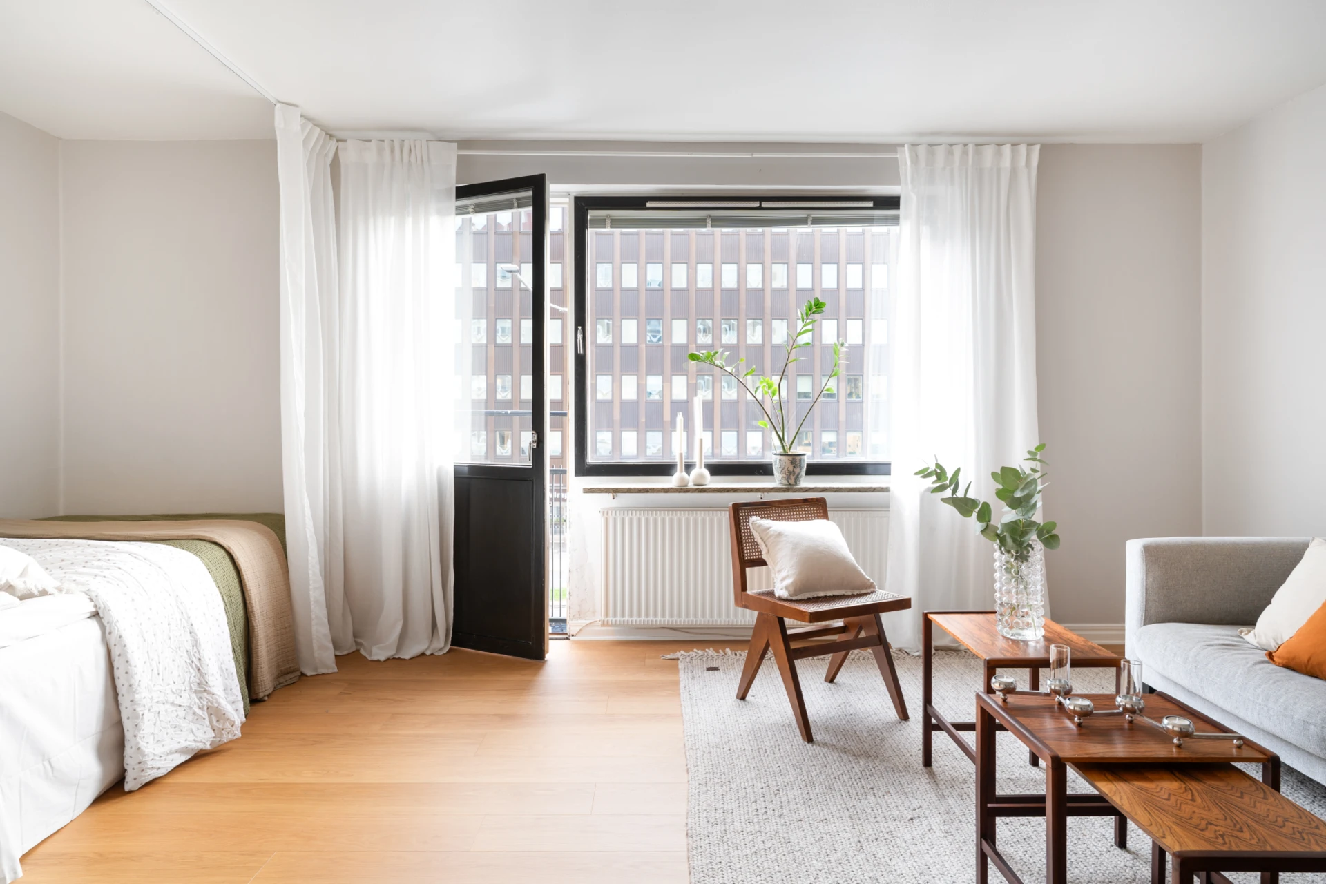 Ljust golv och ljusa väggar. Plats för soffa, soffbord, matgrupp samt annan önskad möblering. Sovalkov med plats för säng. Utgång till fransk balkong.