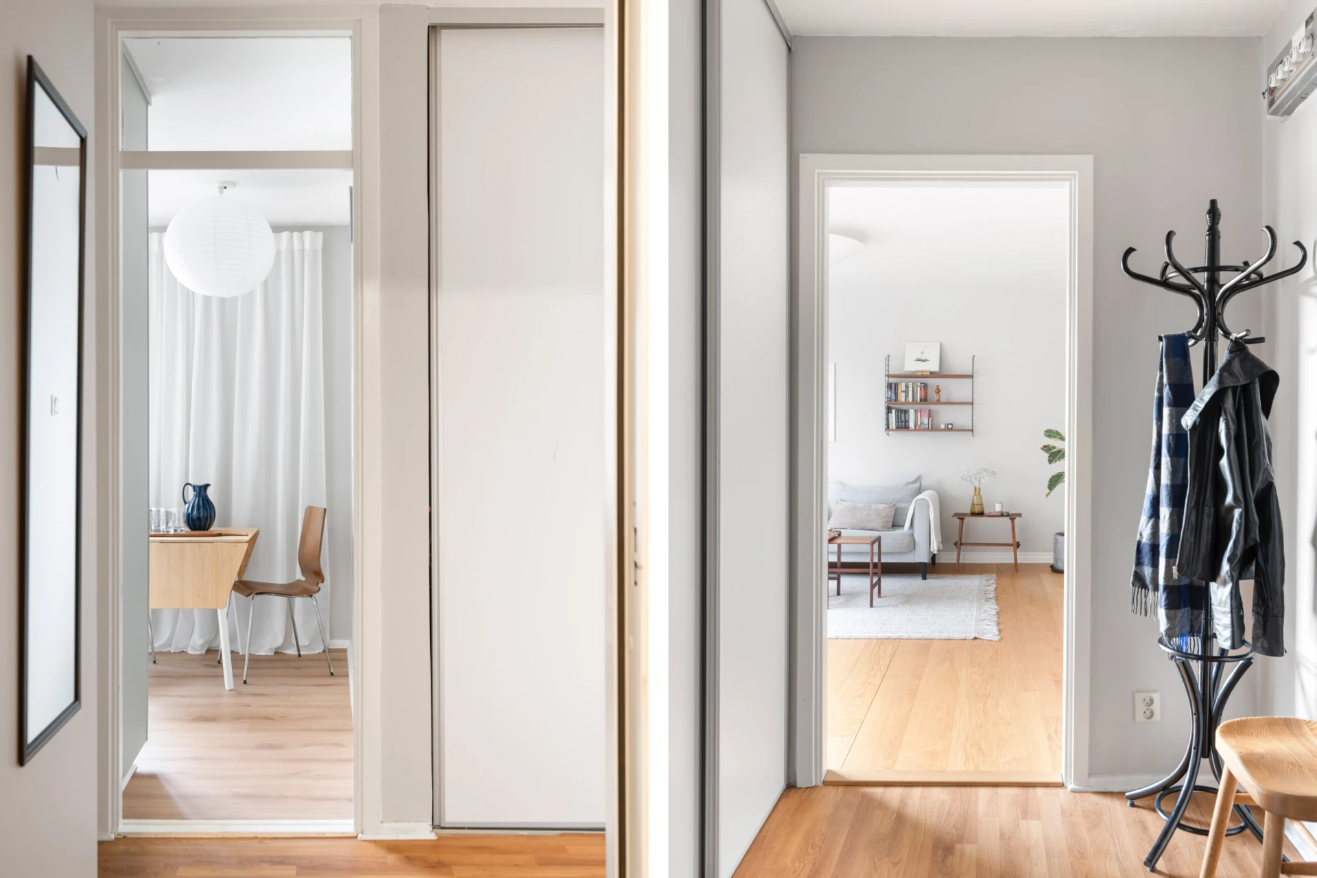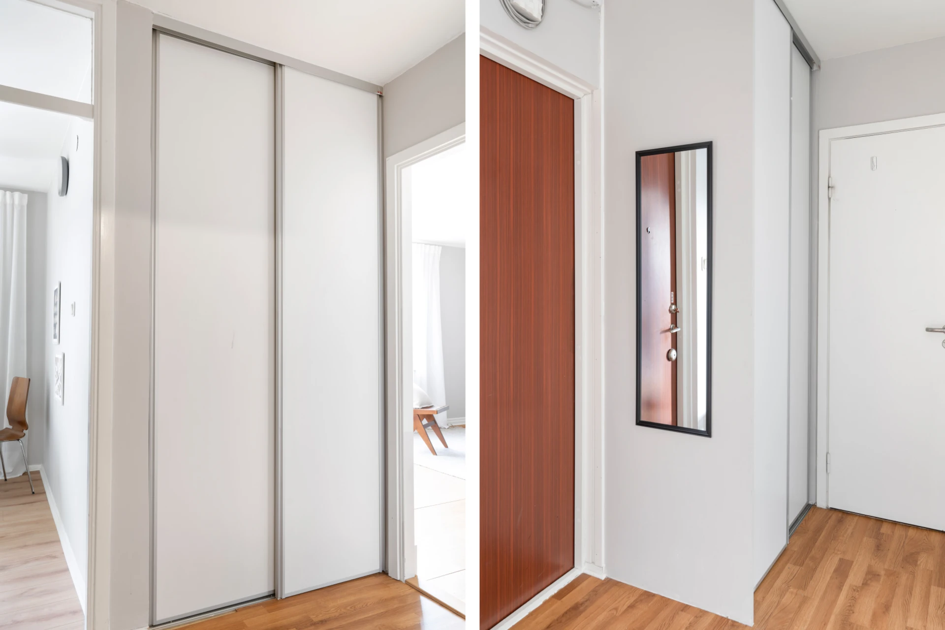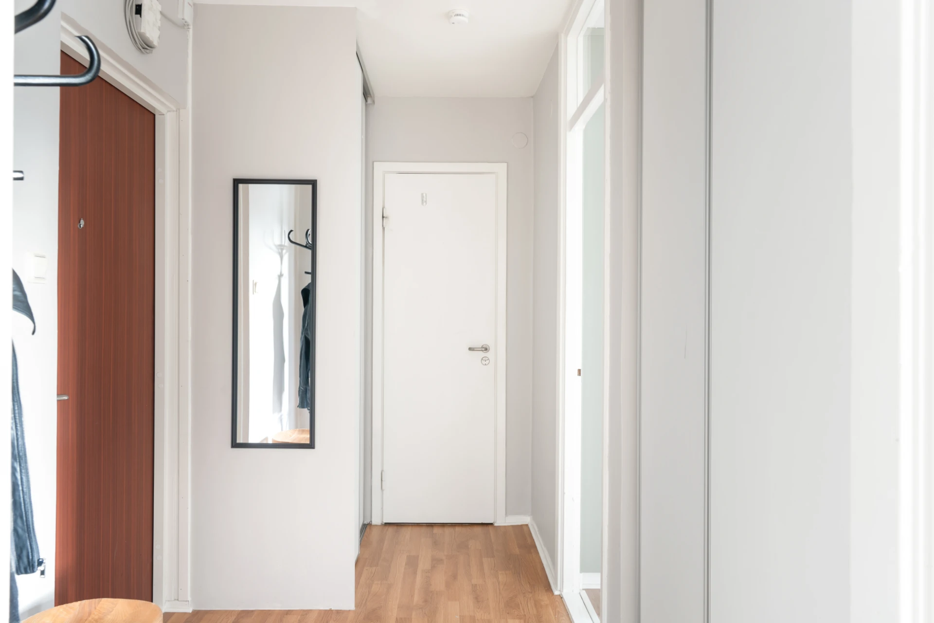 Ljust golv och ljusa väggar. Plats för avhängning. Garderober med skjutdörrar och god förvaring.