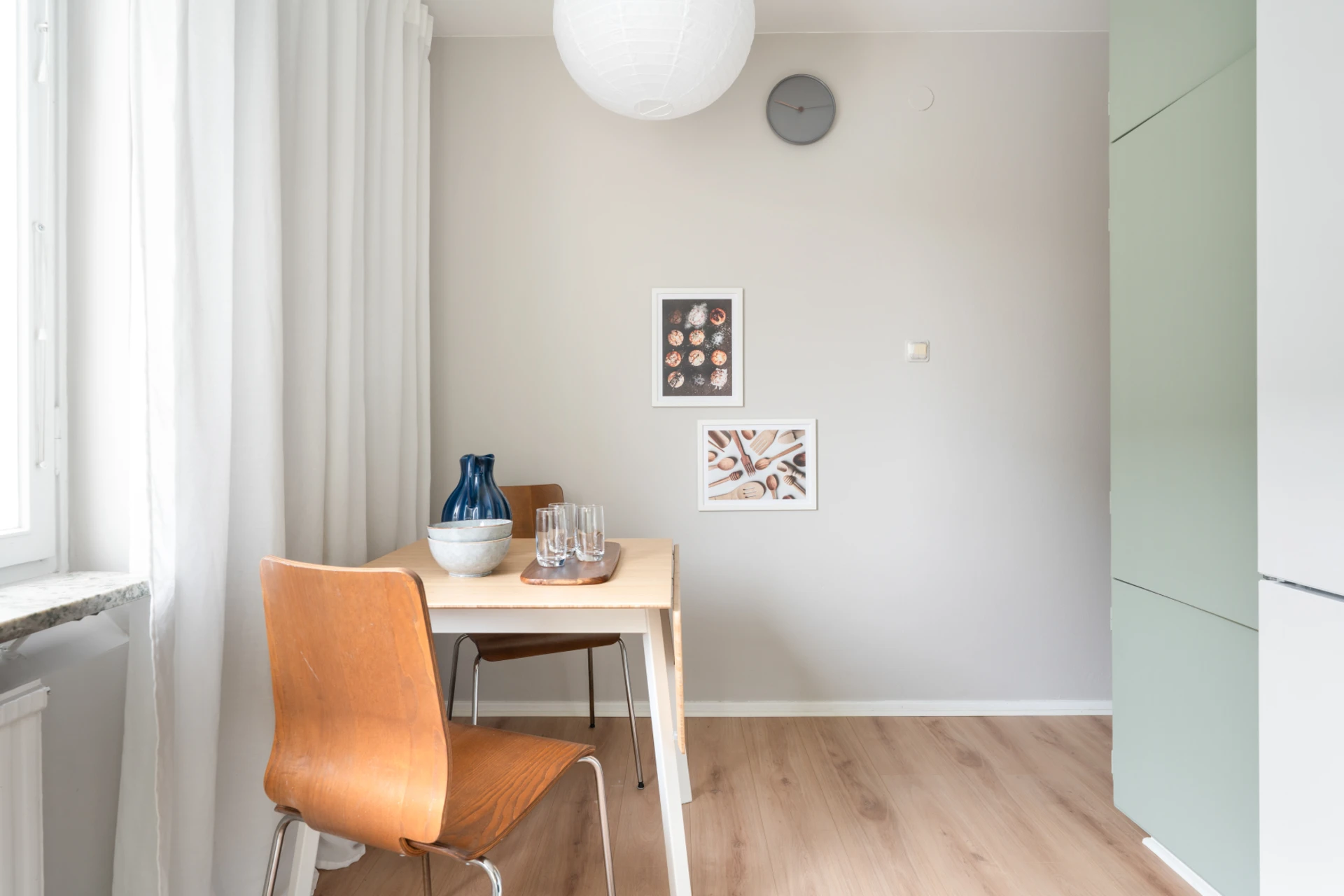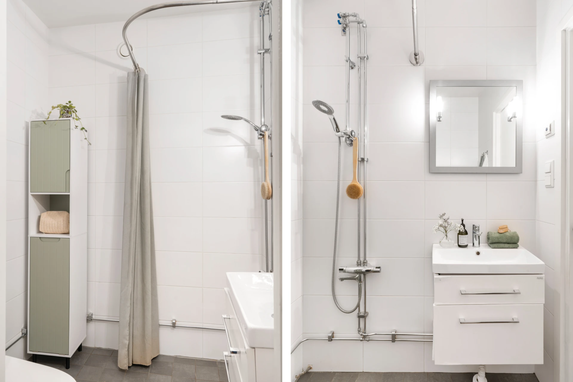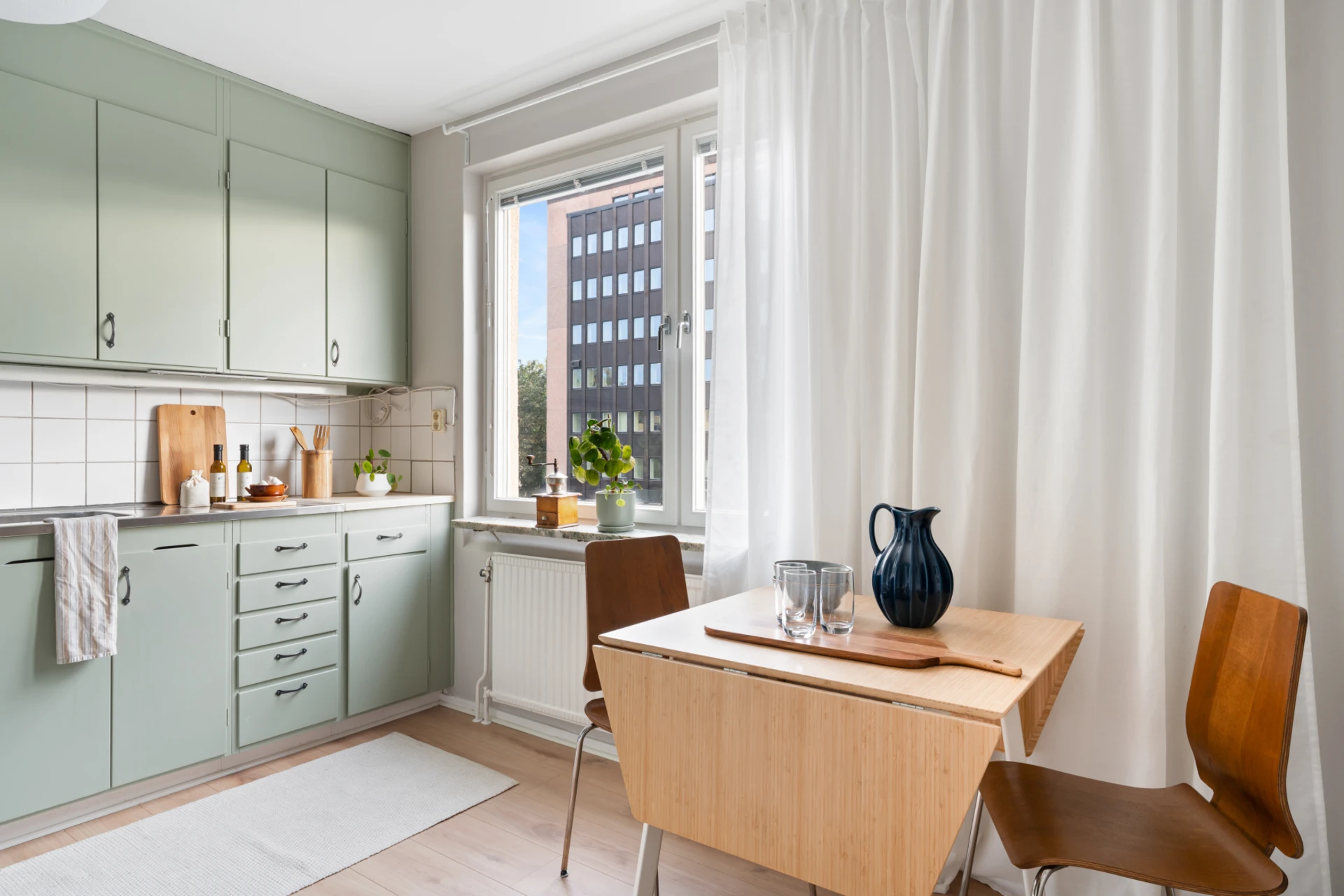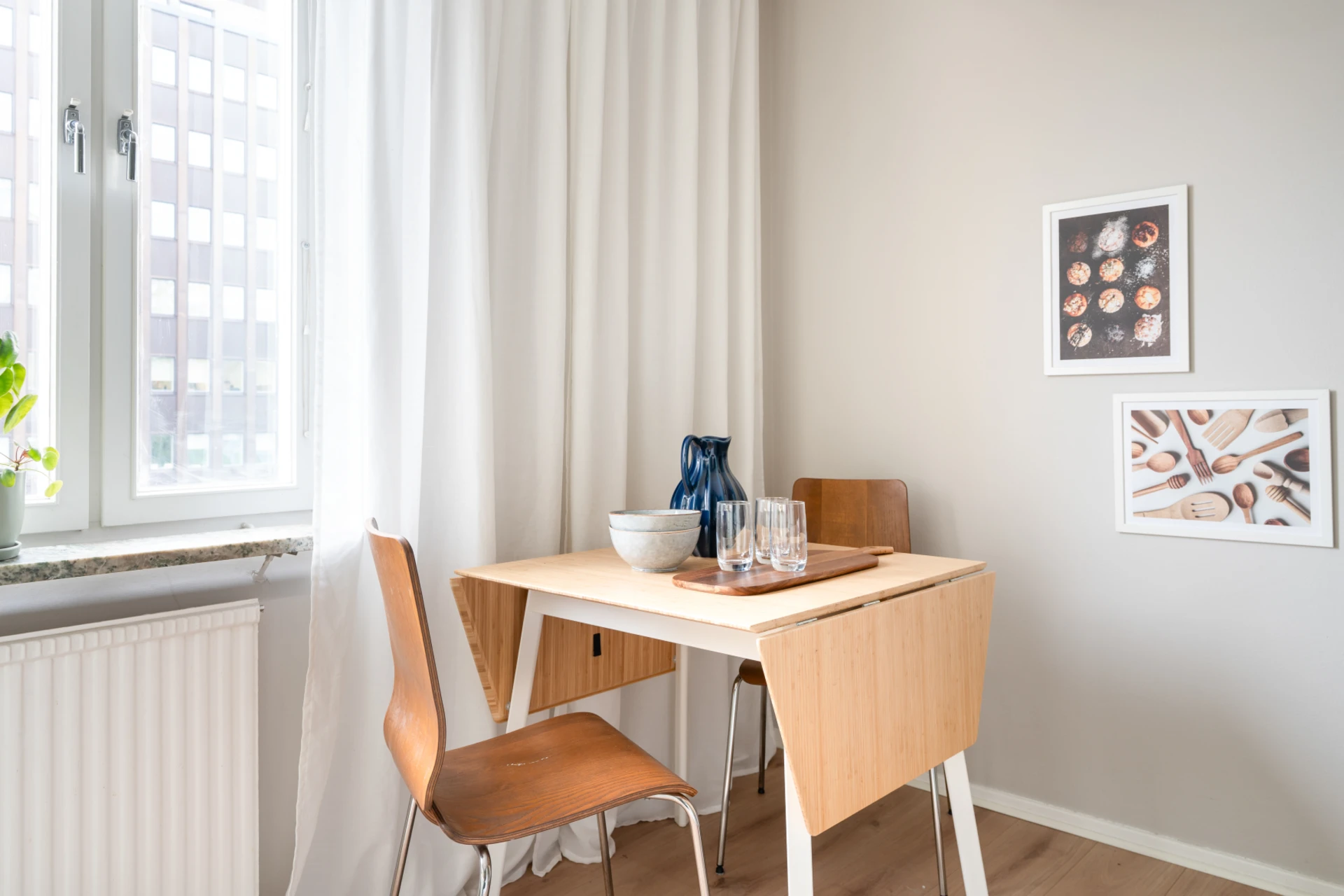 Planlösningen är genomtänkt och funktionell. Det separata köket ger plats för matlagning i lugn och ro, sovalkoven skapar en avskild känsla utan att kompromissa med rymd och ljus. Badrum är helkaklat och stambytt år 2014, hallen erbjuder yteffektiv avhängning samt ytterligare förvaringsmöjligheter.