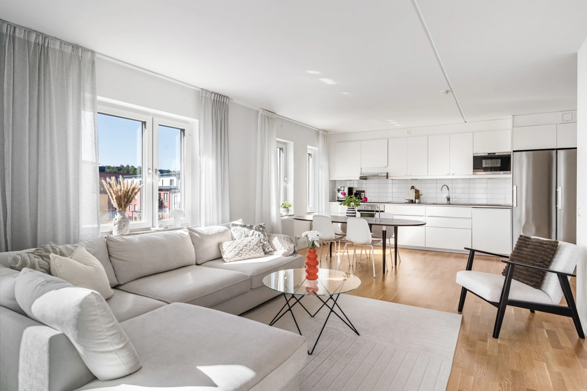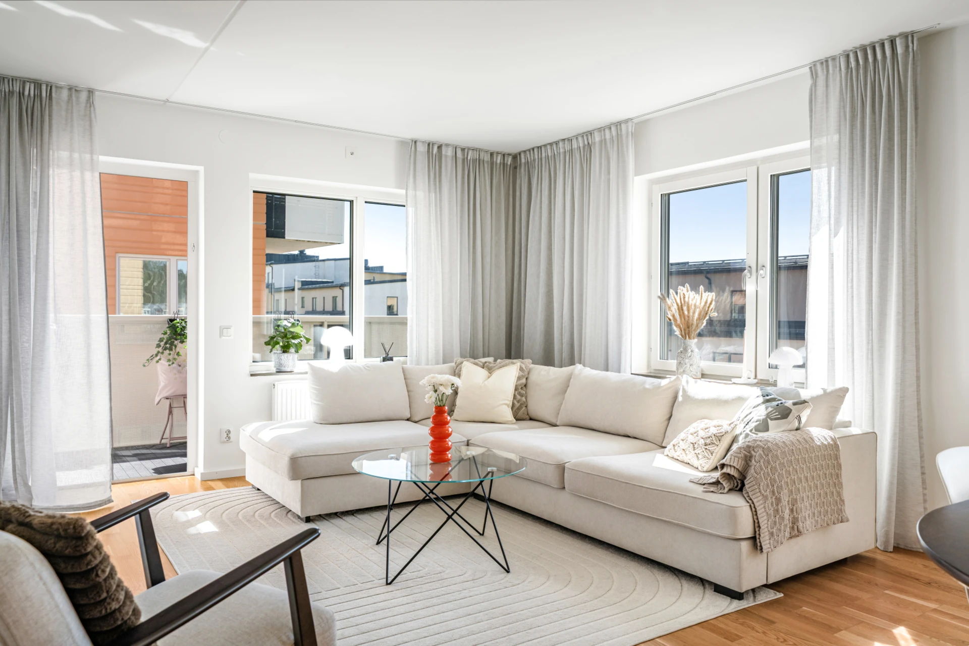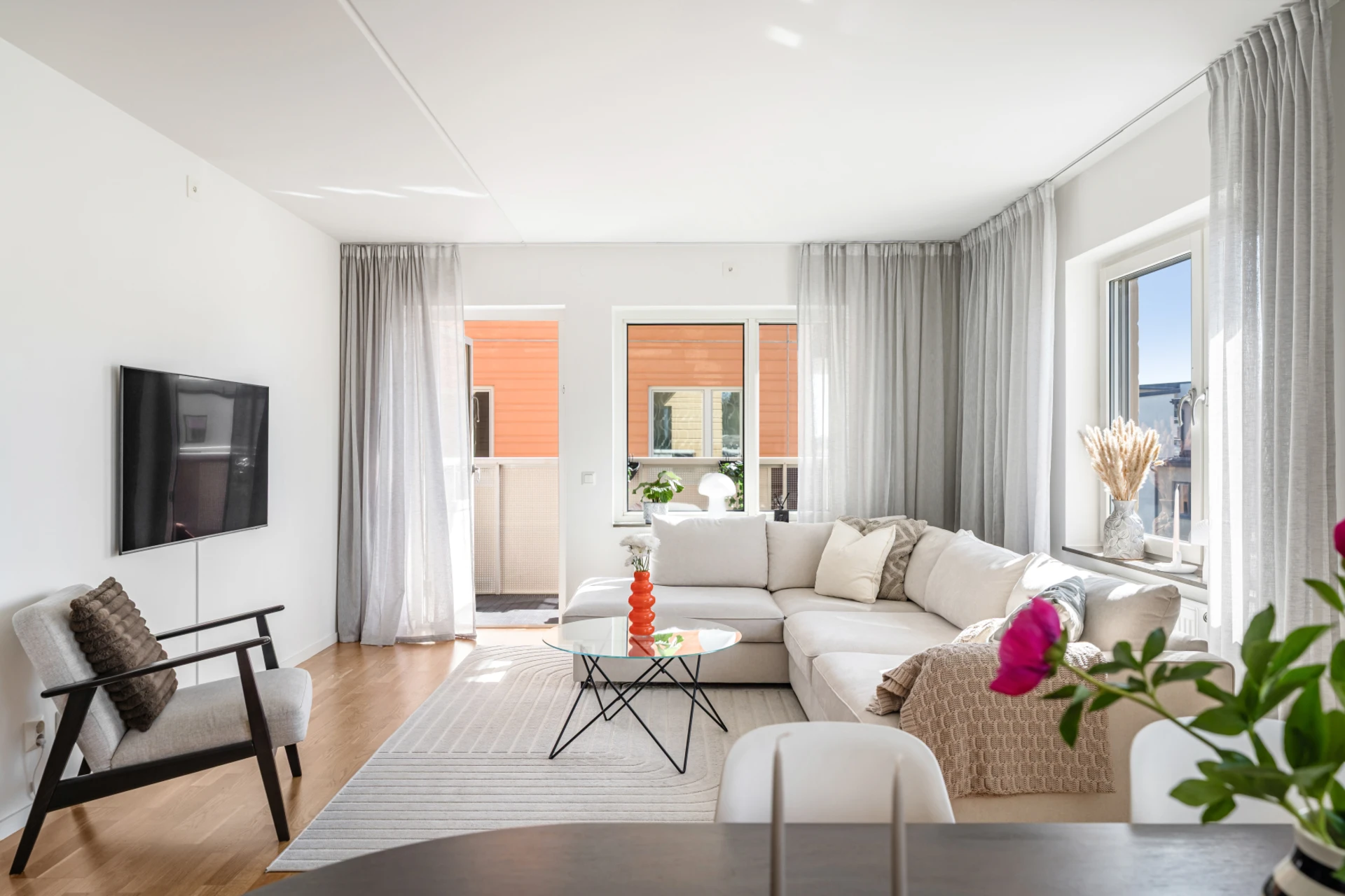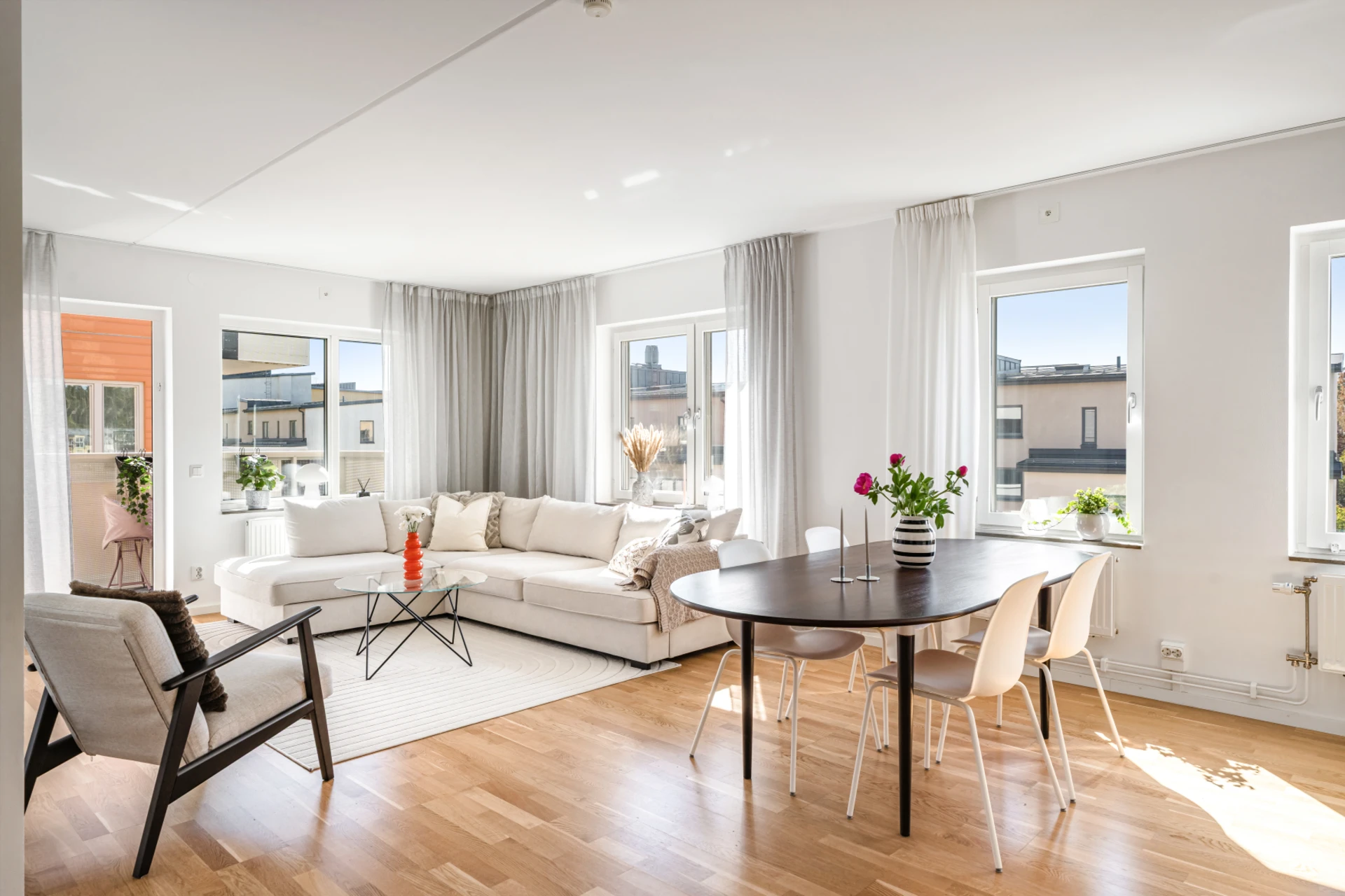Rymligt vardagsrum med ljust golv och ljusa väggar. Plats för soffa, soffbord samt annan önskad möblering. Härligt ljusinsläpp från två väderstreck och utgång till bostadens balkong.